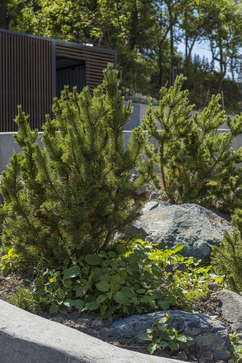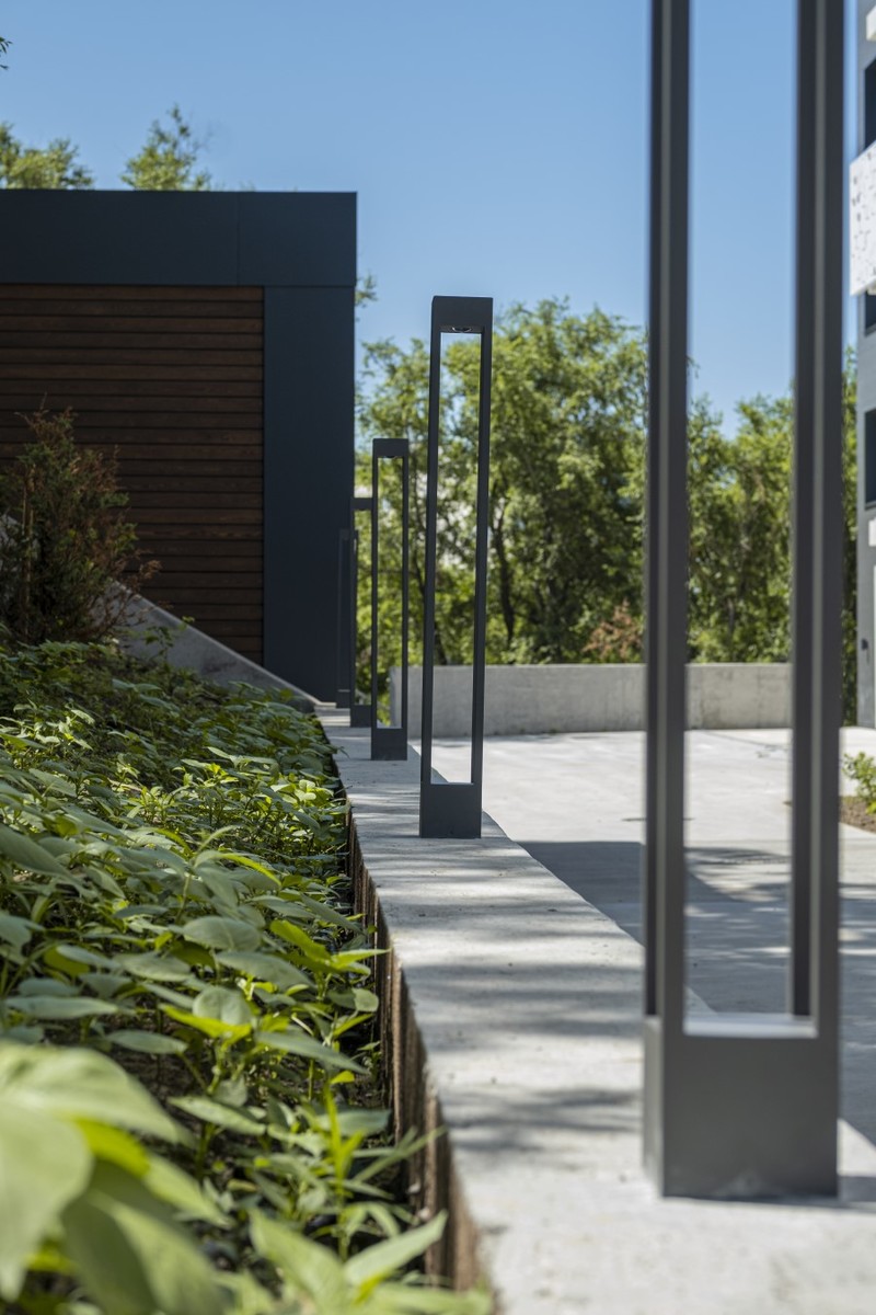 Придомовая территория закрыта для автомобилей. Для жильцов предусмотрен подземный отапливаемый паркинг с лифтами, а сам двор превращен в зеленый сад с хвойными и лиственными деревьями. На эксплуатируемой кровле оборудована детская площадка, рядом – обновлённый стадион с футбольным и баскетбольным полями, беговыми дорожками и зимним катком.