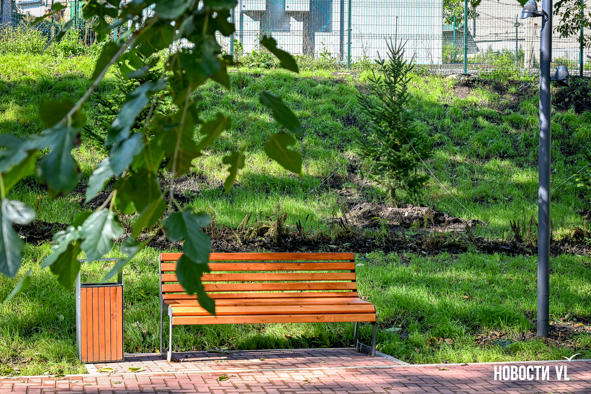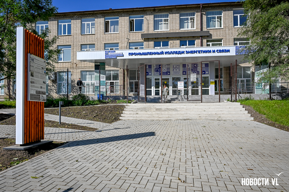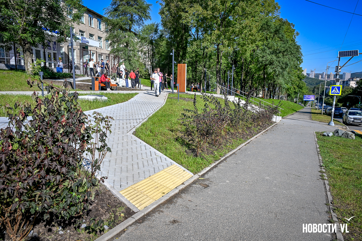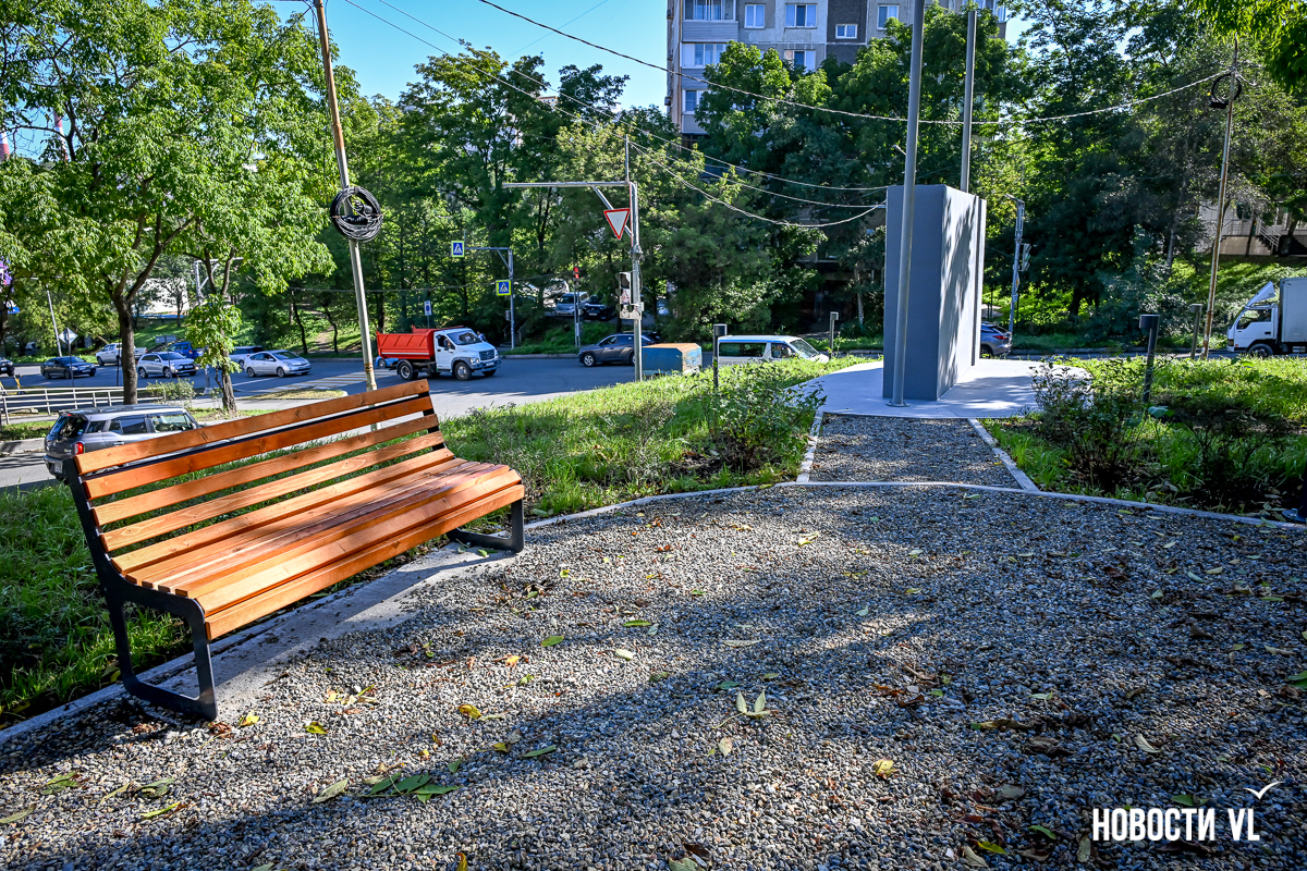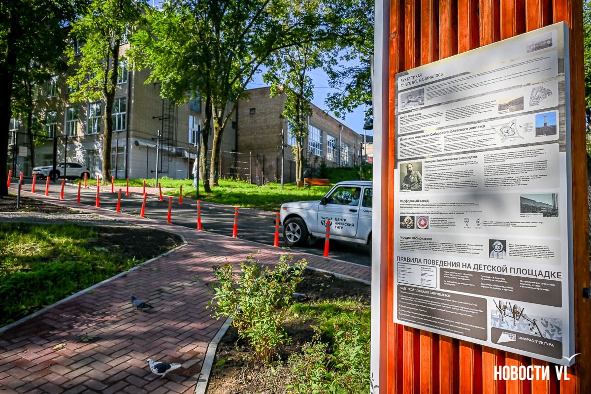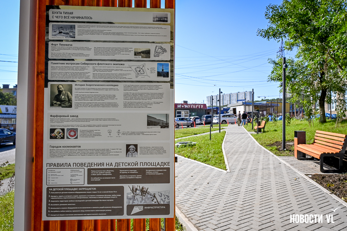 По сравнению с нашим прошлым визитом в середине августа территория сквера немного изменилась. На дорожках установили скамейки и урны, повесили две качели в середине зелёной зоны. На главном входе в колледж смонтировали стенд с историей района – на нём можно почитать про бухту Тихая и её освоение, форт Линевича, историю Энергетического колледжа, фарфоровый завод, «Городок космонавтов» – улицы этого района, названные в честь покорителей космоса.