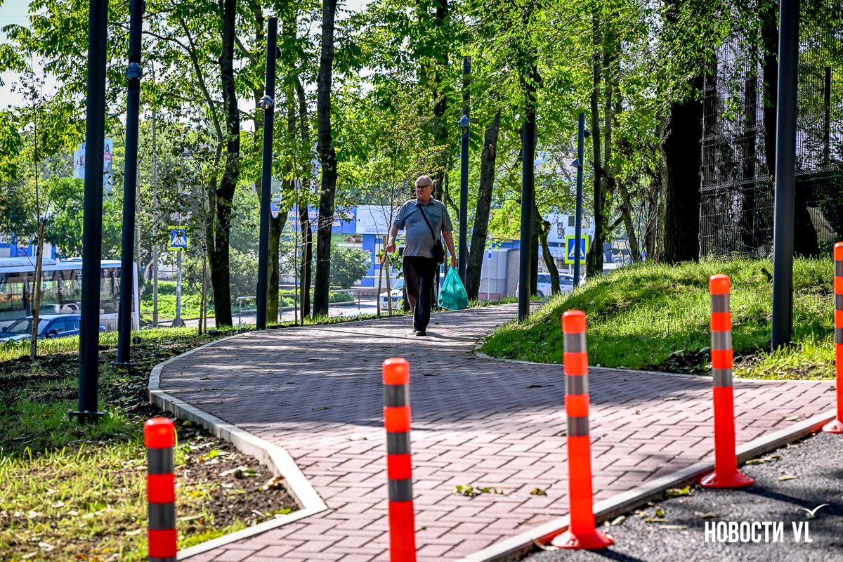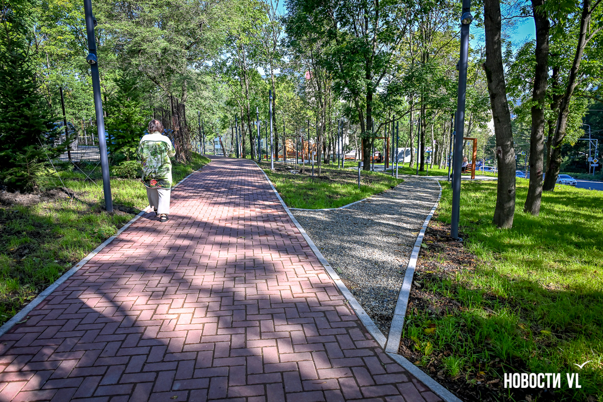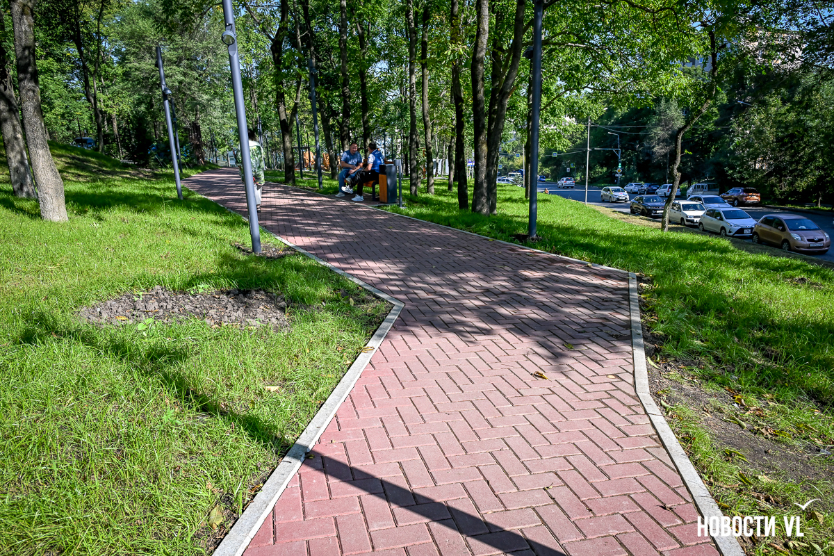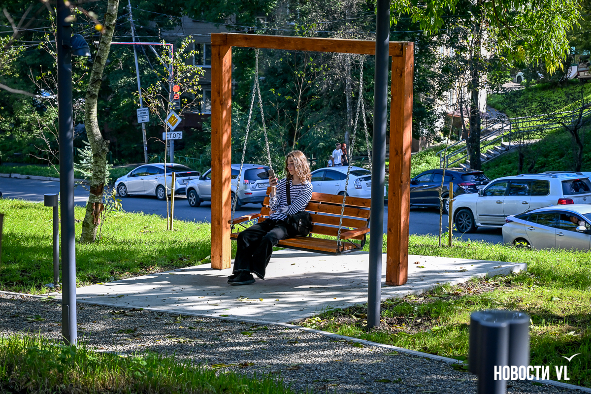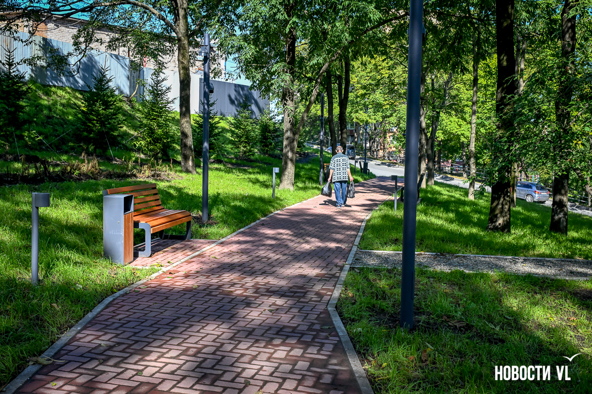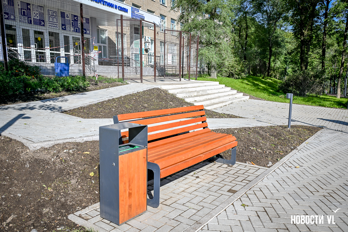 По сравнению с нашим прошлым визитом в середине августа территория сквера немного изменилась. На дорожках установили скамейки и урны, повесили две качели в середине зелёной зоны. На главном входе в колледж смонтировали стенд с историей района – на нём можно почитать про бухту Тихая и её освоение, форт Линевича, историю Энергетического колледжа, фарфоровый завод, «Городок космонавтов» – улицы этого района, названные в честь покорителей космоса.