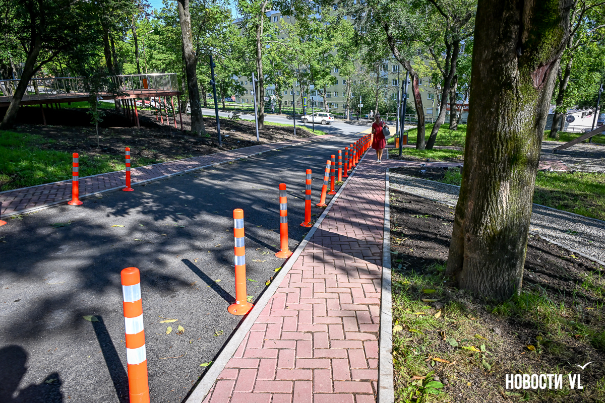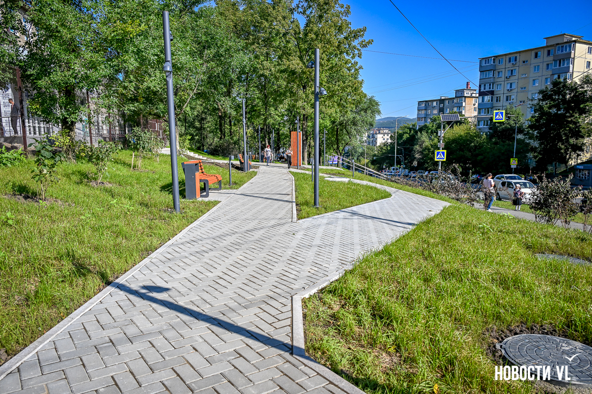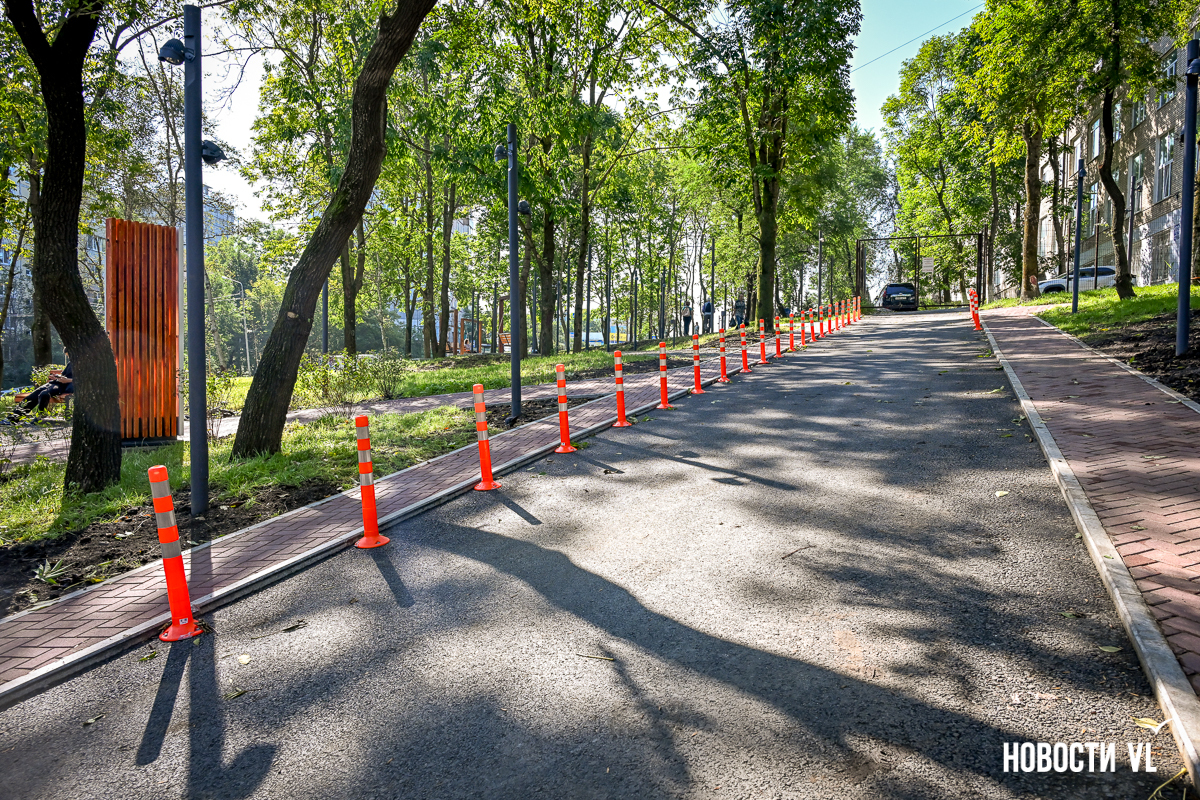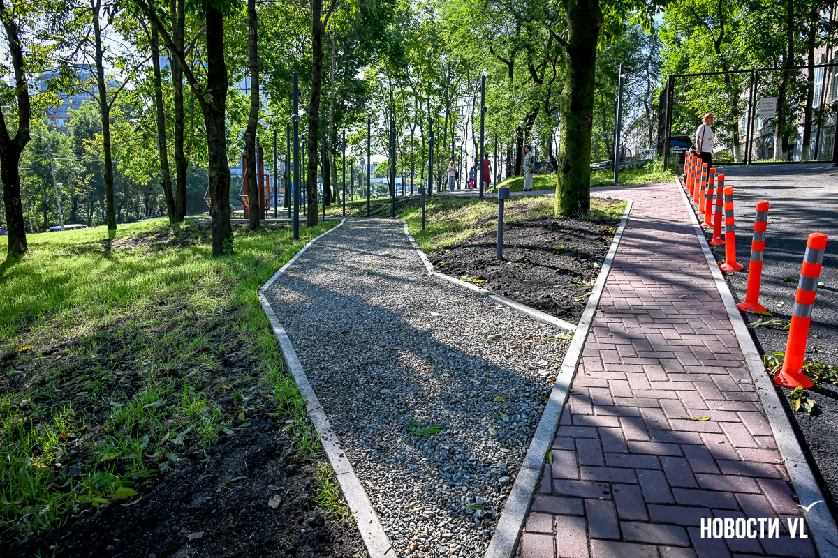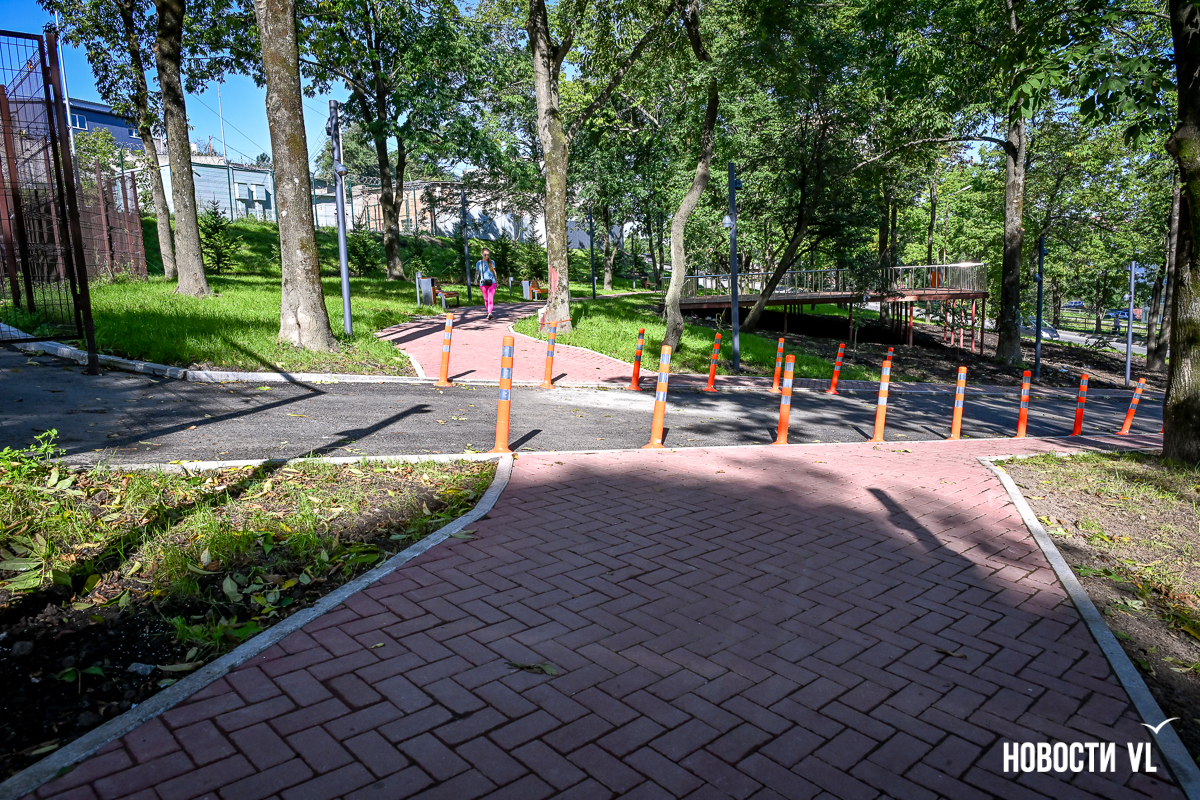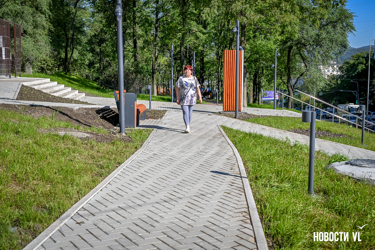 По сравнению с нашим прошлым визитом в середине августа территория сквера немного изменилась. На дорожках установили скамейки и урны, повесили две качели в середине зелёной зоны. На главном входе в колледж смонтировали стенд с историей района – на нём можно почитать про бухту Тихая и её освоение, форт Линевича, историю Энергетического колледжа, фарфоровый завод, «Городок космонавтов» – улицы этого района, названные в честь покорителей космоса.