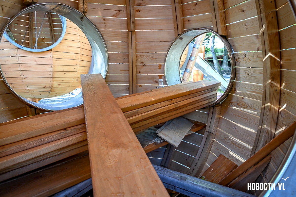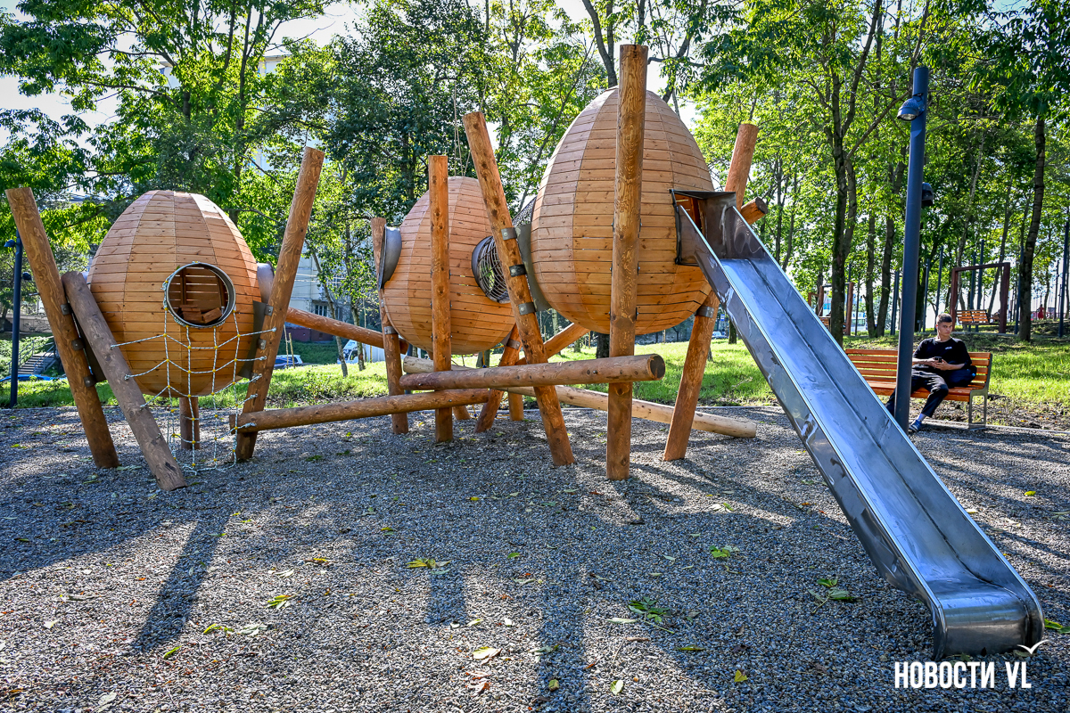 Появилась детская площадка – она выполнена в основном из дерева. Это три сферы с круглыми окнами, похожими на иллюминаторы, напоминающие космические корабли. Две из трёх сфер между собой соединены гофрой в сеточку, одна из конструкций – с железной горкой. Покрытие здесь галечное, что уже не понравилось одному из районных активистов – говорит, что небезопасно, и просит пол из резиновой крошки.