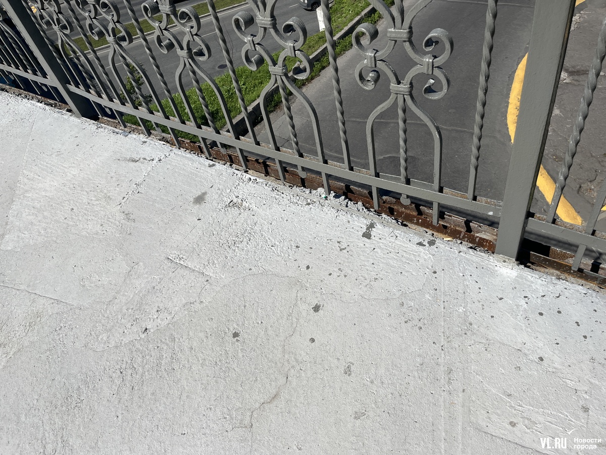 Новые ступени и сам надземный переход залили неровно, и каждая ямка хорошо ощущается через подошву обуви, особенно лёгкой летней. Стыки не замазаны, они выглядят как щели между плитами, а остатки бетона, который сгоняли из центральной части перехода, оставили кусками по краям. Выровнены они не везде – на одном из участков перехода часть покрытия и вовсе выпуклая.