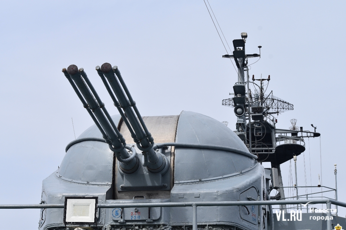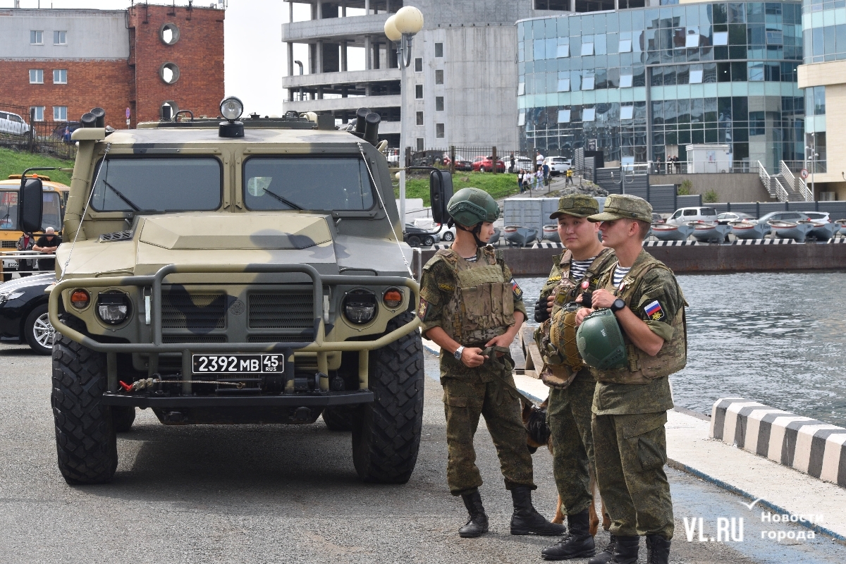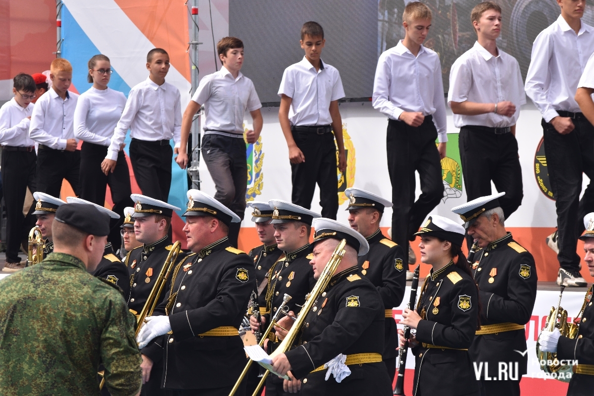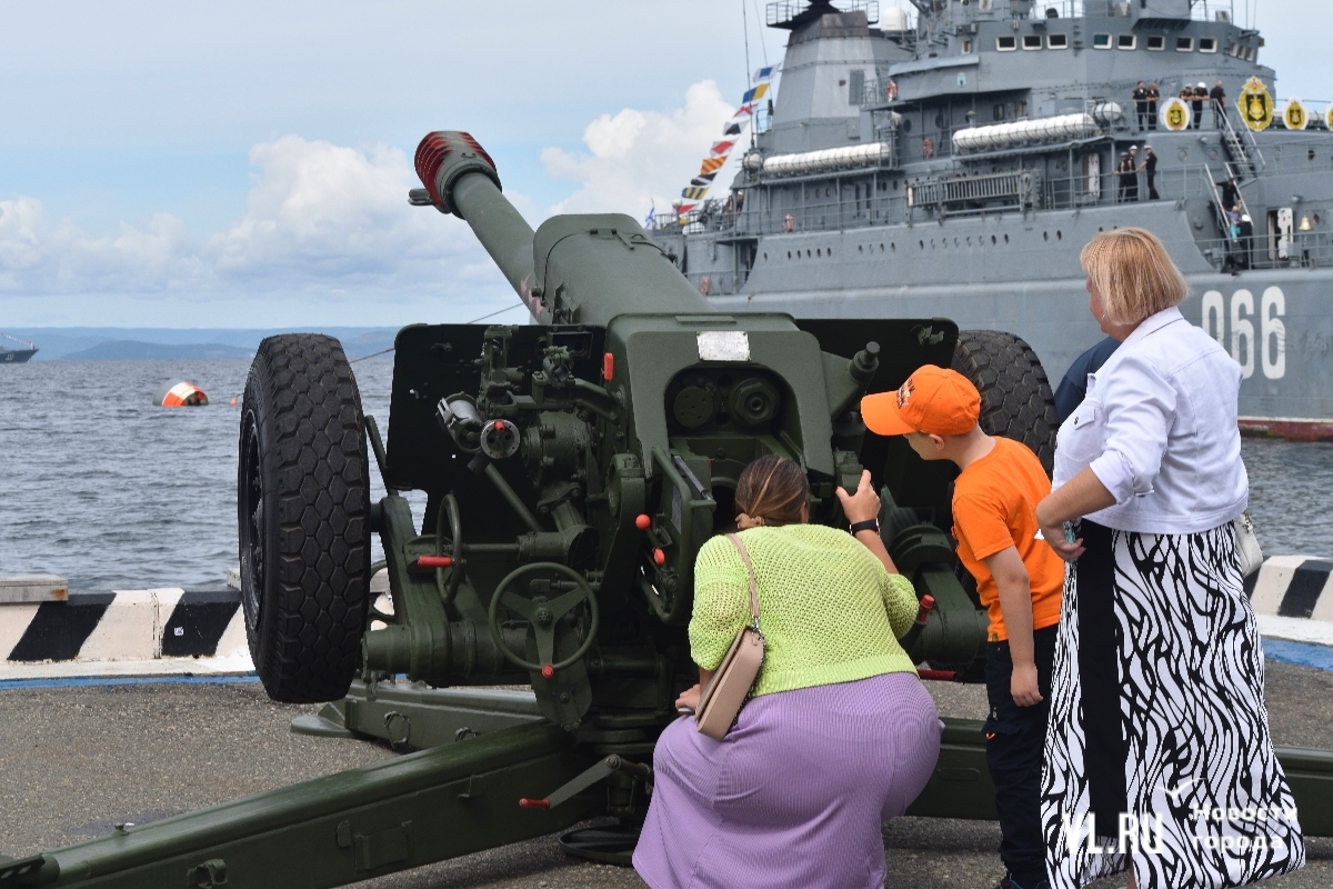 В центре набережной установили сцену. С трибун можно посмотреть выступления флотских артистов ансамбля песни и пляски, драматического театра и оркестра ТОФ, которые на ней проходят. Людей, которые ходили бы по павильонам или смотрели концерт, не так много. В основном жители и гости города задерживаются на площадке на несколько минут, а всё внимание собрал большой десантный корабль «Ослябя», пришвартованный к одному из пирсов водной станции с открытым лацпортом. В обычные дни по нему передвигаются солдаты и техника, а сейчас ходят гражданские – военный корабль временно стал музеем.