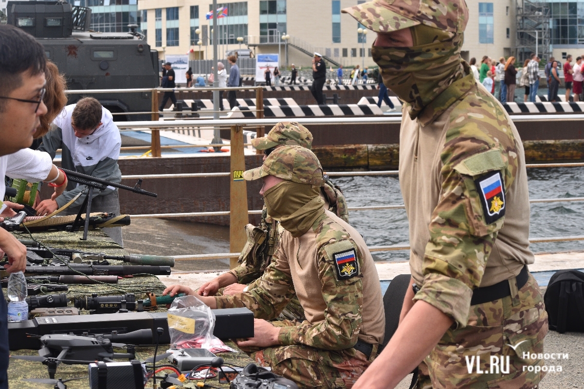 Активностей и стендов на водно-спортивной станции ТОФ не очень много. Вдоль пирсов стоит военная техника, а рядом с ними на столах выложена амуниция военных водолазов. И если гидрокостюм и специальные маски с кислородными баллонами ещё можно найти в магазинах, то вживую увидеть телефонную станцию, которая используется под водой, удаётся не каждый день. Как и оружие, которое используется для морских боевых действий. На столе рядом лежат автомат, работающий под водой, и противодиверсионный гранатомёт. И тот, и другой были сконструированы ещё в советские времена.
