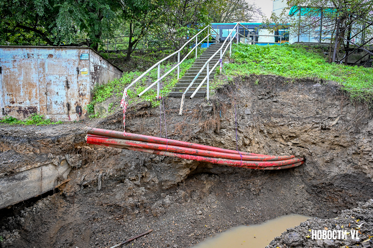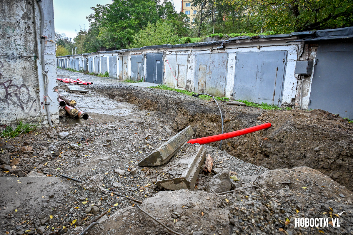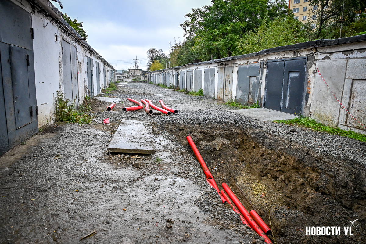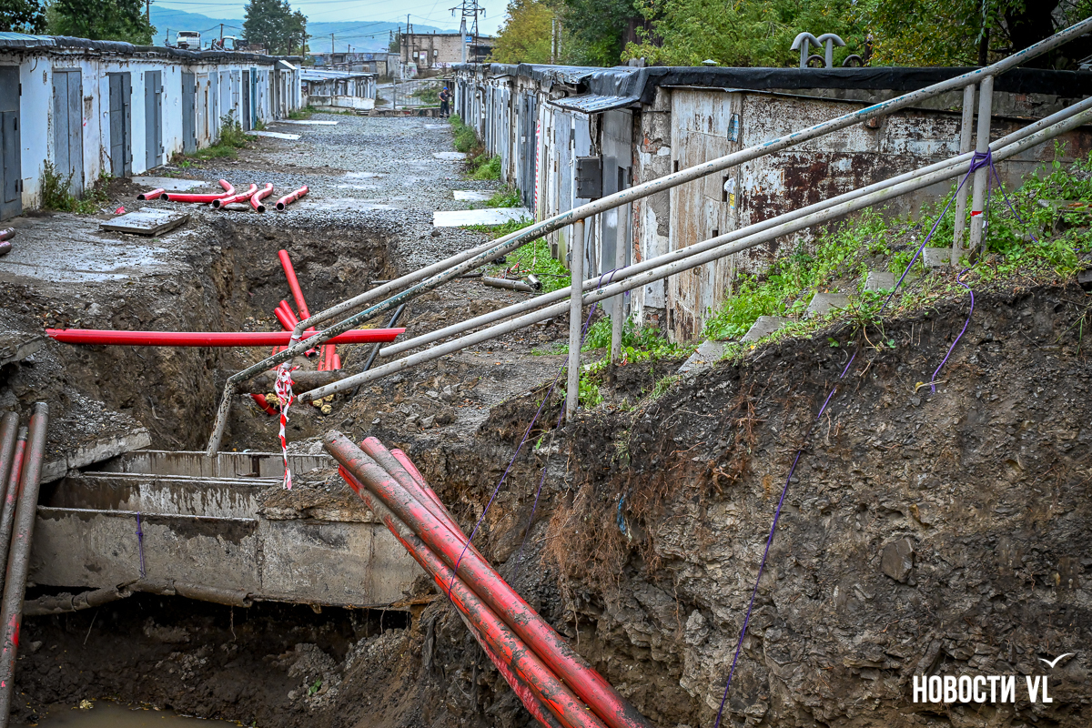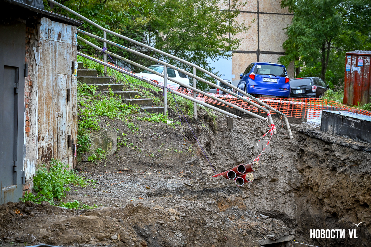 Гаражный кооператив «Восход» рядом с домом № 55 на Сахалинской во Владивостоке снова в осаде. Здесь почти два года тянут высоковольтный кабель в рамках реконструкции линии электропередачи 110 кВ «Владивостокская ТЭЦ-2 – Голдобин». В апреле тут уже полностью перекрывали проезд – из-за огромной ямы выбраться было невозможно. Сейчас история повторилась, всё снова перерыто. К тому же лестница, по которой люди идут к остановке и в поликлинику, теперь висит в воздухе – приходится шагать по проезжей части. Рабочих на объекте, по словам местных жителей, который день нет, а техника стоит без дела.