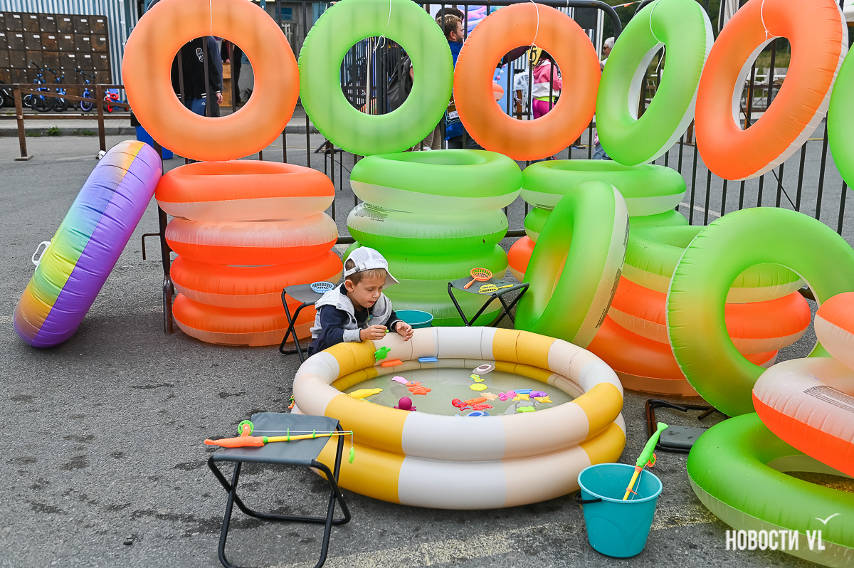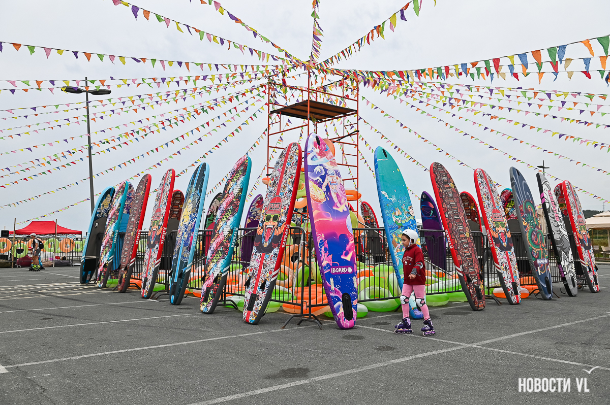 Само поле для катания напоминает новогодний каток на центральной площади Владивостока. Только вместо зимних украшений по центру выставили сапы, закидали цветными надувными кругами и натянули ленты с красочными флажками.