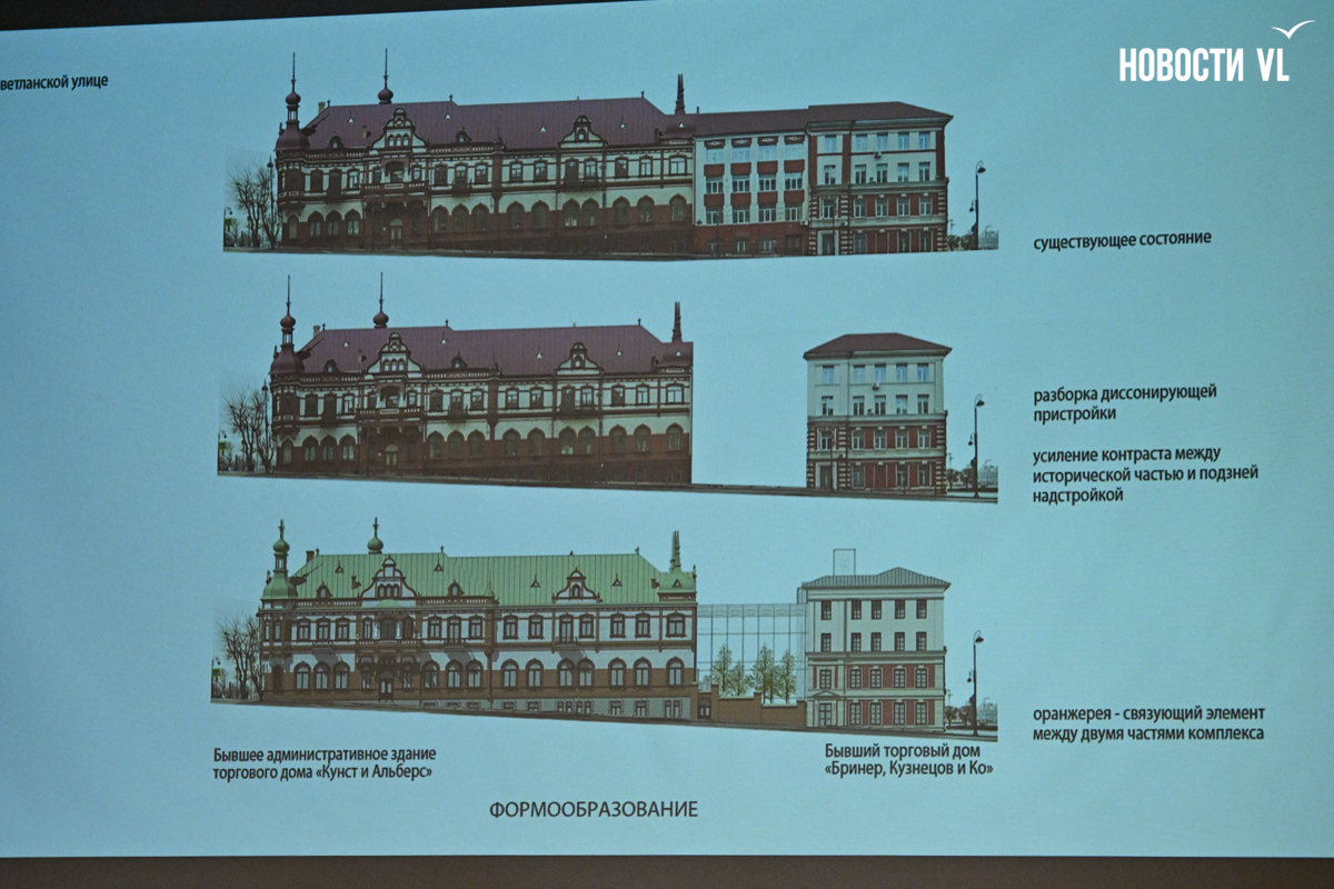 Примечательно, что подобный вопрос – маскировать ли более поздние советские надстройки под основной стиль дореволюционных зданий или, наоборот, подчёркивать разницу старого и нового, недавно уже обсуждался. В мае собственник комплекса зданий бывшего лицея № 38 ВГУЭС (Алеутская, 29 и 31), пустовавшего более 15 лет, представил проект реставрации на архитектурный совет и получил одобрение экспертного сообщества. Многим читателям Новостей VL.ru новый облик здания не пришёлся по душе. Позже наше издание дало подробно высказаться авторам проекта реконструкции, которые объясняли своё видение. Если вкратце, они как раз выступали с той же позиции, что и питерские архитекторы, – «Новодел под старину – плохая идея».