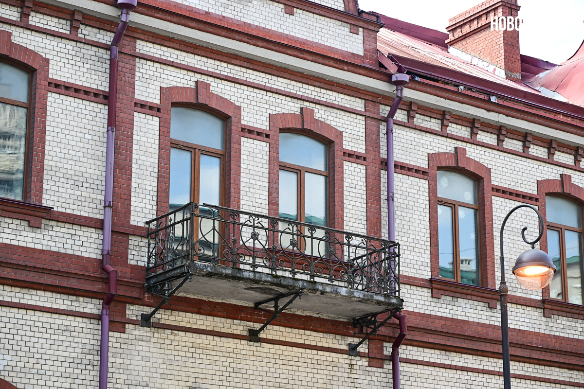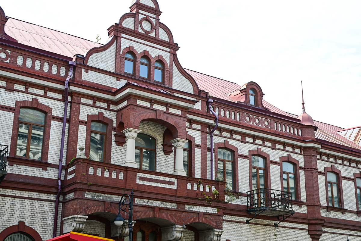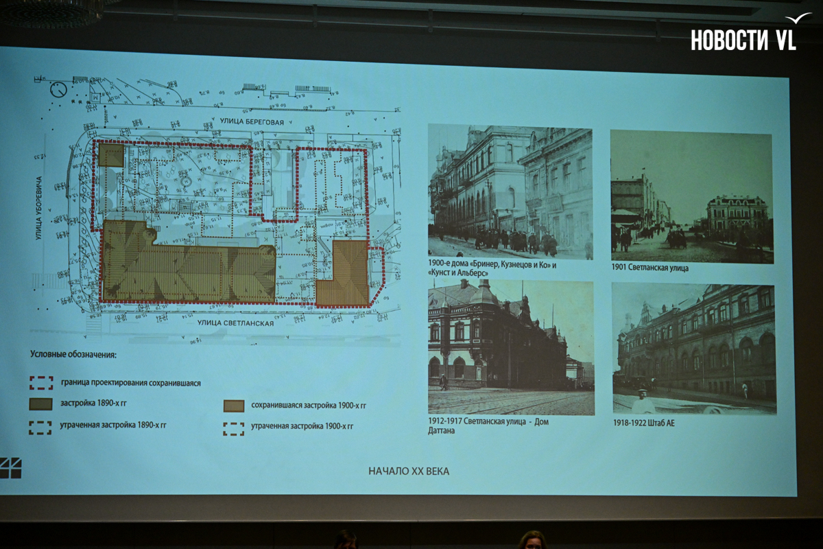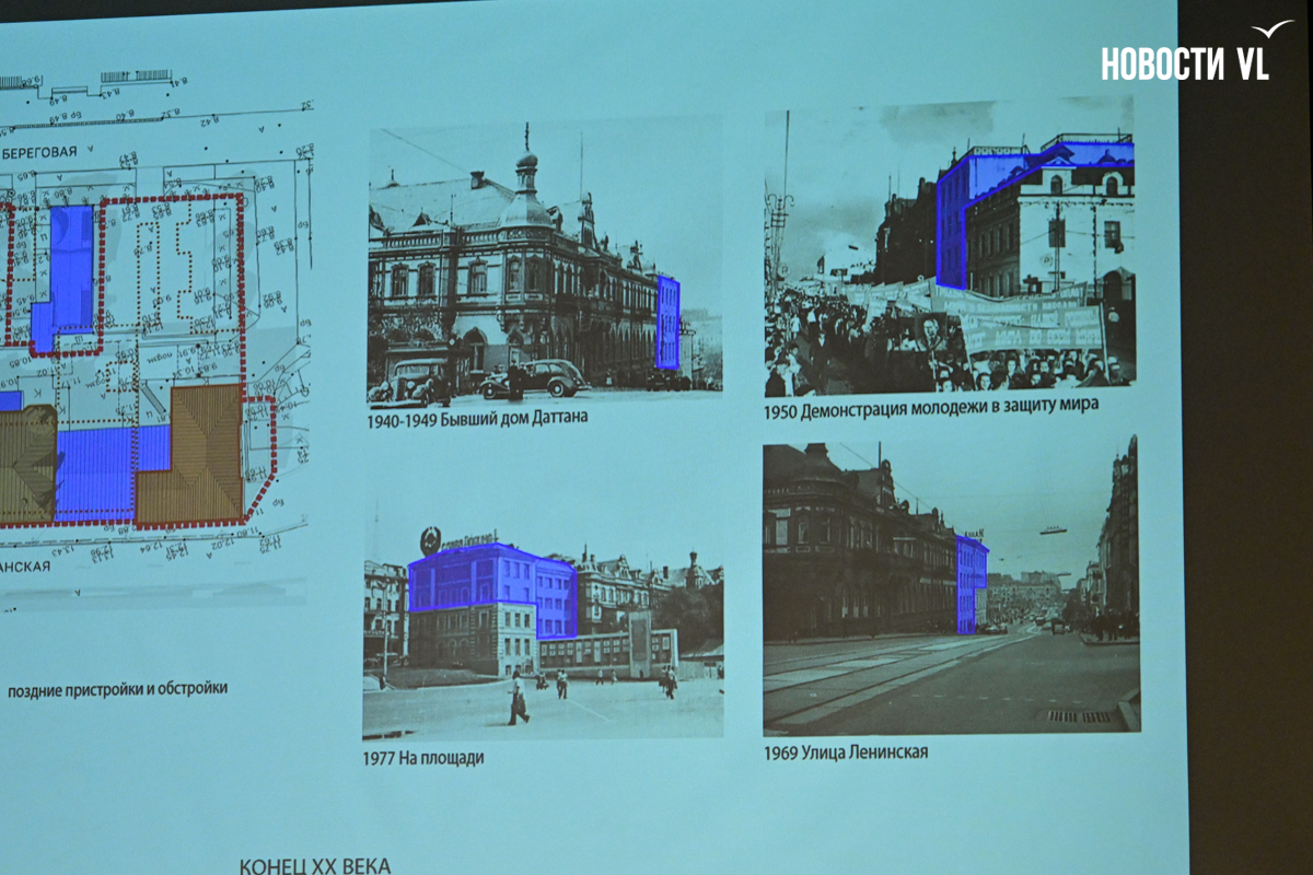 «Студия 44» заказывала исторические изыскания, нашла редкие снимки и смогла восстановить хронологию строительства. Изначально капитальных строений (без учёта утраченных пристроек во внутреннем дворе) было два. Первое сейчас находится рядом со стелой «Город воинской славы», это бывшее здание торгового дома «Бриннер, Кузнецов и Ко», его возвели в 1896 году. Второе, большего размера, – на Светланской и пересечении с улицей Береговой – бывшее административное здание торгового дома «Кунст и Альберс», датированное 1902 годом.