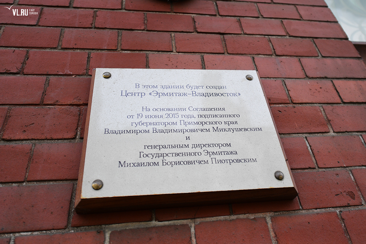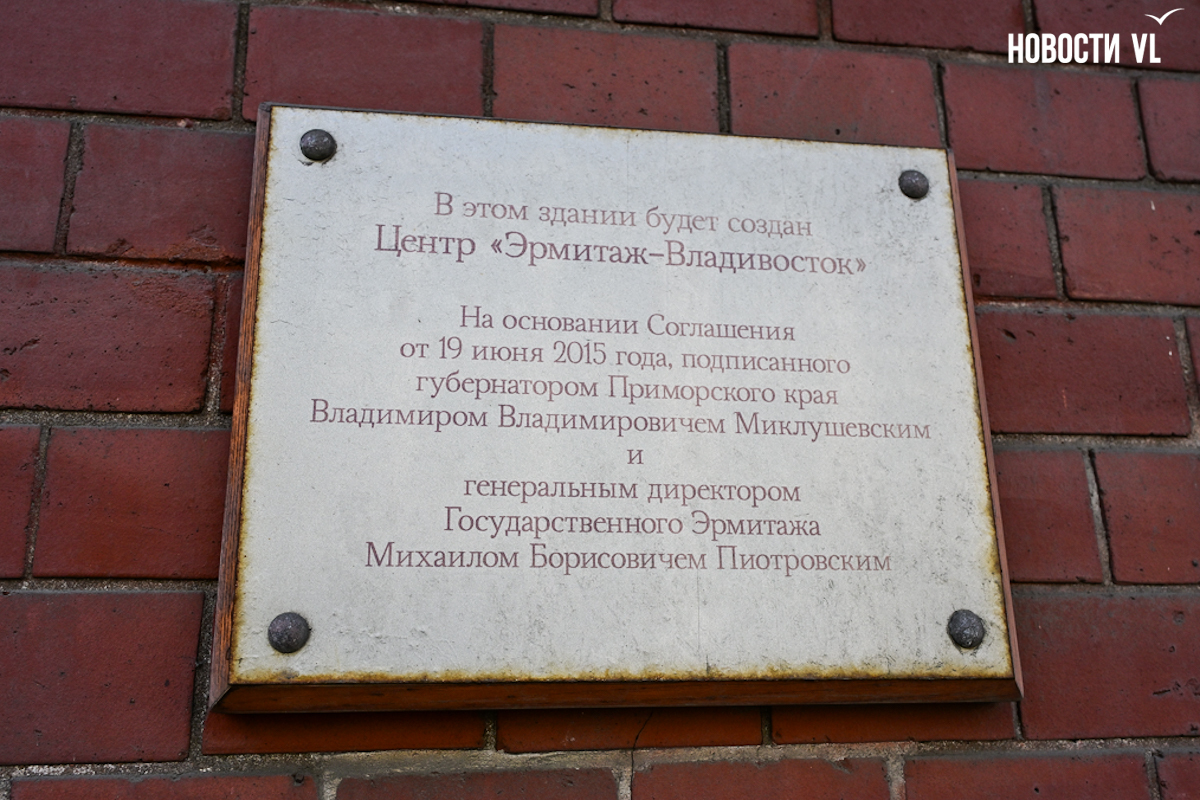 Напомним, впервые открыть филиал Эрмитажа во Владивостоке предложили ещё при экс-губернаторе Приморья Владимире Миклушевском в 2013 году, а в 2015-м на ПМЭФ он подписал соглашение с директором музея Михаилом Пиотровским. И уже тогда назывался адрес: Светланская, 38/40. На фасаде этого здания даже появилась соответствующая табличка.