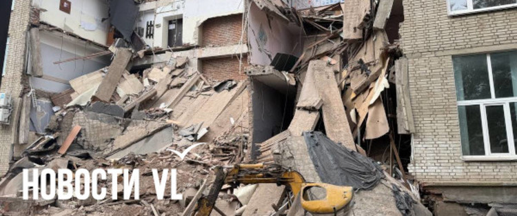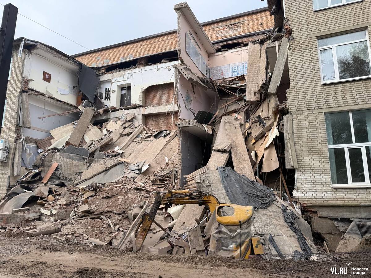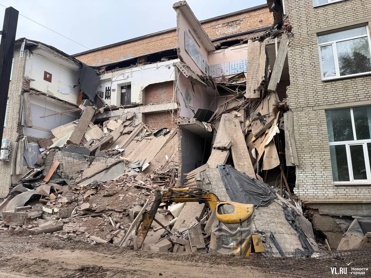 09:08: Корреспондент Новостей VL с места сообщает, что под стенами здания шли ремонтные работы, судя по всему, на коммуникациях, в связи с ними вплотную к ним прорыта траншея. Под завалом оказался экскаватор, который занимался земельными работами.