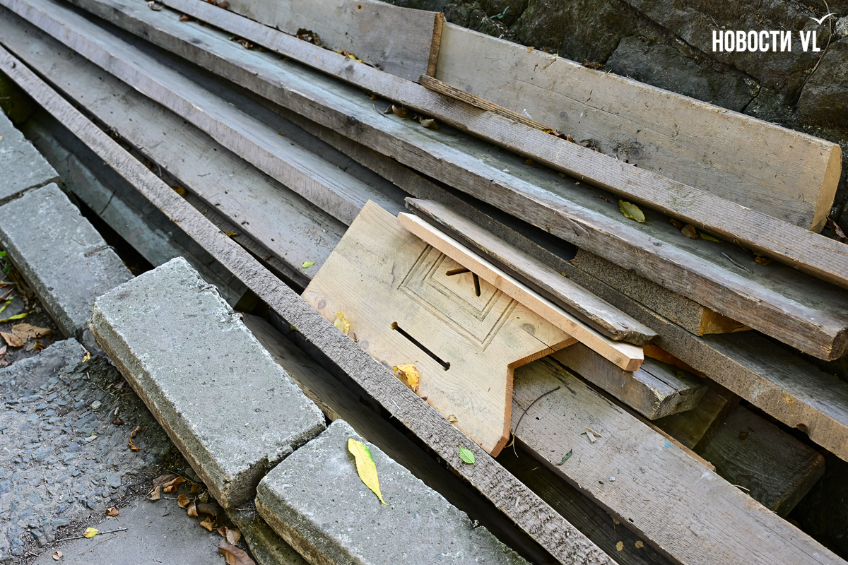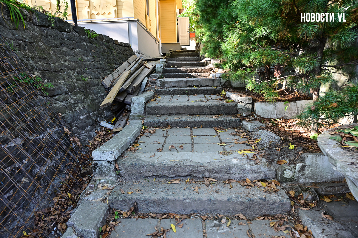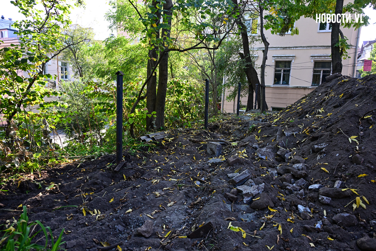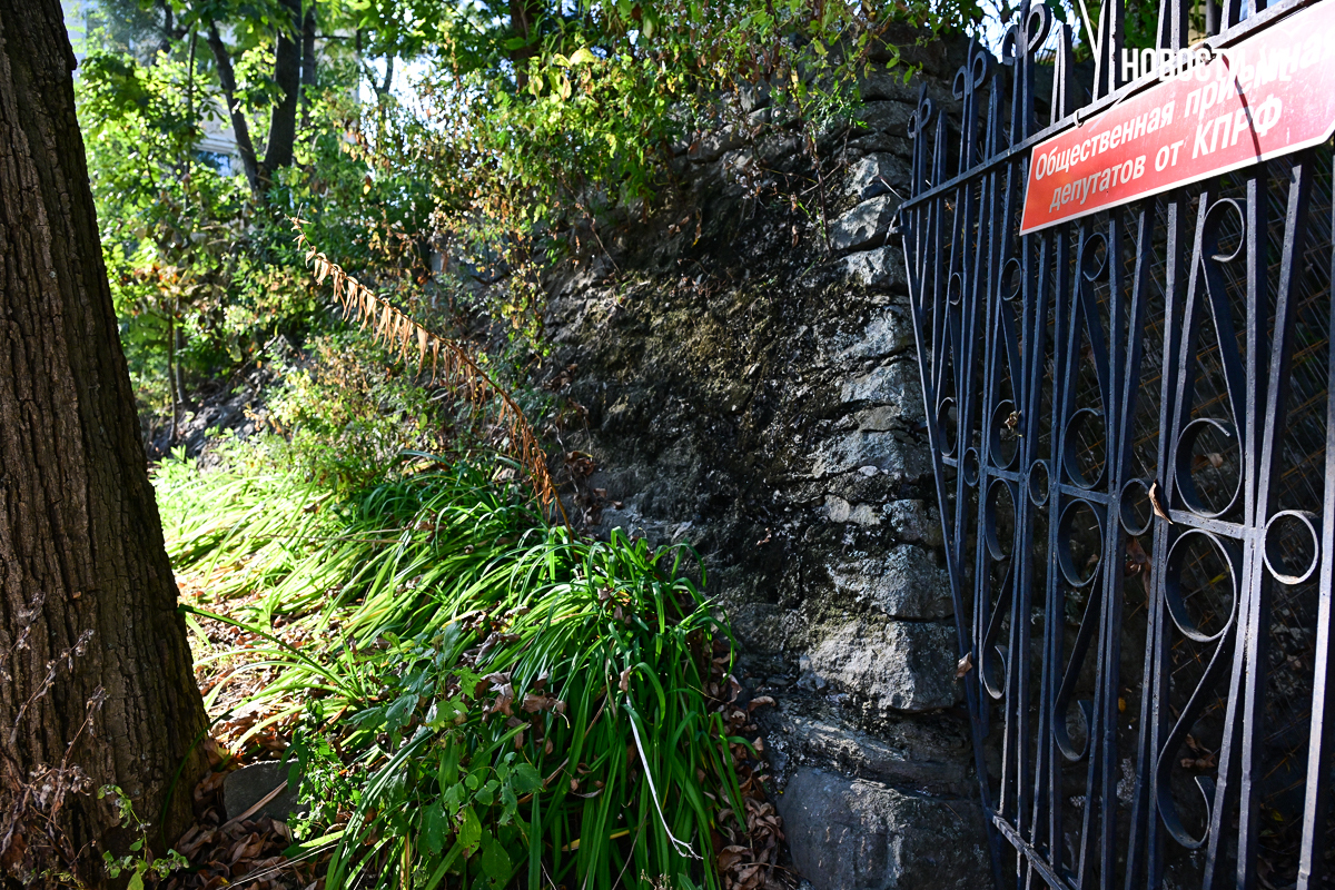 Старый дом стоит на пригорке – к нему поднимаются по бетонной лестнице. Её в ближайшее время заменят. Вообще, двор только начинают обустраивать, а закончат в ноябре. Работать будут в рамках программы по благоустройству. Вместо демонтированного забора поставят новый, приведут в порядок памятную деревянную табличку, отреставрируют и отчистят каменную подпорную стенку и обустроят небольшой сквер.