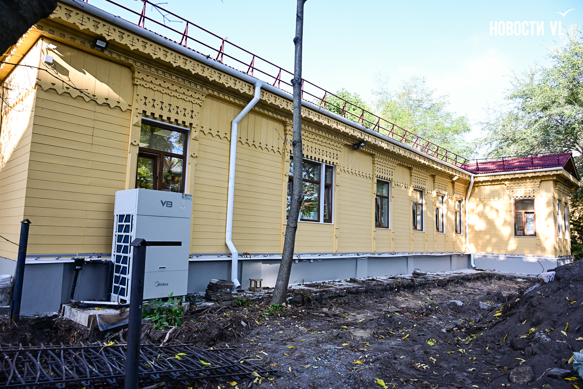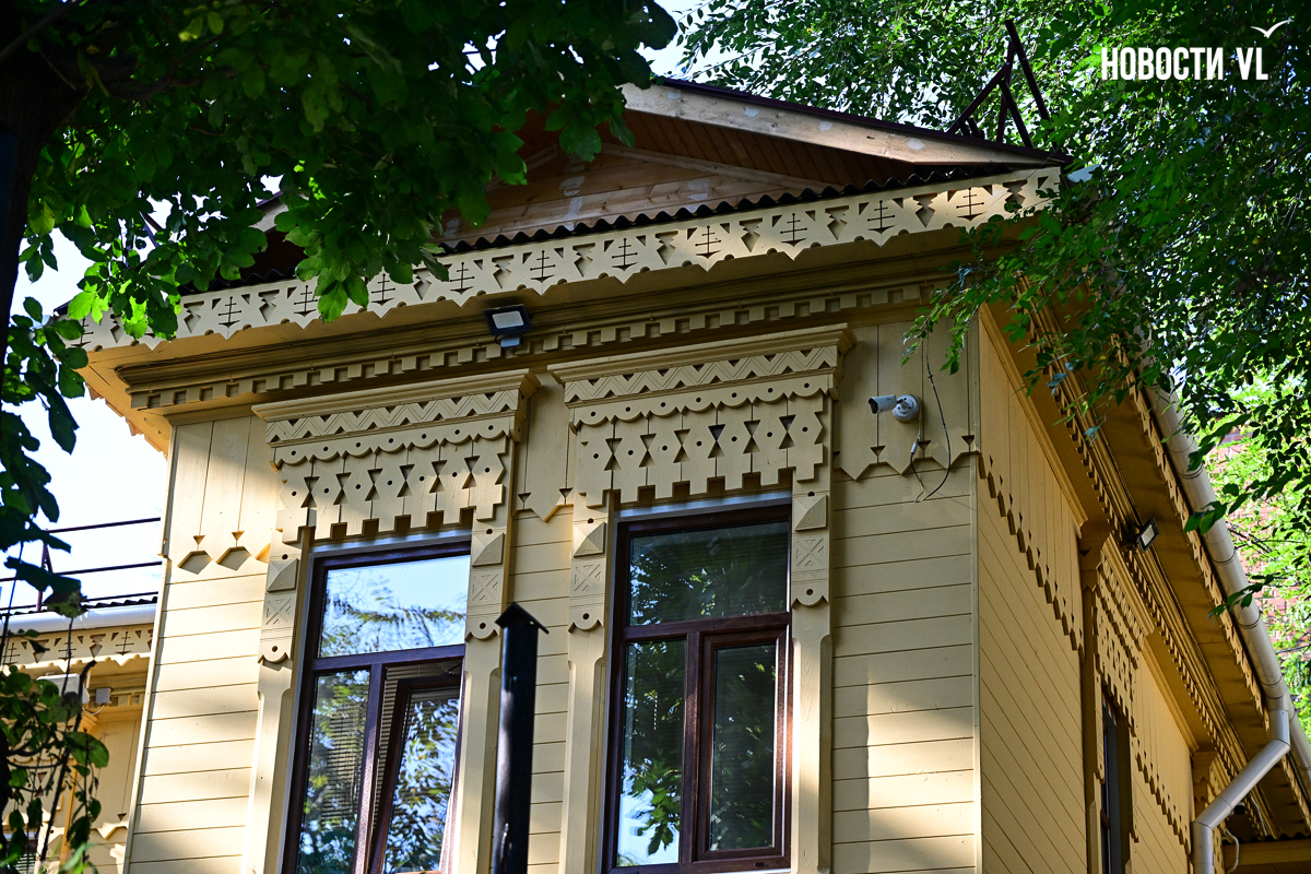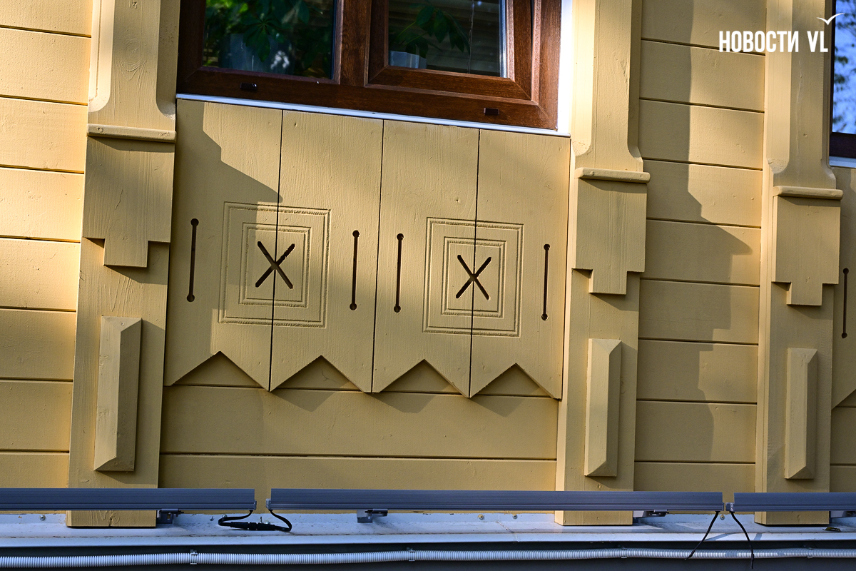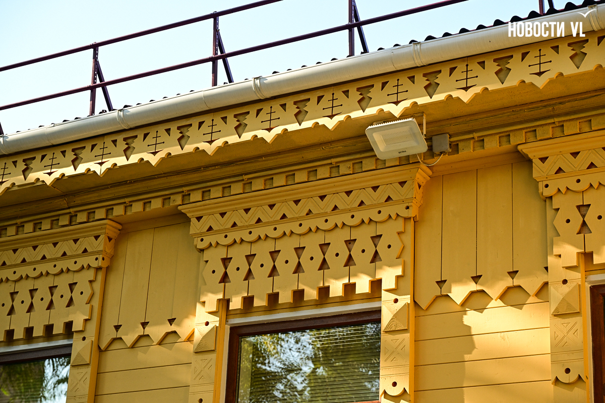 Директор краевого центра народной культуры Надежда Аристова рассказывает, что осину для фасада и декоративных элементов везли из Новосибирска – считается, что у неё хорошая влагостойкость. Дерево подвергли специальной обработке, чтобы дольше сохранилось. Декоративные элементы обновили, но часть пришлось заменить – они оказались серьёзно разрушены. Ещё часть подарили музею имени Арсеньева. Но новые полностью идентичны тем, что были: отделка воспроизведена с исторической точностью. Деньги на ремонт, а это 18,5 миллиона рублей, выделены из регионального бюджета.