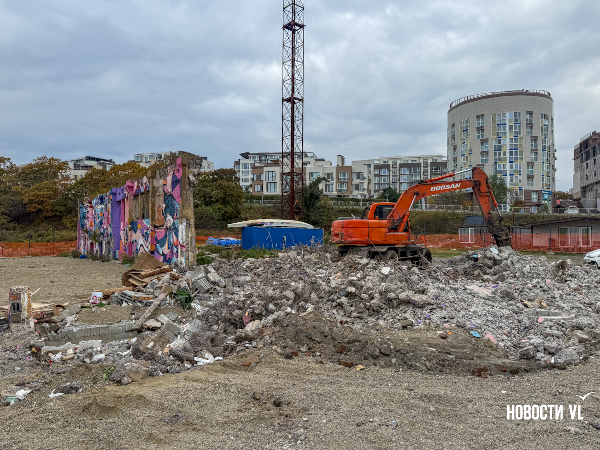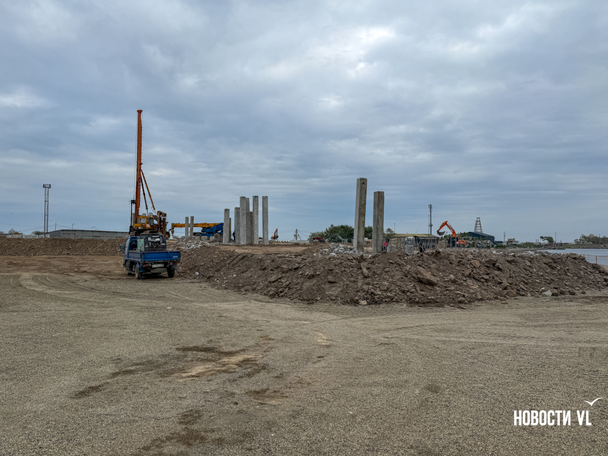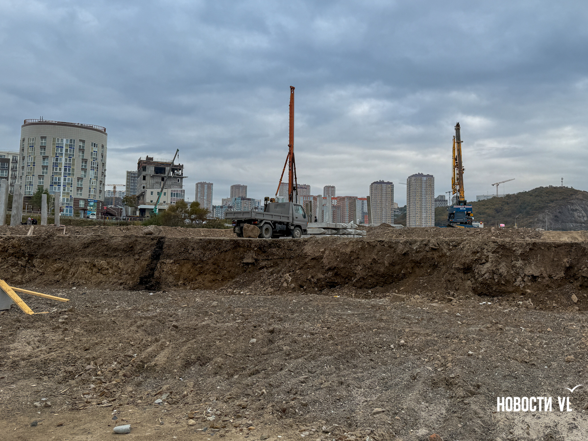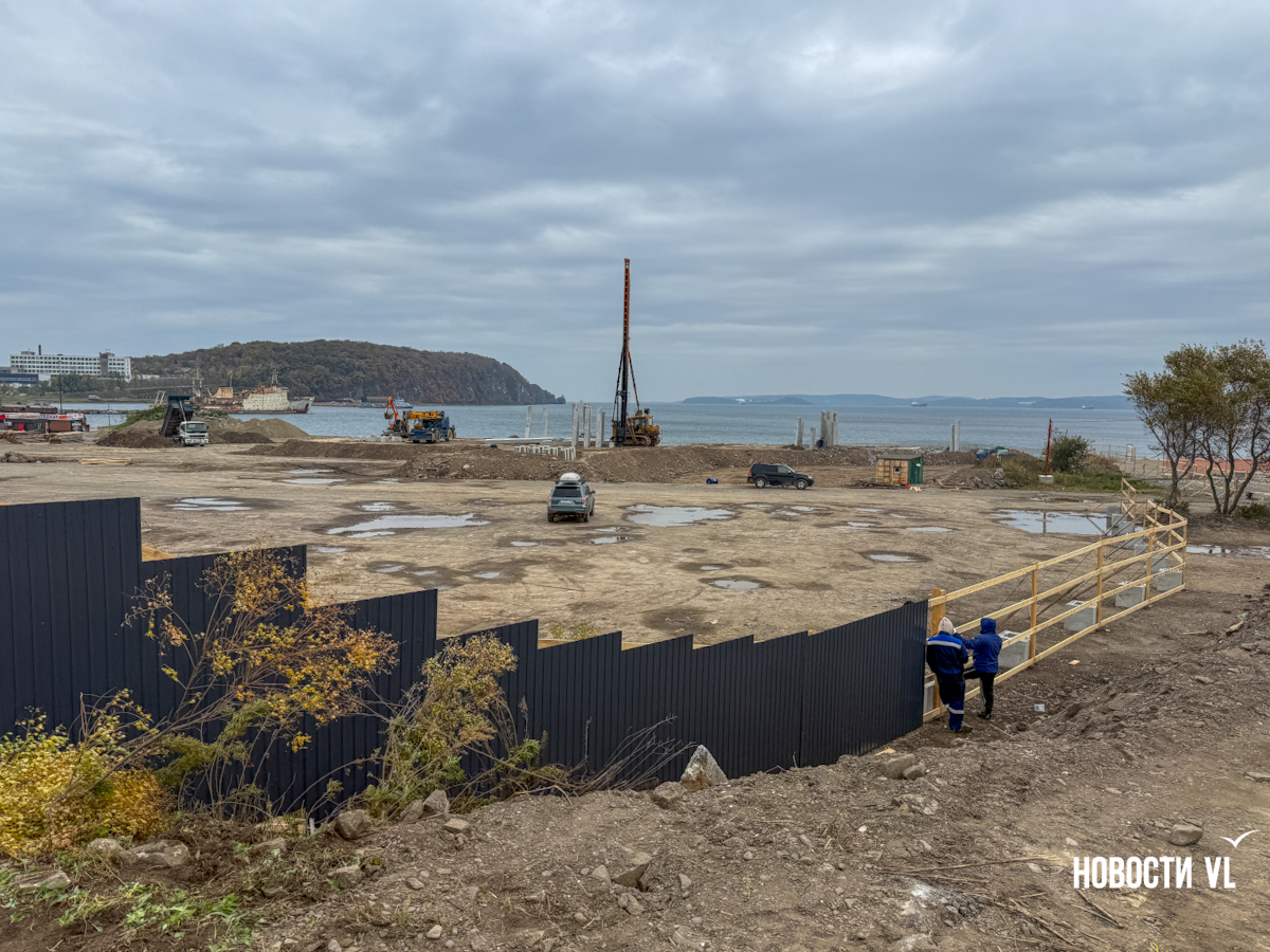 На территории тяжёлая техника выгребает грунт. Похоже, у берега сокращают перепад высот. Недалеко от воды работают две буровые, вколачивают сваи – на них сделают пешеходные дорожки на разных уровнях. За забором начали разбирать бетонную стену с граффити.