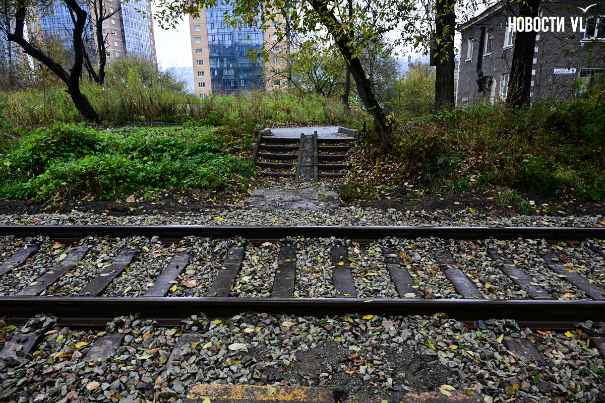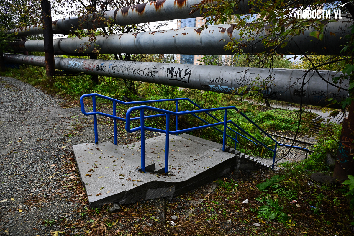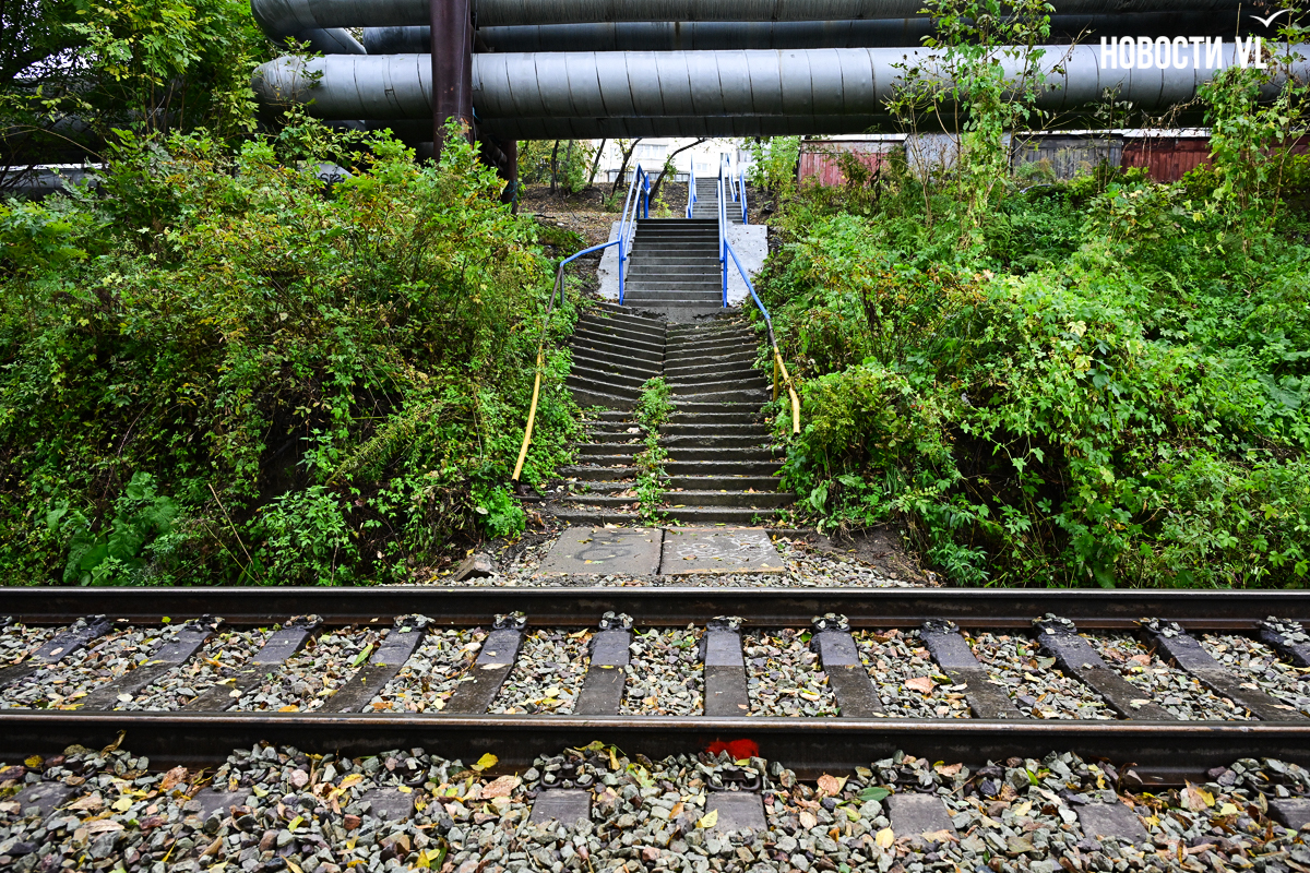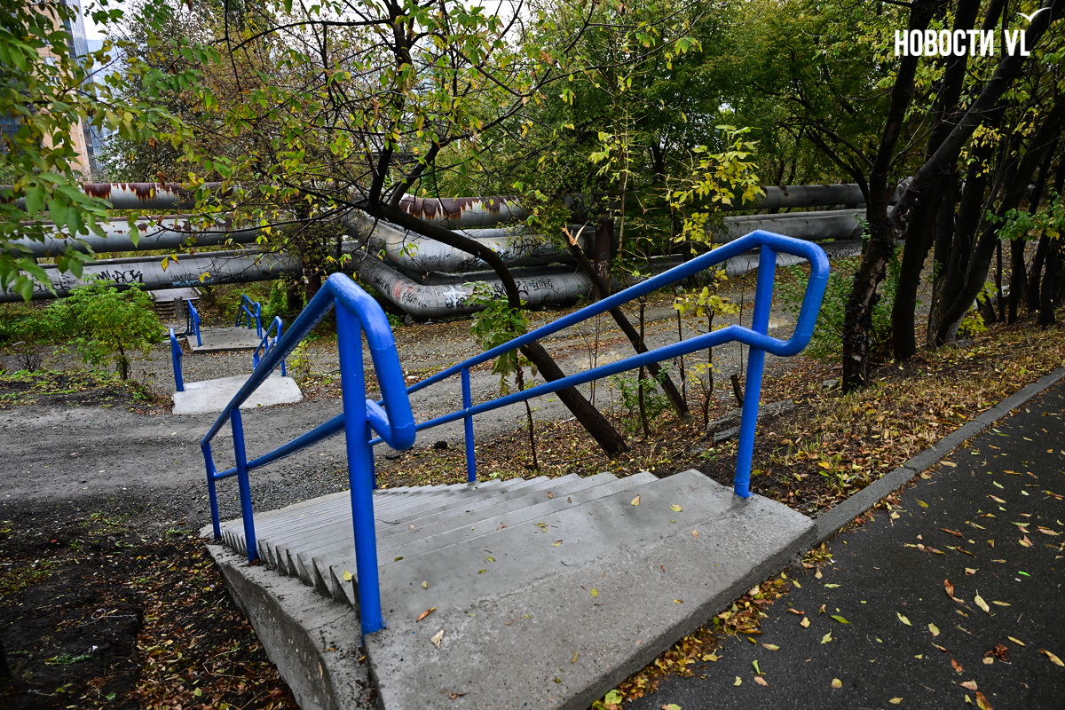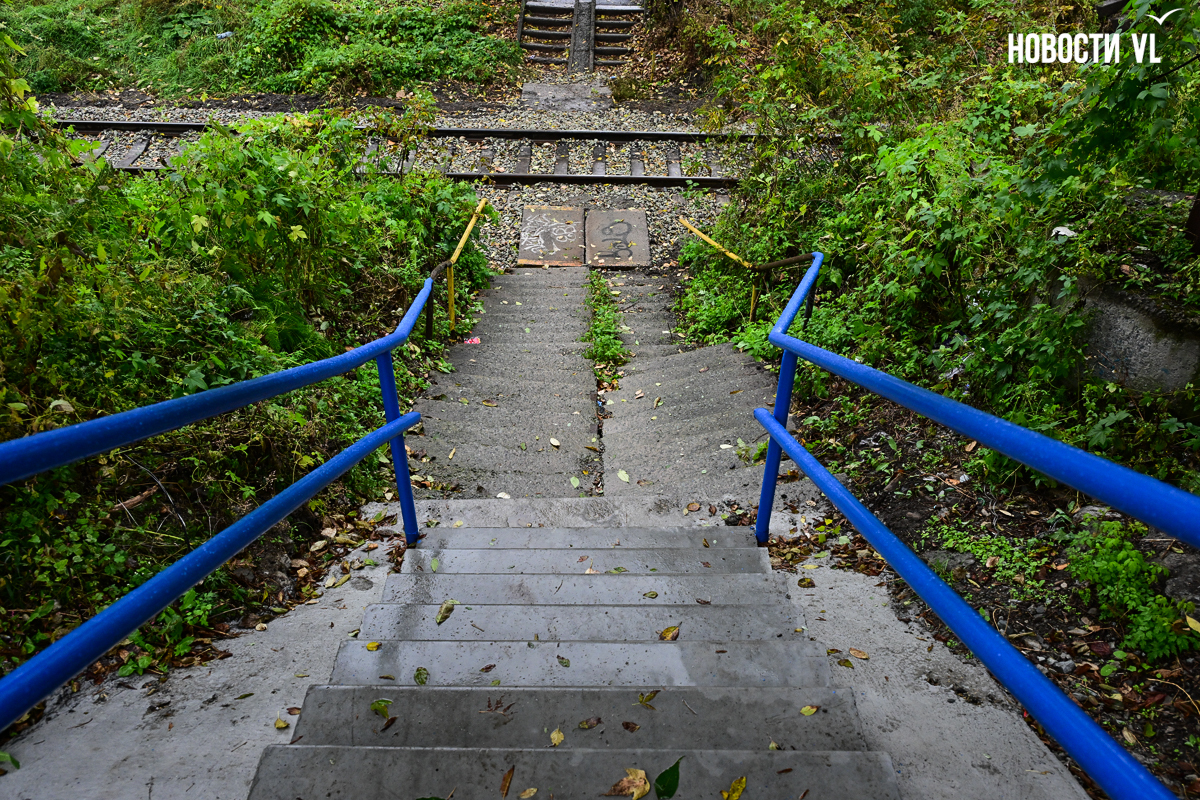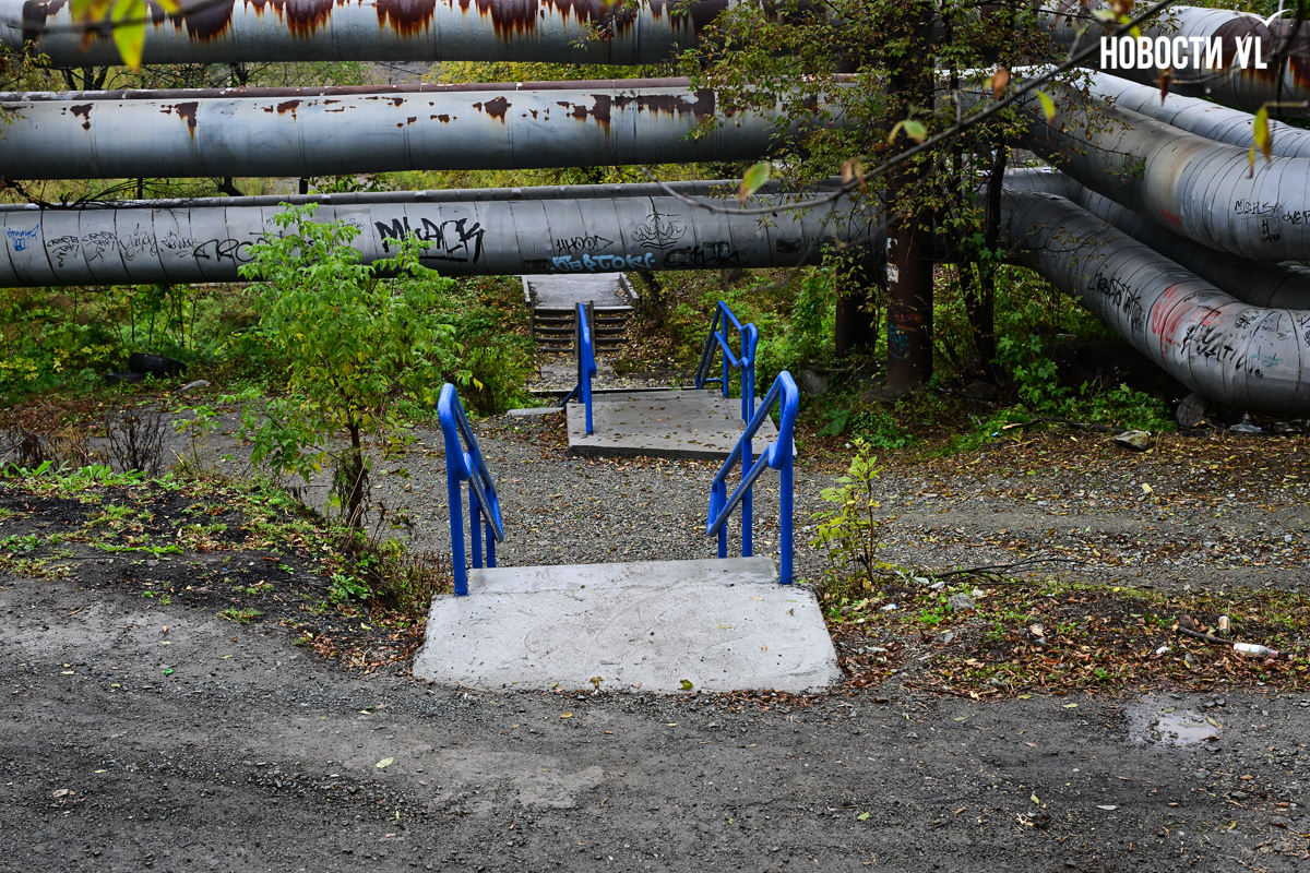 Эта лестница соединяет улицу Вилкова с жилыми домами на Киевской и проходит через железнодорожные пути. Недавно ремонт на ней закончился, правда, сделали его лишь наполовину. Верхняя часть лестницы преобразилась, вместо покошенных ступеней там появились новые, ровные. Ещё рабочие привели в порядок перила и покрасили их в голубой цвет, а также обустроили площадку между пролётами. Но посреди лестницы, под тепловыми трубами, благоустройство закончилось. В муниципальном центре управления Владивостока объяснили ситуацию тем, что участок не разграничен.