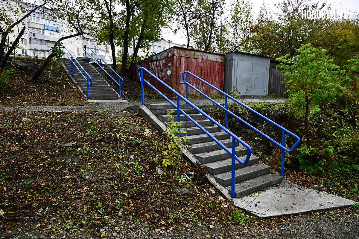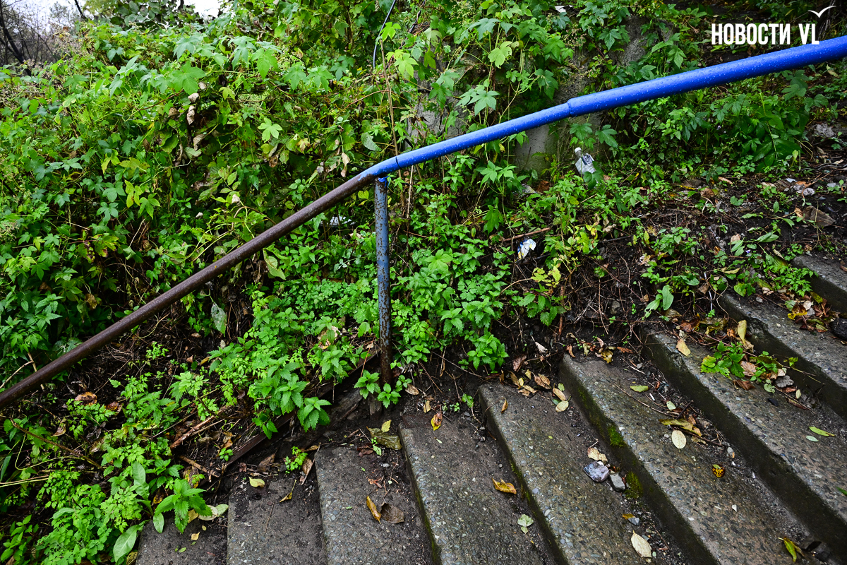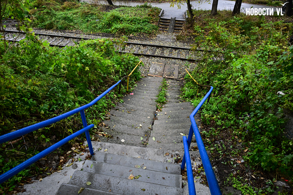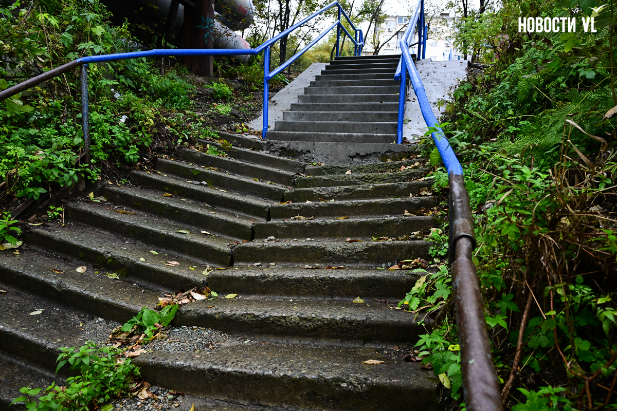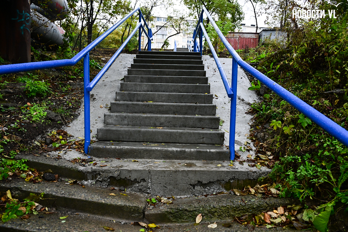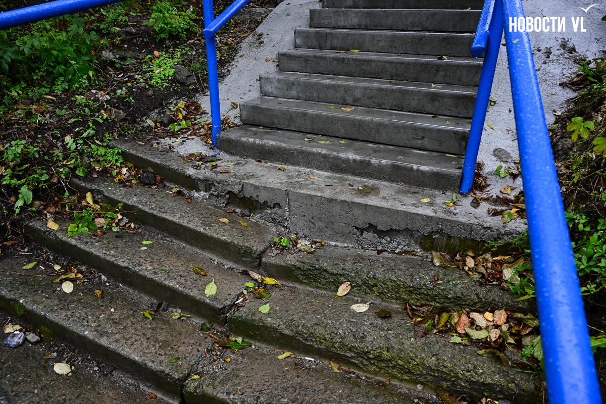 Во Владивостоке ремонт лестницы, ведущей от Вилкова к Киевской, буквально завершился на полпути. Администрация города по решению суда включила этот спуск в «ремонтный» список, но из-за того, что часть лестницы заходит на территорию РЖД, отремонтировали её не полностью. И теперь эта лестница удивляет своей многогранностью: люди, спускающиеся по ней, после ровного участка попадают на кривые и старые ступени.