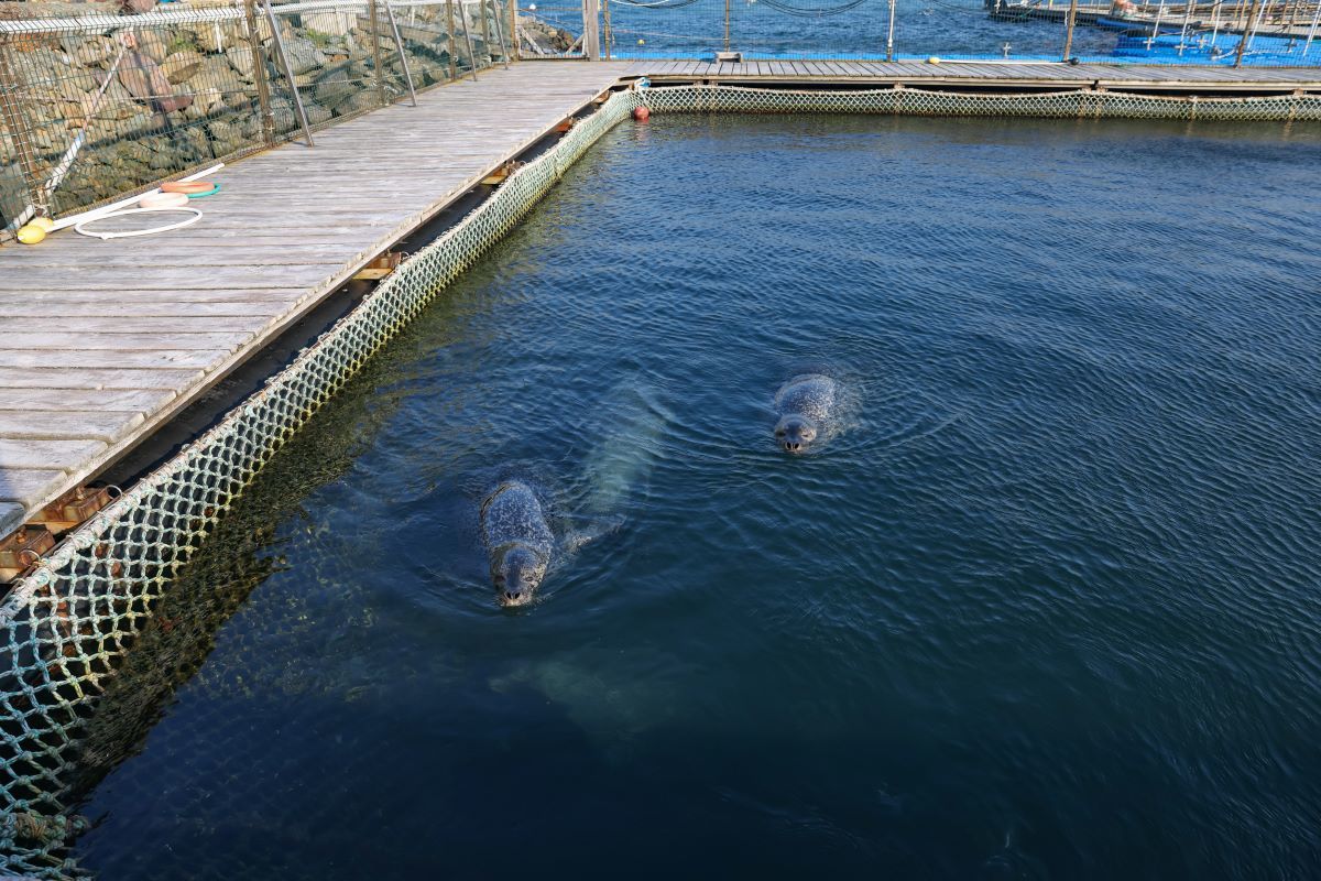 «Тюлени собираются группой и гонят рыбу к сетке, ограничивающей вольер. Когда рыба сталкивается с сеткой, она «отскакивает» прямо в рот загонщикам. Ларгам, выстроившимся в шеренгу перед сеткой, остаётся просто собрать «урожай». Первое время они ели иваси практически без перерыва, пока не устанут, потом отдыхали немного на берегу и снова принимались за еду. Теперь они начинают потихоньку наедаться и постепенно выходить на контакт с людьми», – рассказала Кристина Степанова, старший тренер базы исследования морских млекопитающих.