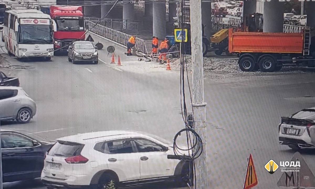 На крайней левой полосе проспекта 100-летия Владивостока при движении к перекрёстку с Русской в сторону остановки «Фабрика «Заря» со вчерашнего дня идёт ремонт. Движение было затруднено, о чём предупредили в Центре организации дорожного движения.
