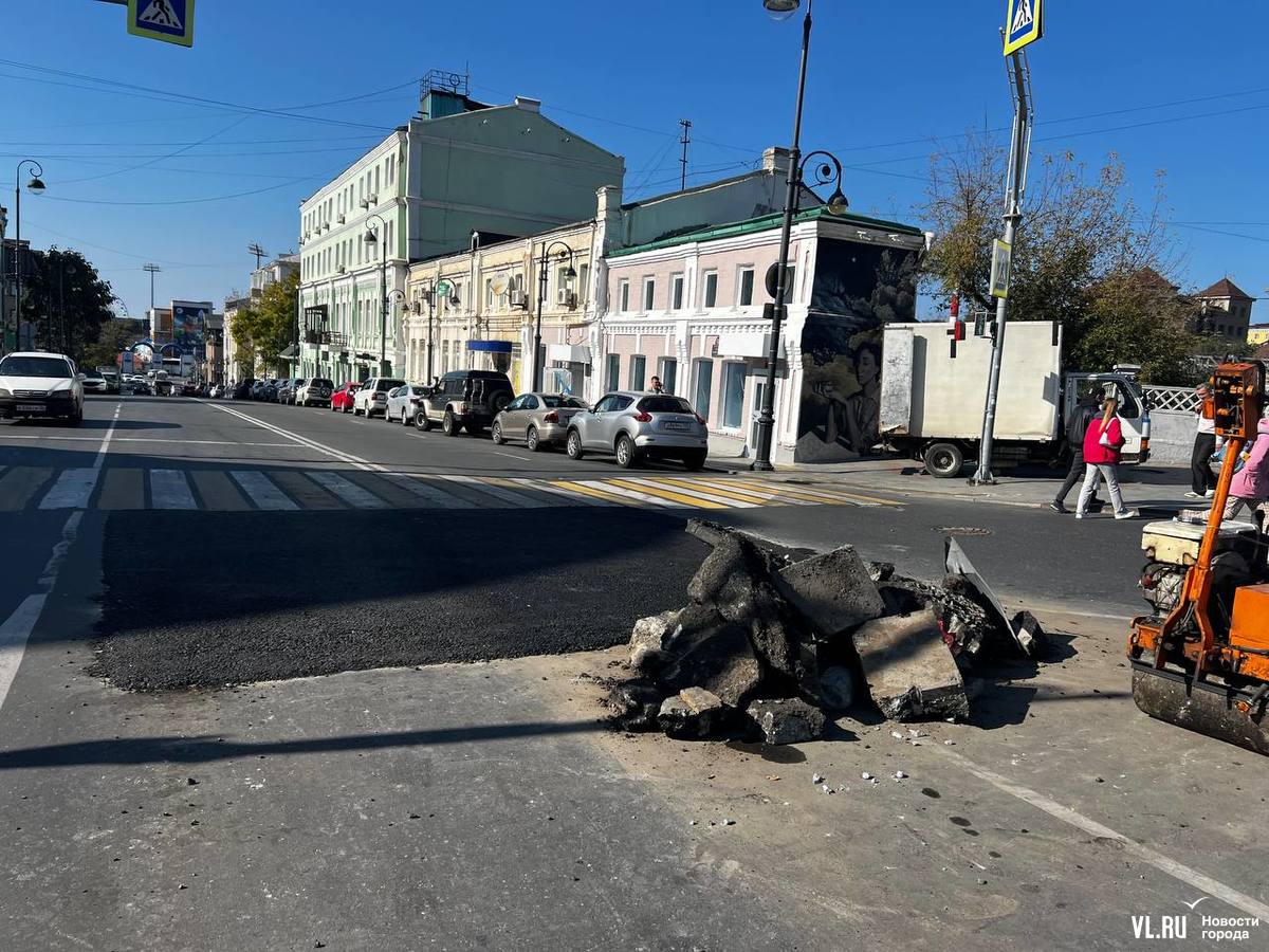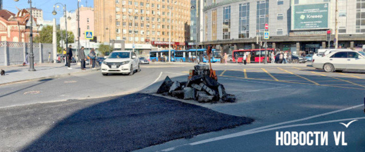 После четырёх дней ремонта трубы на перекрёстке Семёновской и Алеутской дыру наконец заасфальтировали. Правда, «заплатка» получилась несколько выше основного полотна, а за собой рабочие оставили пирамидку из кусков асфальта, дорожный знак и маленький каток.