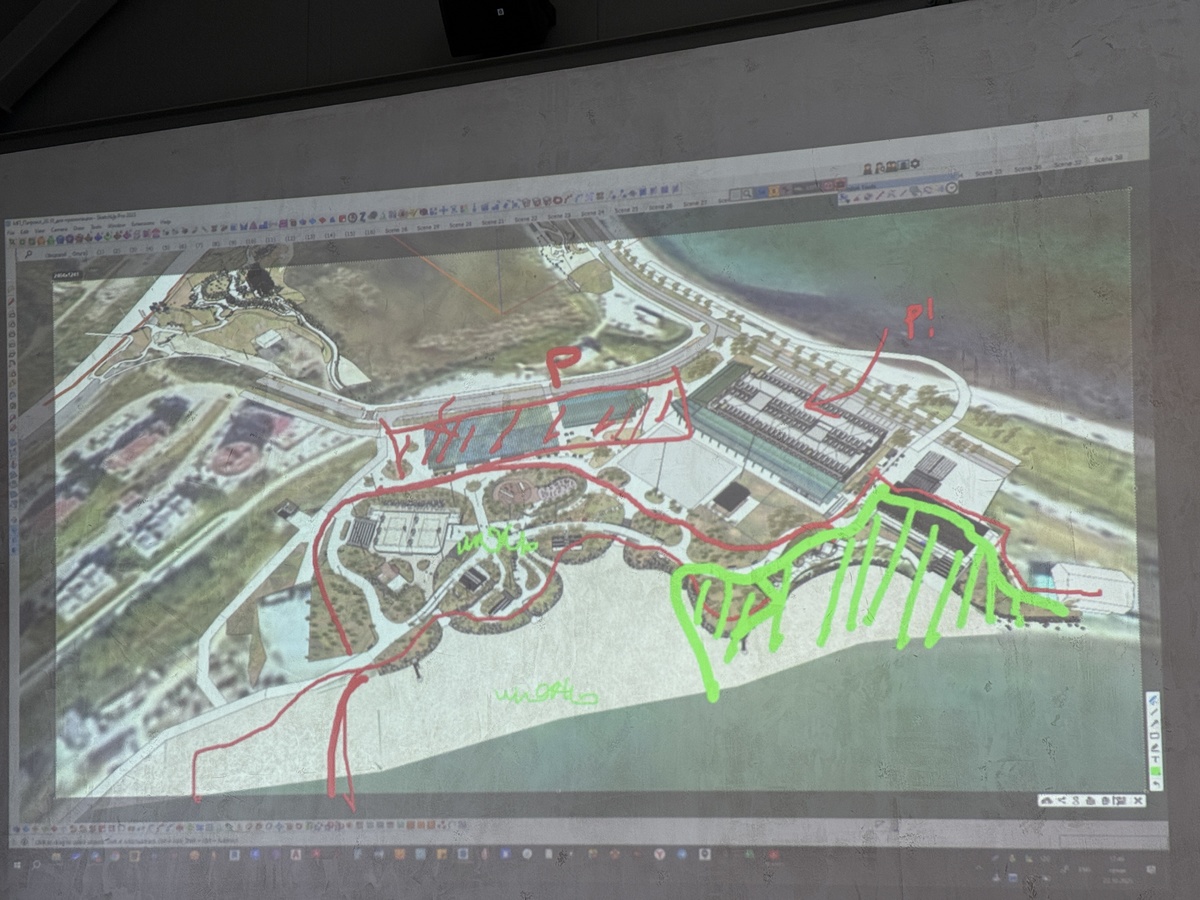 Территория будет выполнена из бетона с зелёными островками и зонами. Планируется, что в будущем, лет через 5, когда растения вырастут, они создадут импровизированные стены, которые будут закрывать вид на пляж, но не на море.