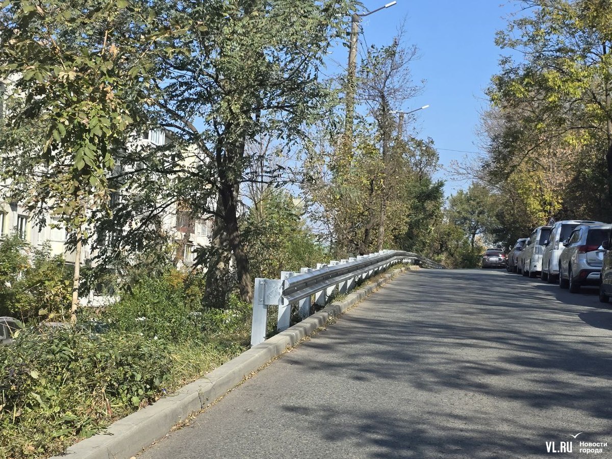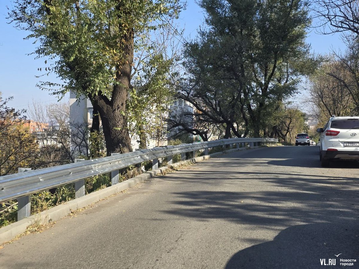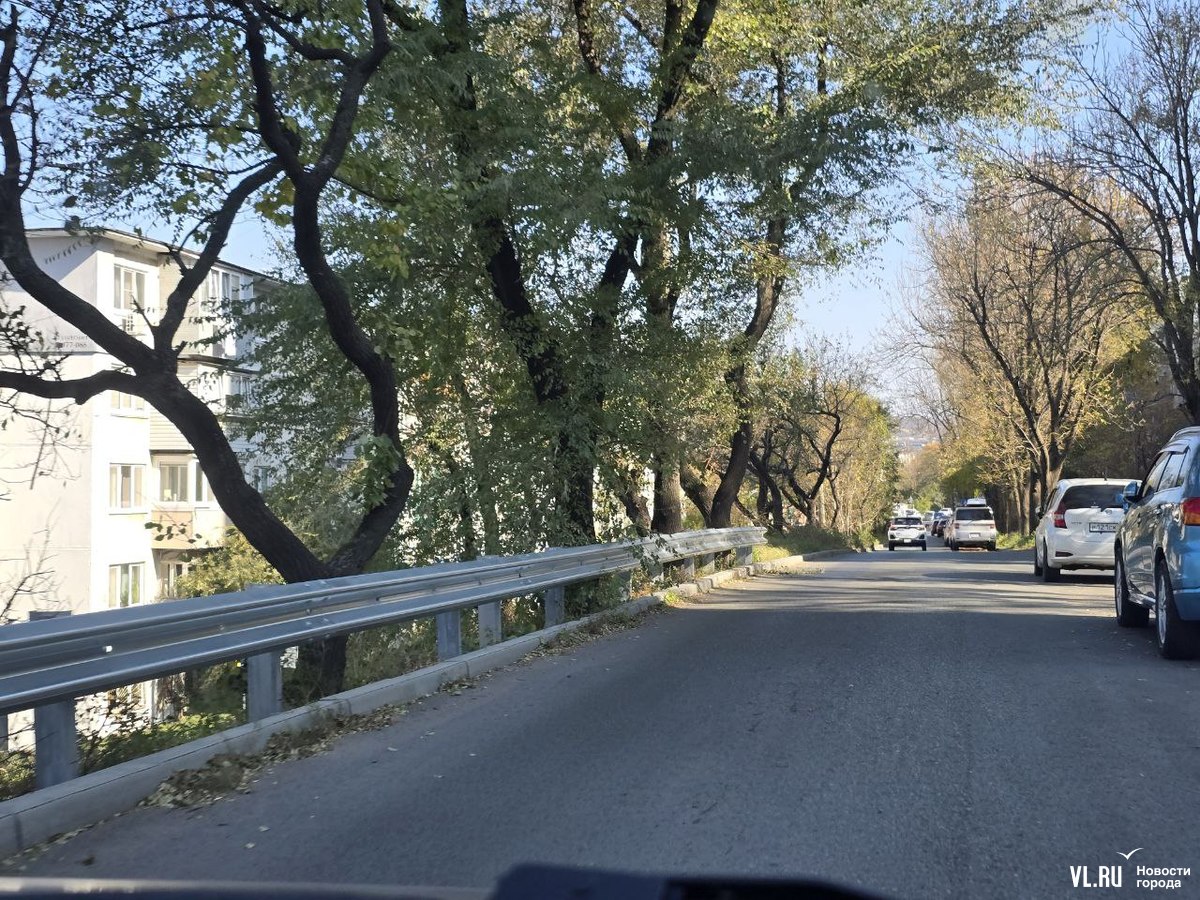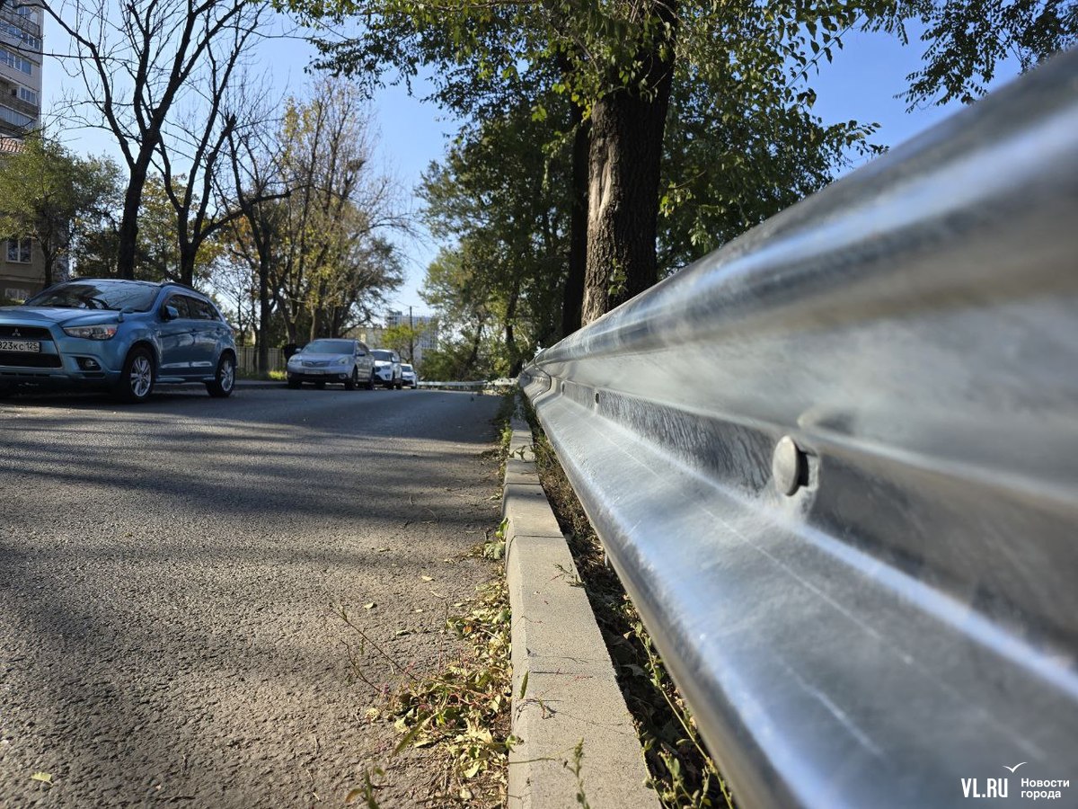 Подрядчик по заказу управления дорог администрации Владивостока монтирует леера вдоль дороги на Хабаровской. Участок проезжей части здесь проходит над подпорной стеной, поэтому решено было принять дополнительные меры безопасности.