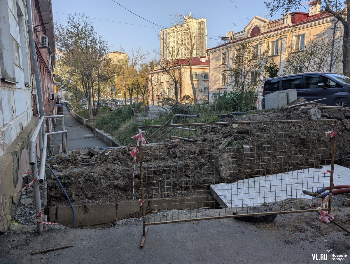 ВПЭС закончило перекладку теплосетей на Уткинской. Проезд для машин открыт, однако часть тротуара со стороны фабрики «Приморский кондитер» закрыта для прохода. Закопать всё и восстановить асфальт обещают в течение двух недель.