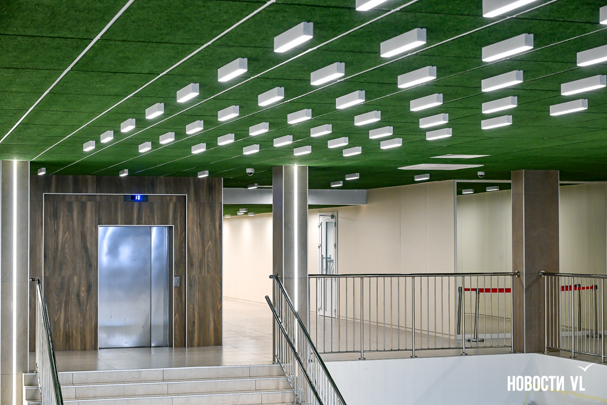 Изменения видны уже с порога – потолок во входной зоне цвета травы, как футбольное поле. Он из акустических панелей, предотвращающих распространение звука, – так гасится шум тренировок и соревнований. Много света, и он разный: вертикальный, потолочный, разбитый на группы – целый сценарий. Освещённость специально рассчитывали. Входная группа полностью переделана. Сейчас устанавливают современную пропускную систему – с «просвечиванием» сумок, камерами, идентификацией лиц. Вообще, у здания три входа, все они были отремонтированы. Но этот – основной.