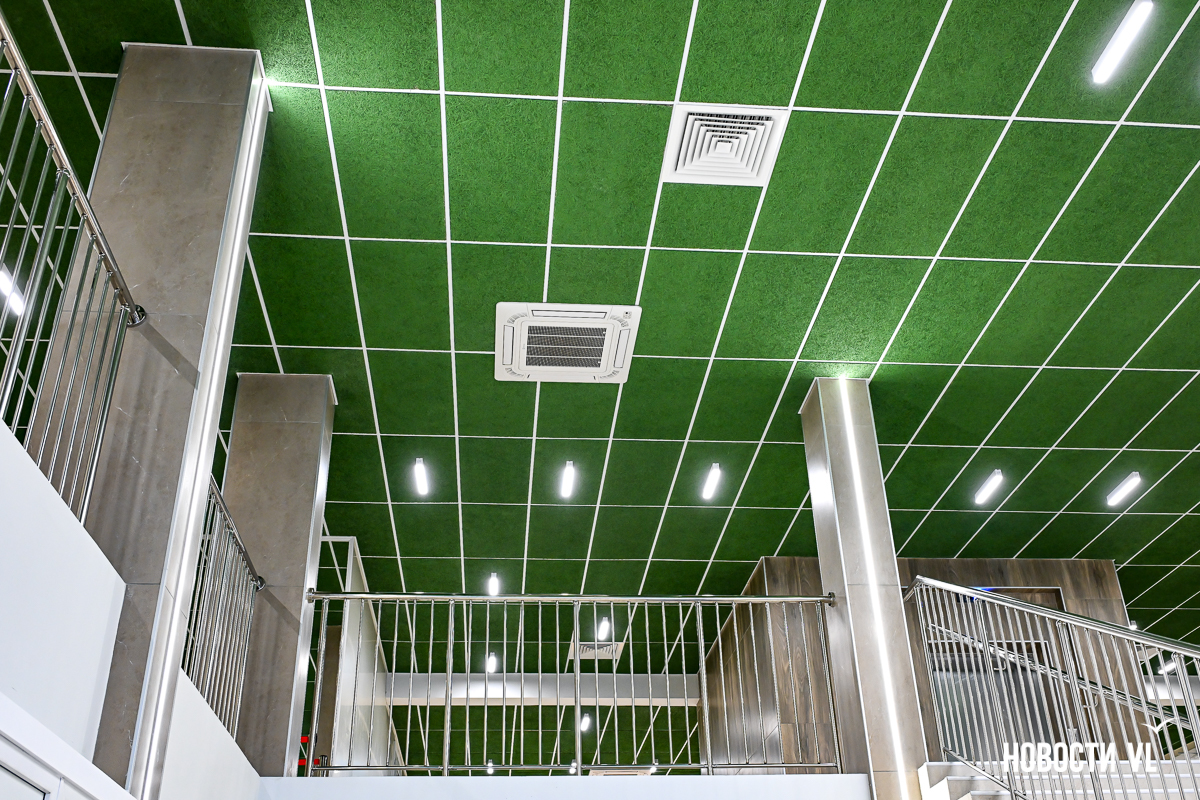 Изменения видны уже с порога – потолок во входной зоне цвета травы, как футбольное поле. Он из акустических панелей, предотвращающих распространение звука – так гасится шум тренировок и соревнований. Много света, и он разный: вертикальный, потолочный, разбитый на группы – целый сценарий. Освещённость специально рассчитывали. Входная группа полностью переделана. Сейчас устанавливают современную пропускную систему – с «просвечиваеннием» сумок, камерами, идентификацией лиц. Вообще, у здания три входа, все они были отремонтированы. Но этот – основной.