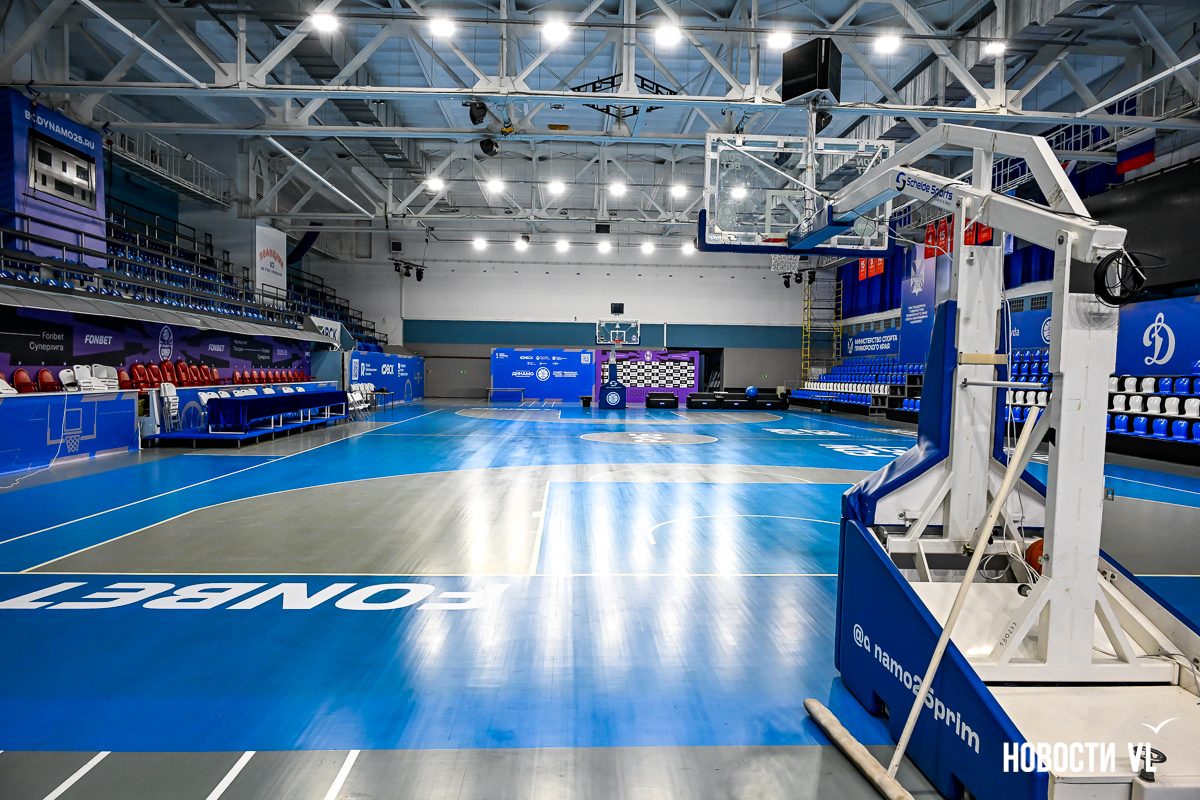 Справа в холле работы пока продолжаются – здесь будут кафе и буфет. Слева – вход в универсальный игровой зал на 1100 мест. Здесь усилили освещение, обновили табло, нанесли новую разметку и обновили покрытие. Заместитель директора по эксплуатации спортивного оборудования Дмитрий Толстов рассказывает: это была профессиональная реставрация пола с нанесением специального лака, отвечающего требованиям Национальной баскетбольной лиги. В этом сезоне здесь уже проходят состязания по баскетболу и волейболу, а недавно проводили соревнования по художественной гимнастике. И в мини-футбол здесь тоже играют. Вообще, по словам министра спорта, комплекс позволяет проводить самые разные соревнования – и по игровым видам, и по различным видам единоборств.
