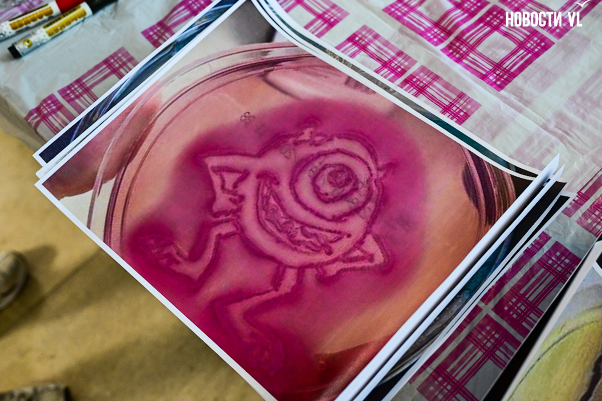 «Мы условно выращиваем бактерии на питательной среде. Это такой достаточно новый тип искусства. Берутся бактерии определённых типов и наносятся на питательную среду. Условно мы нанесли один тип бактерий на одну сторону, другой на другую. И только после покраски мы можем выяснить, какой цвет получится у бактерий», – объяснил студент.