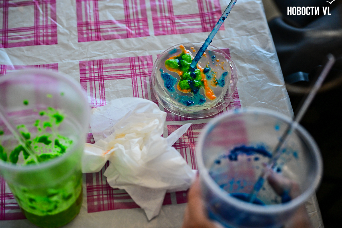 По соседству рождалось уникальное искусство. У стола с чашками Петри столпились десятки школьников. Здесь рисовали бактериями.