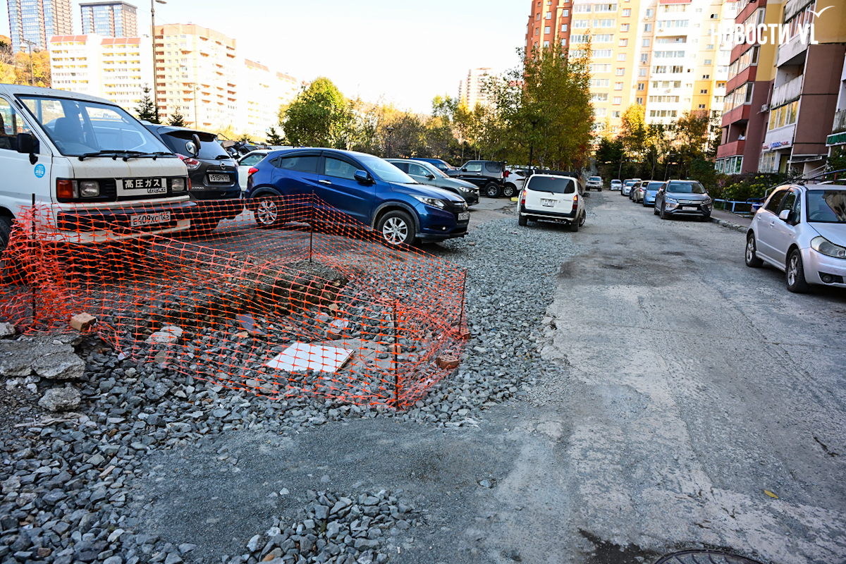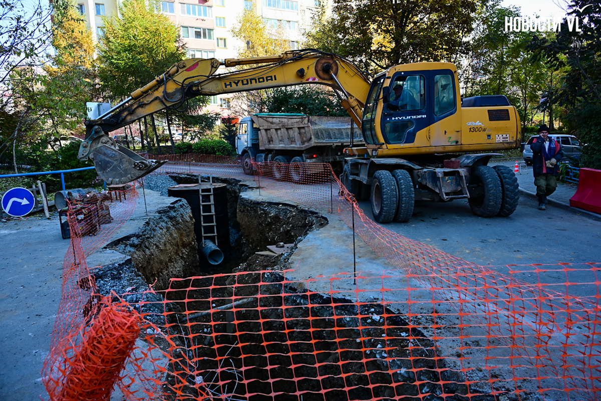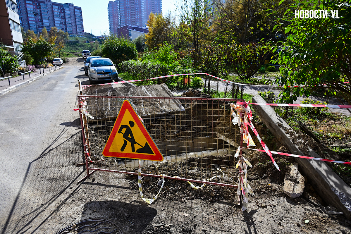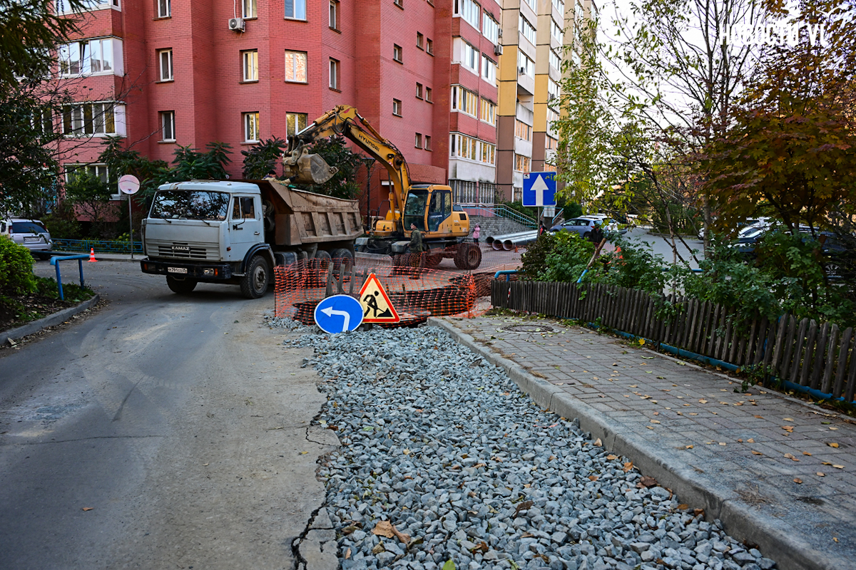 Уже несколько месяцев жители дома на Адмирала Горшкова, 36 живут без горячей воды и дышат пылью затяжного ремонта. Весной здесь начали ремонтировать сети водоснабжения, работы должны были завершить 30 сентября, но техника и ныне там. Подрядчик Примводоканала до сих пор ковыряется в траншее с трубами у соседнего дома, а придомовая территория превратилась в место перевалки строительных материалов. Привыкшие к отсутствию горячей воды граждане привыкают теперь ещё и к отсутствию отопления из-за текущих труб.