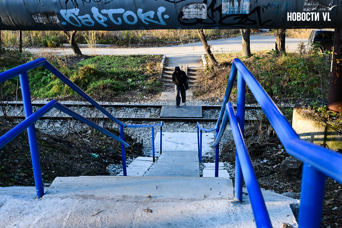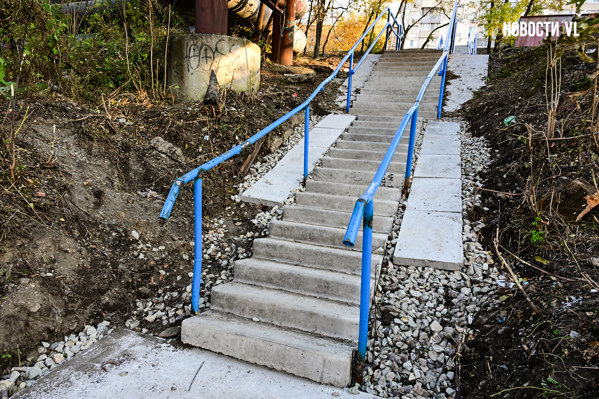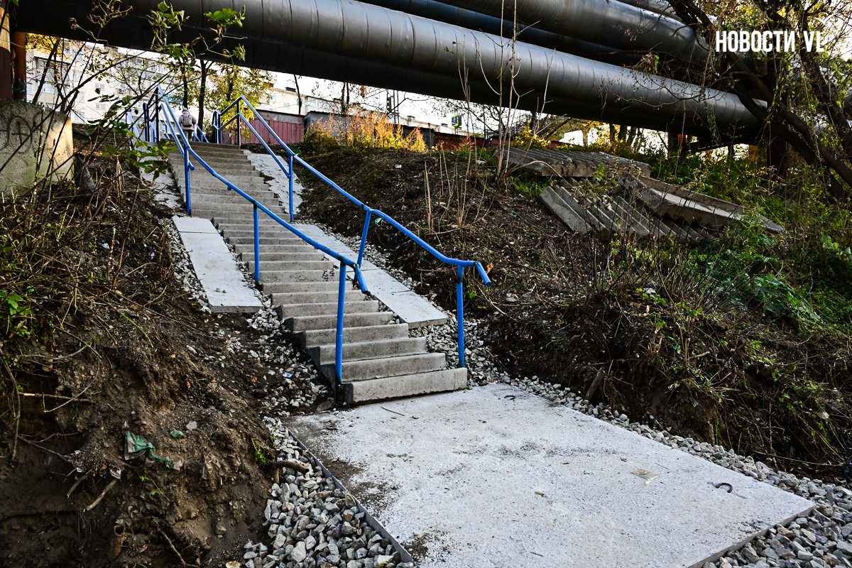 Во Владивостоке отремонтировали половину лестницы, ведущей от улицы Вилкова к Киевской. В середине октября обновили её половину, только до прохода к гаражному кооперативу, а нижняя часть тогда осталась старой и некрасивой. В чьей зоне ответственности находится оставшийся участок и кто должен привести его в порядок, было не понятно, но недавно неизвестный доброжелатель отремонтировал лестницу до конца и организовал переход через пути. Ни РЖД, ни администрация города себе это не приписывают.