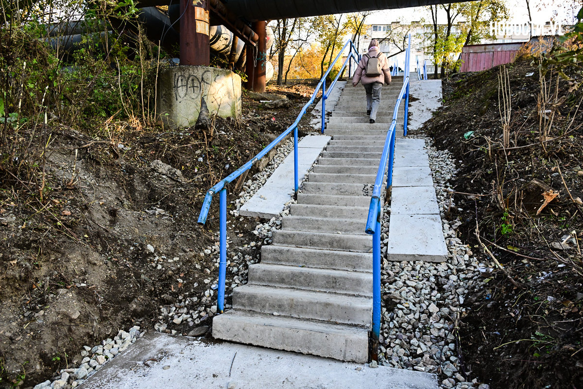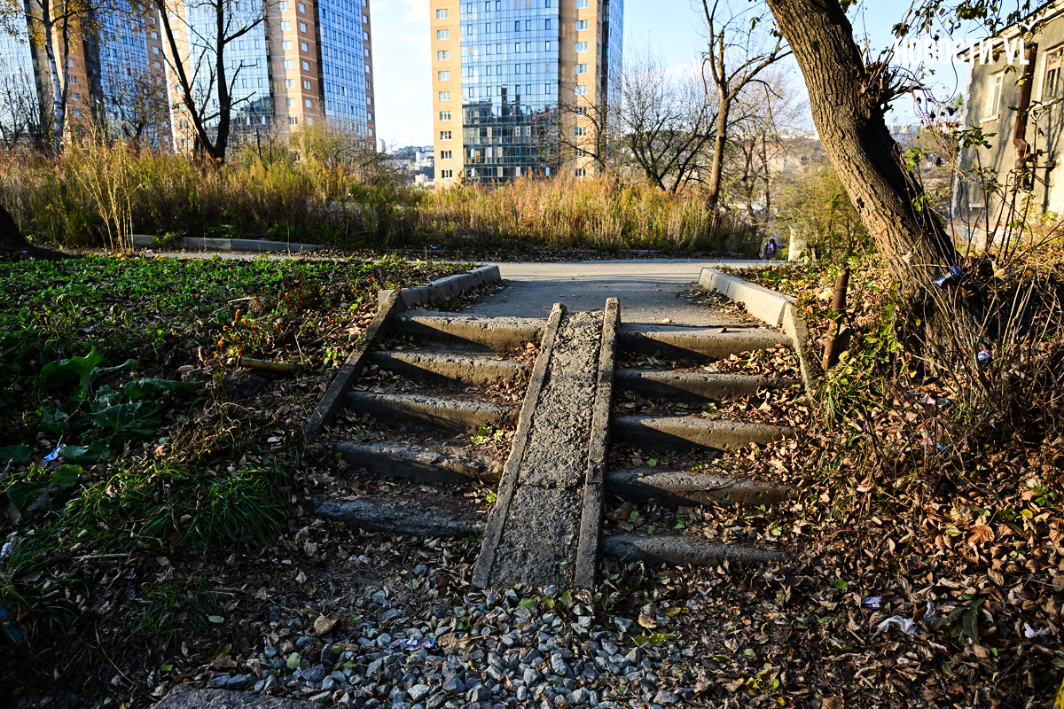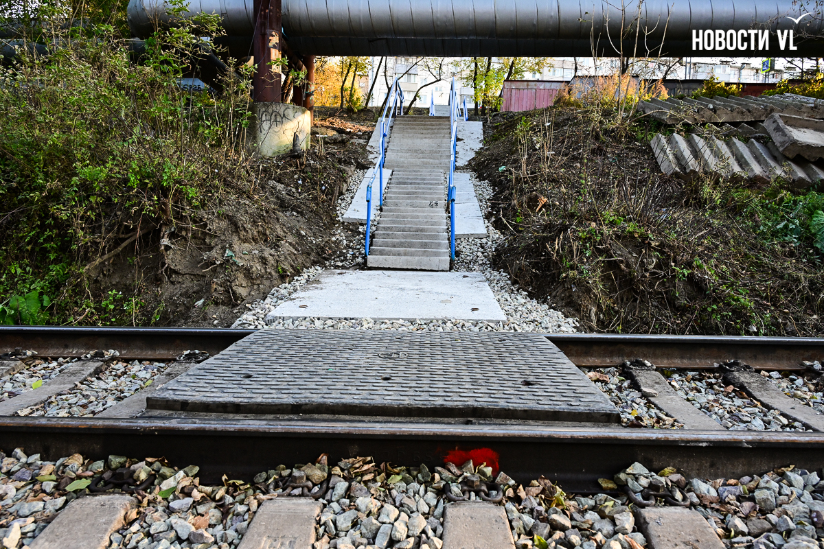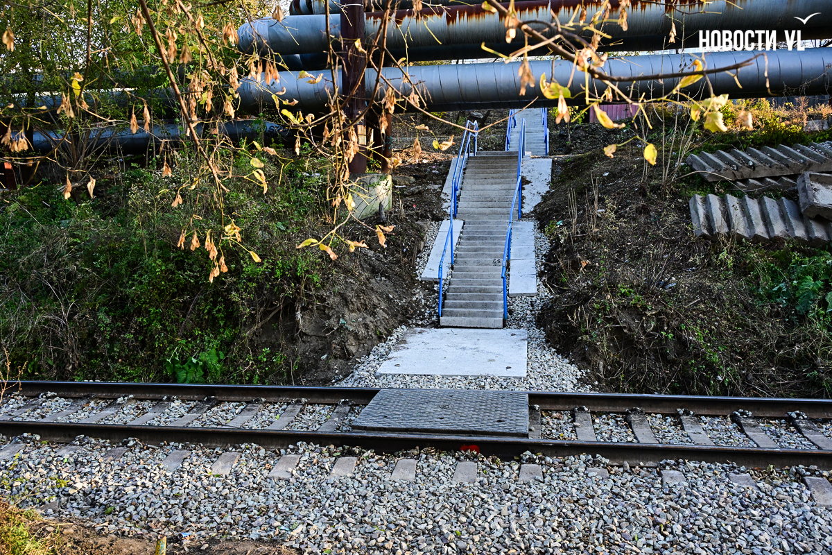 Во Владивостоке отремонтировали половину лестницы, ведущей от улицы Вилкова к Киевской. В середине октября обновили её половину, только до прохода к гаражному кооперативу, а нижняя часть тогда осталась старой и некрасивой. В чьей зоне ответственности находится оставшийся участок и кто должен привести его в порядок, было не понятно, но недавно неизвестный доброжелатель отремонтировал лестницу до конца и организовал переход через пути. Ни РЖД, ни администрация города себе это не приписывают.