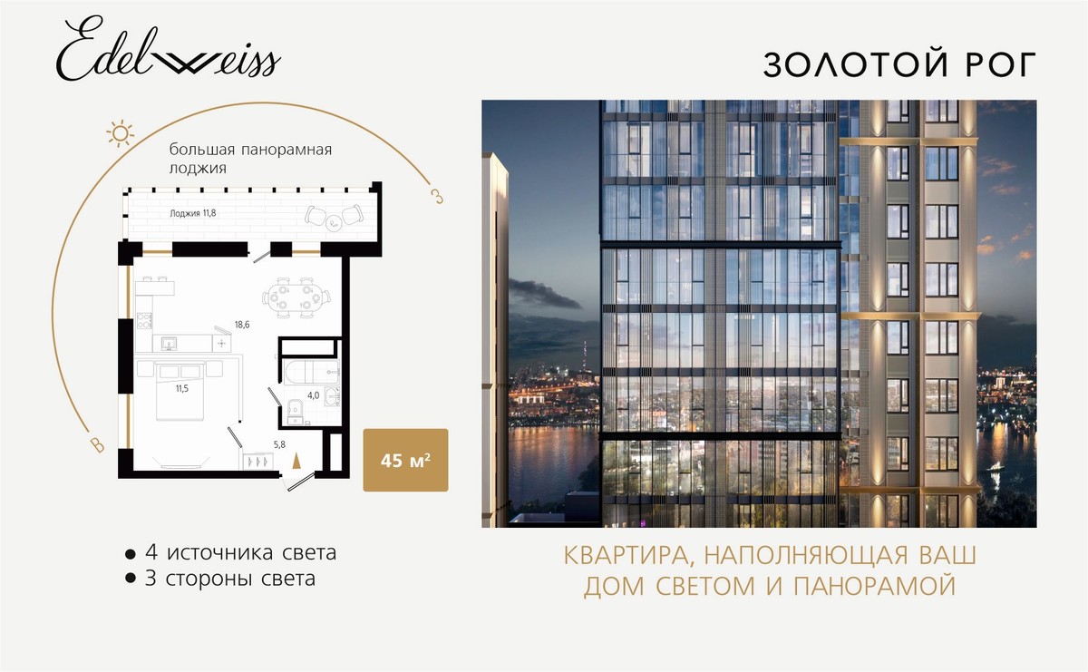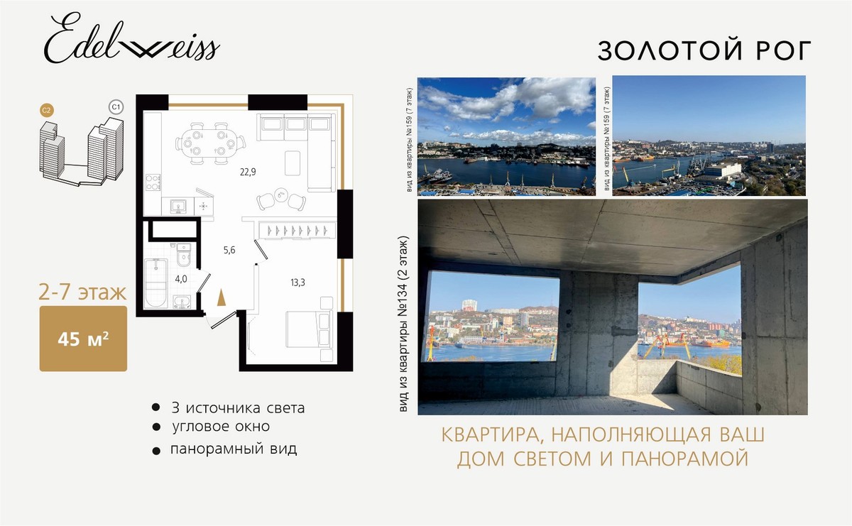 «Жилой комплекс «Edelweiss Золотой Рог» – наш флагман. Это не просто дом у моря, а место, где каждая деталь работает на комфорт и вдохновение. Владивосток здесь открывается по-новому – с видом, который невозможно забыть. Это проект, где важна каждая деталь – от архитектуры и видов до благоустройства и планировок. Уже совсем скоро откроются продажи новой, третьей очереди. Это событие, которого многие ждут – ведь именно на старте можно выбрать лучшие планировки и забронировать квартиру по наиболее привлекательной стоимости.