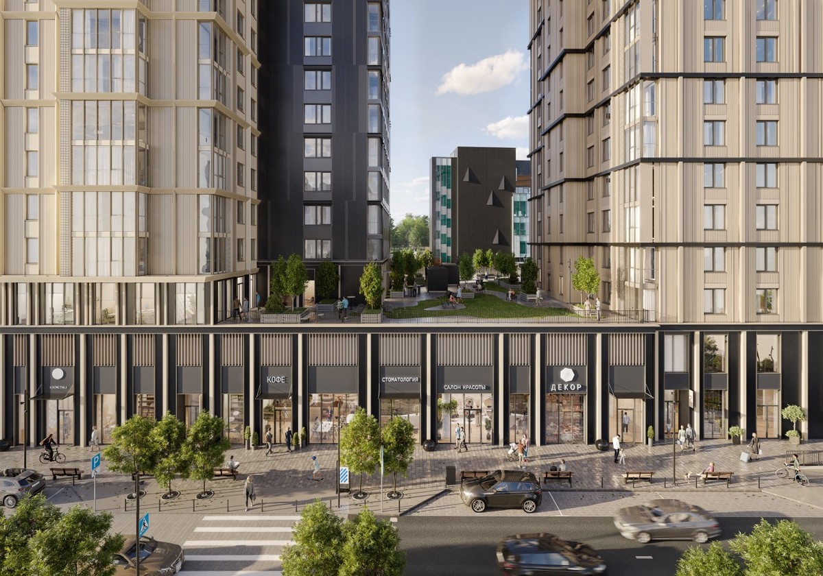 В основе проекта – концепция «город в городе». На первых этажах появятся кафе, фитнес-клуб, детский центр, магазины и сервисы. Двор приподнят над улицей, полностью свободен от машин, оформлен как приватный парк с аллеями, местами отдыха и детскими площадками.