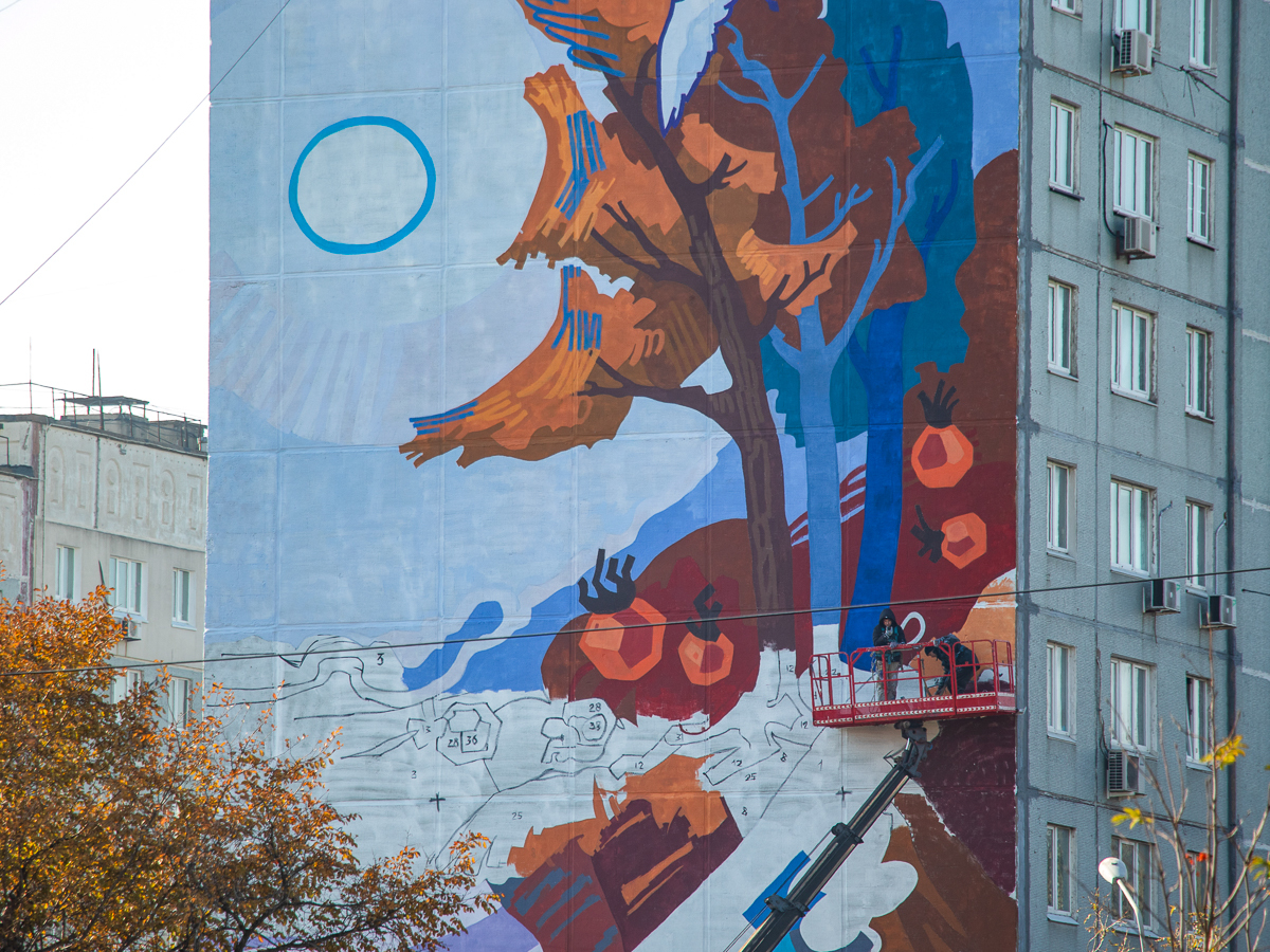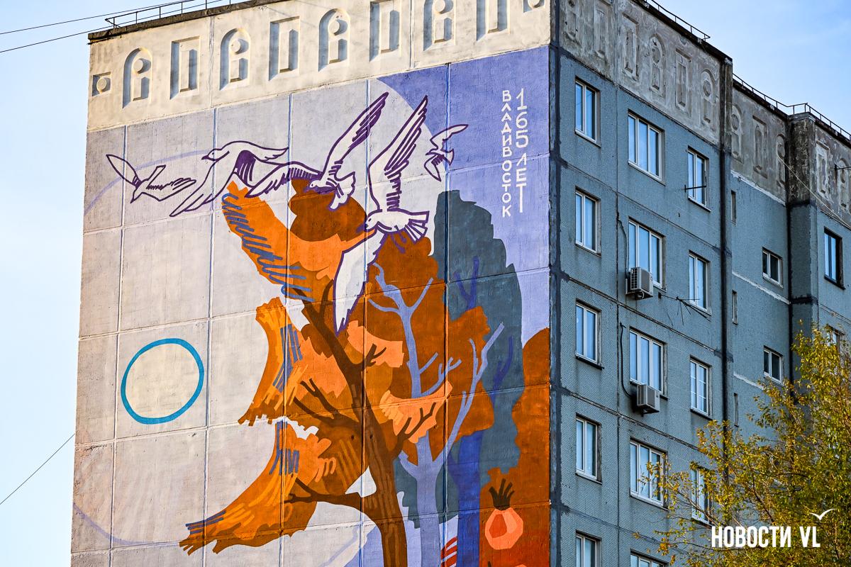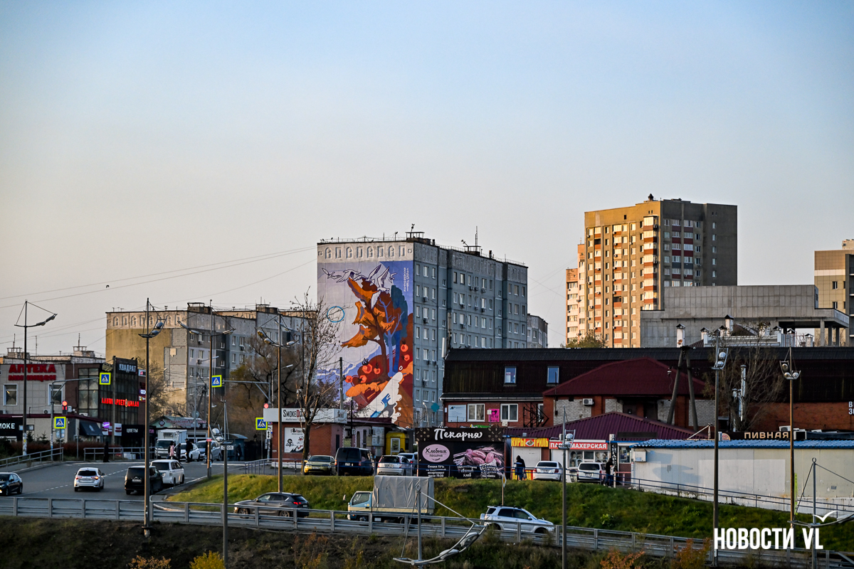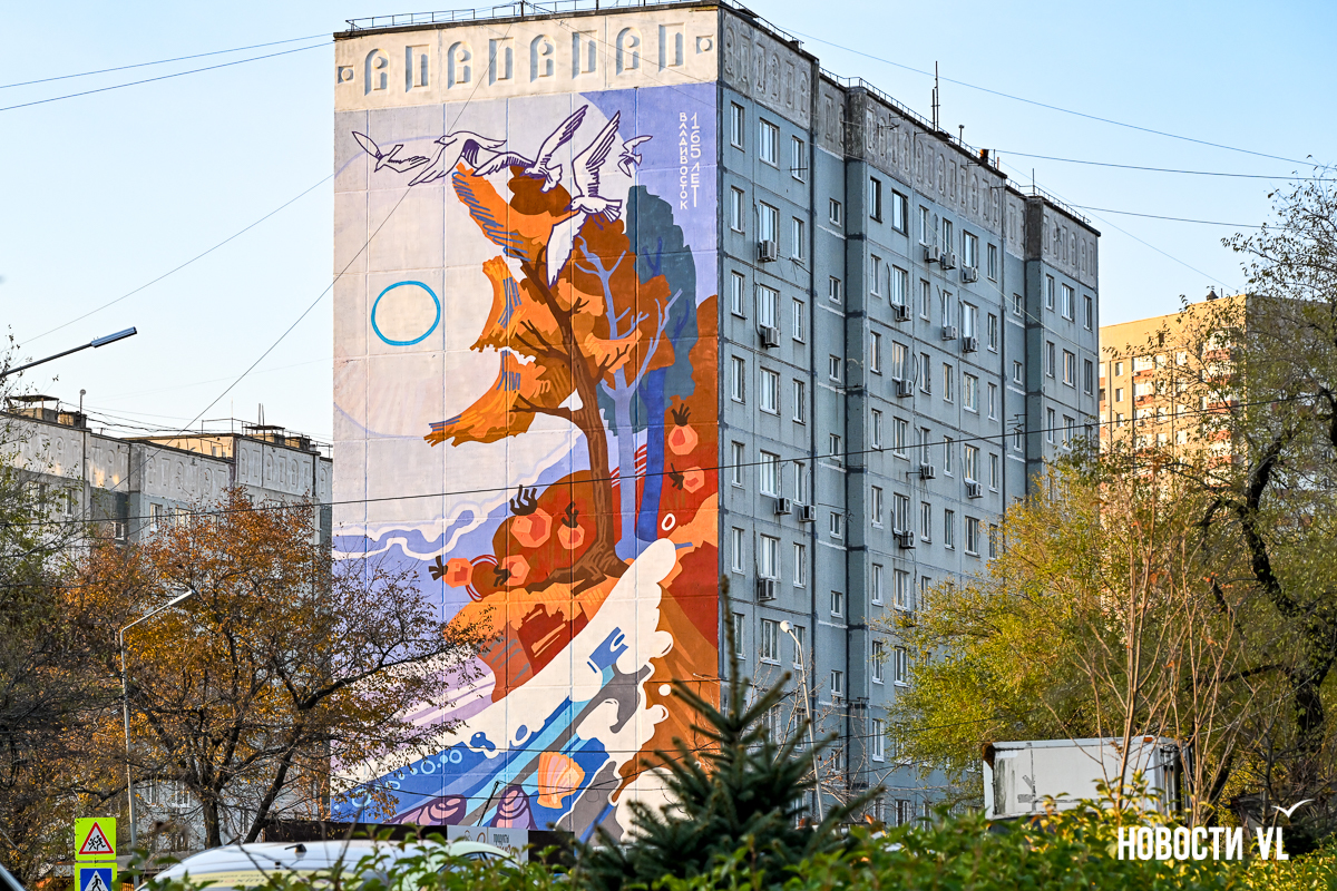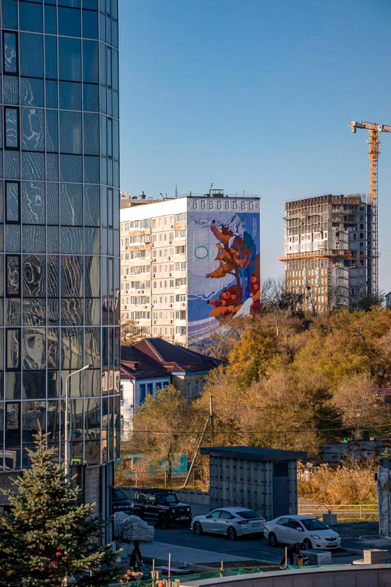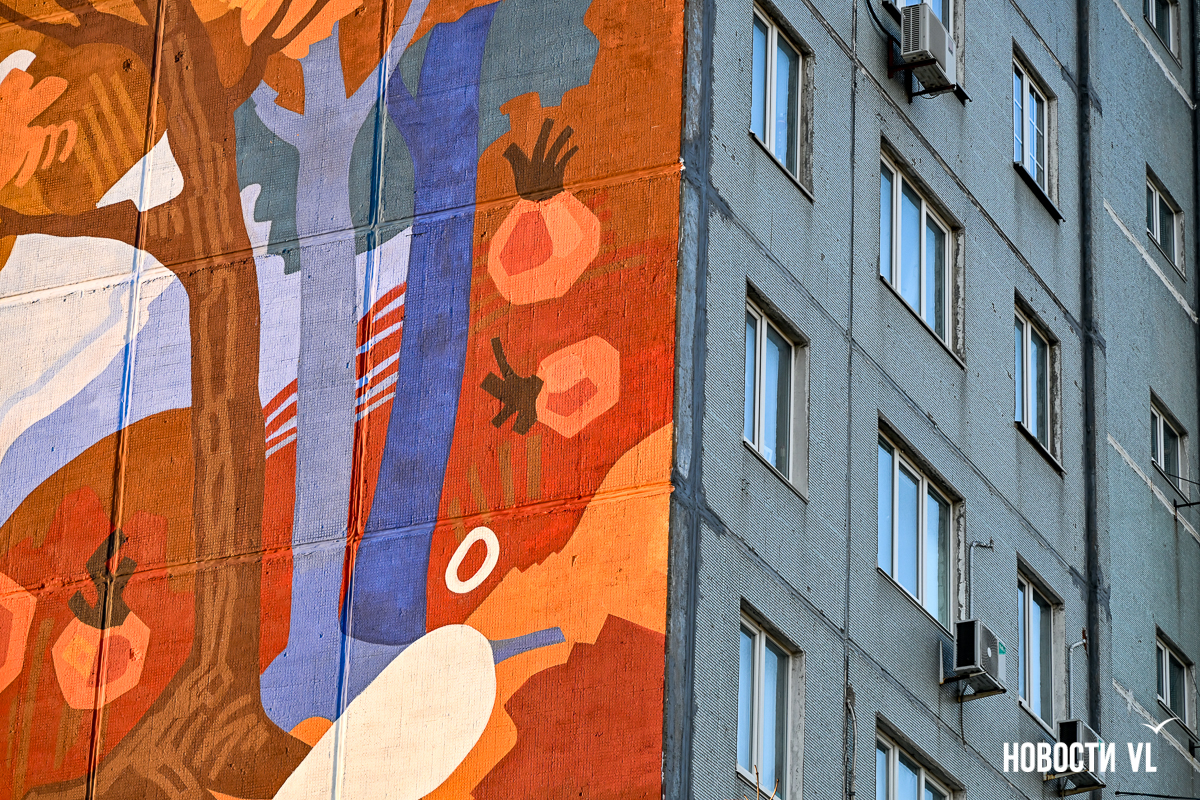 Сезон муралов во Владивостоке не закончен: ещё один появился на Чуркине, на торце десятиэтажки по улице Надибаидзе. Он интересен и сам по себе, и тем, что его выполнил архитектор – ведь обычно это делают художники. С этой своей первой работой автор сумел победить в городском конкурсе муралов.