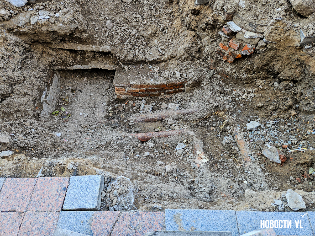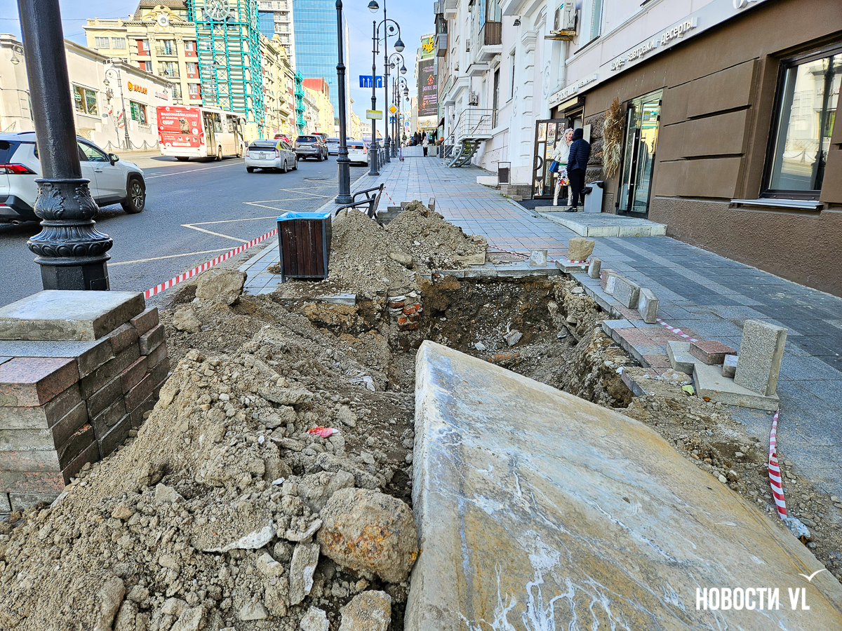 Яму вырыли прямо под знаком остановки «Океанский проспект». Вокруг лежат кучи грунта и стопки тротуарной плитки. Сами раскопки огородили красно-белой лентой – её зацепили за лавочку остановки, фонарный столб и плиточный «Стоунхендж» вдоль ямы. Широкий на этом участке тротуар заметно сузился – в часы пик горожанам приходится задевать друг друга плечами, обходя раскопки.