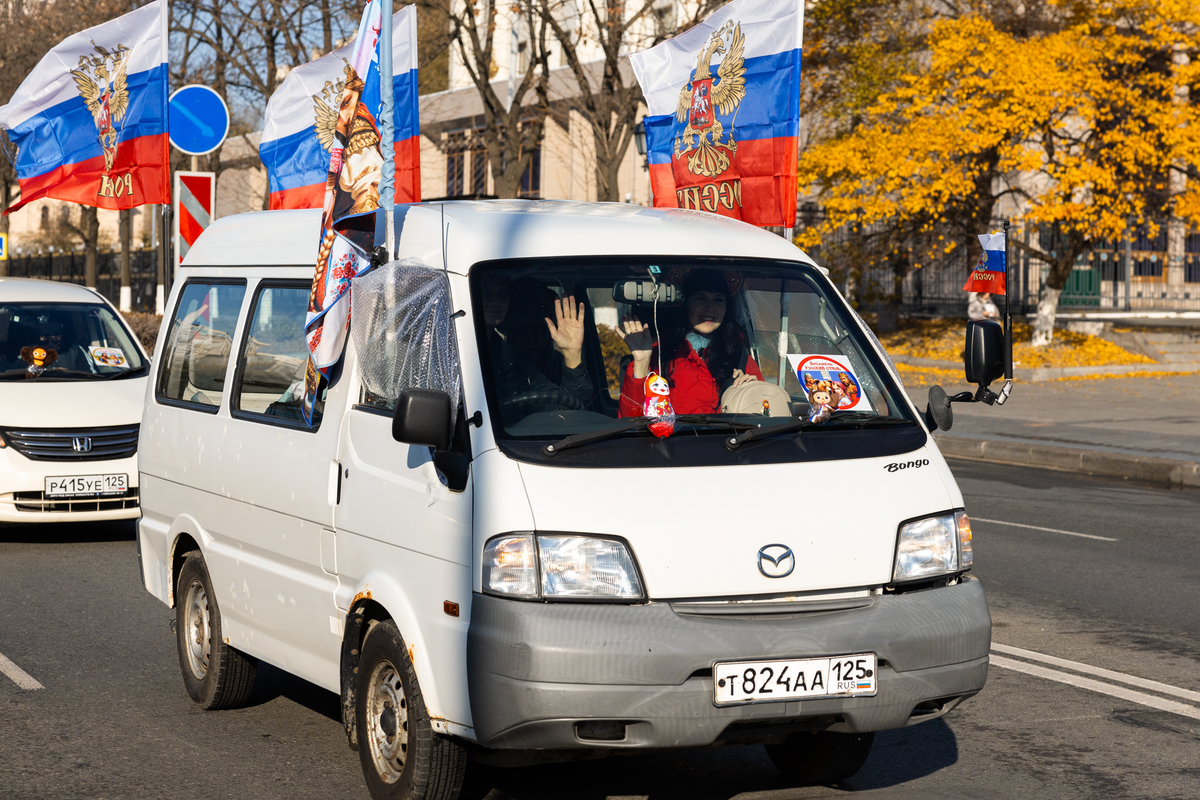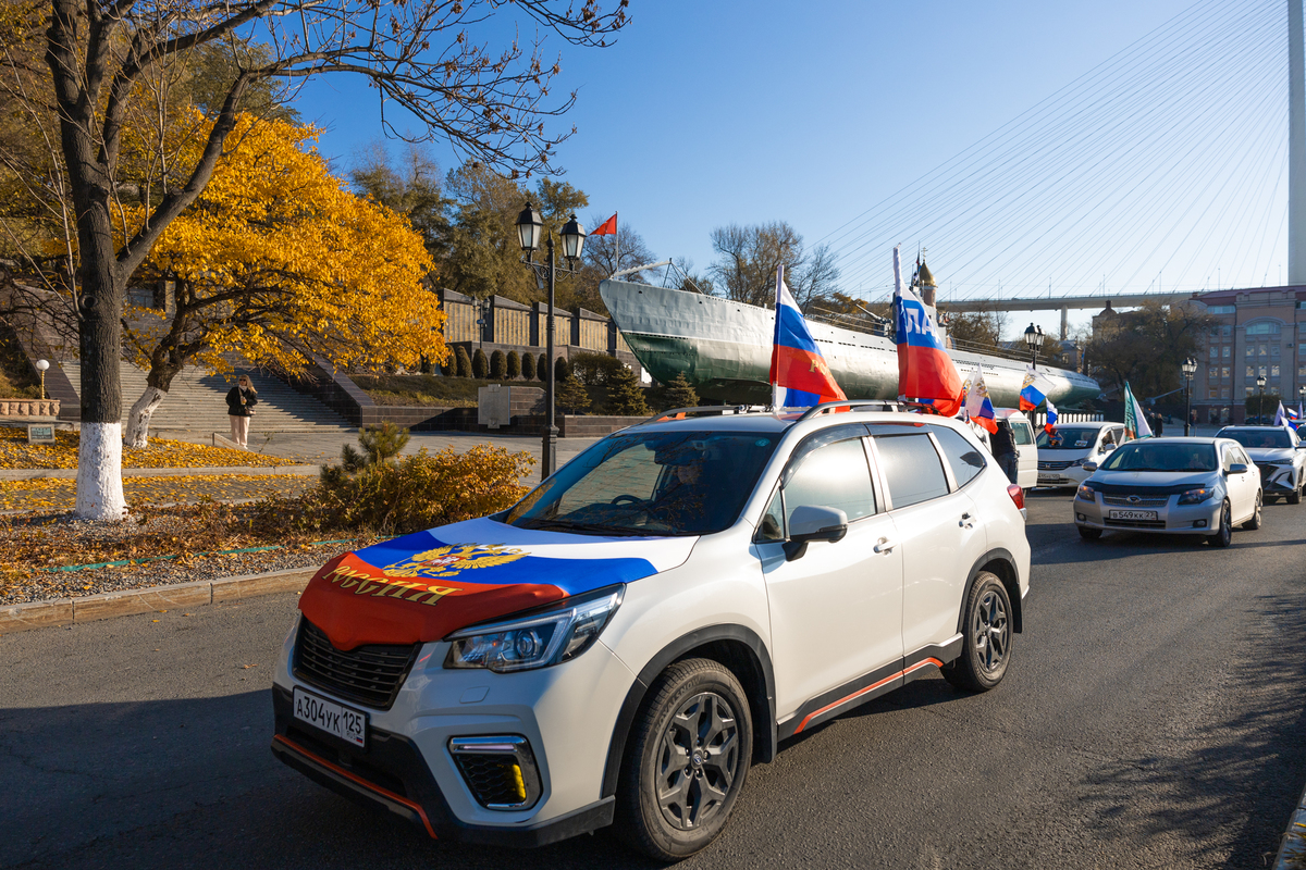 Сегодня, 4 ноября, во Владивостоке стартовал автопробег по случаю Дня народного единства. Два десятка автомобилей, украшенные флагами, двинулись колонной от мемориала Боевая слава Тихоокеанского флота и направились на Русский остров.