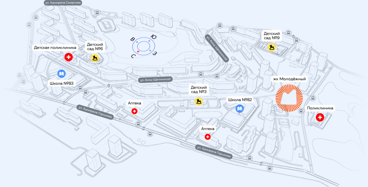 А поблизости располагается всё, что нужно для жизни. Особенно важно семьям с детьми, что буквально в 3 минутах от дома находятся несколько школ, детских садов, а также учреждения дополнительного образования.