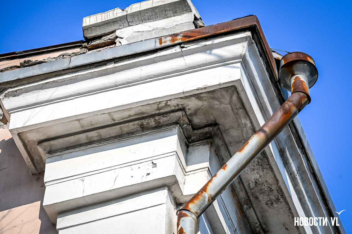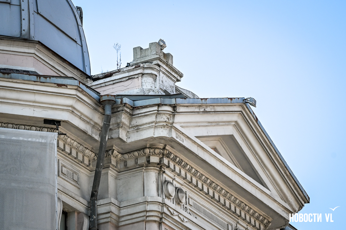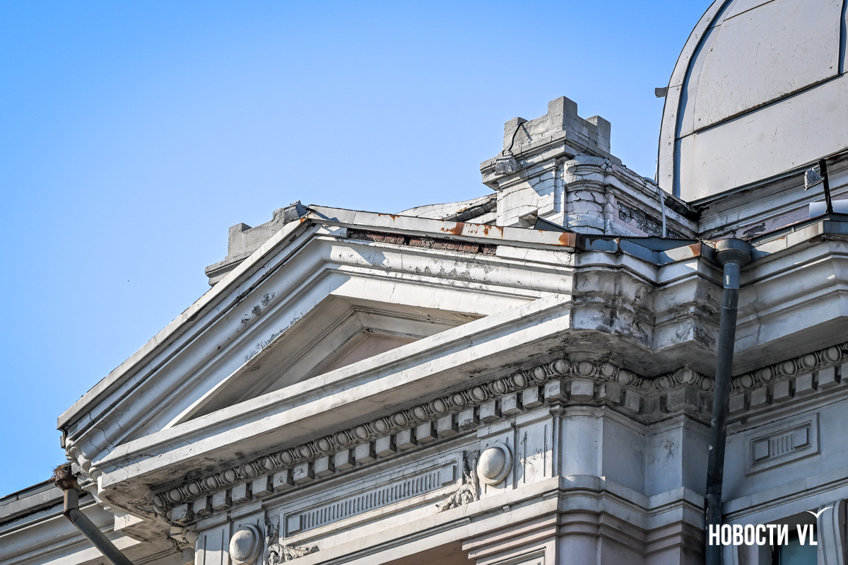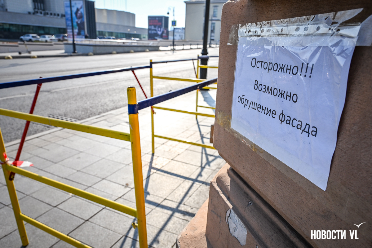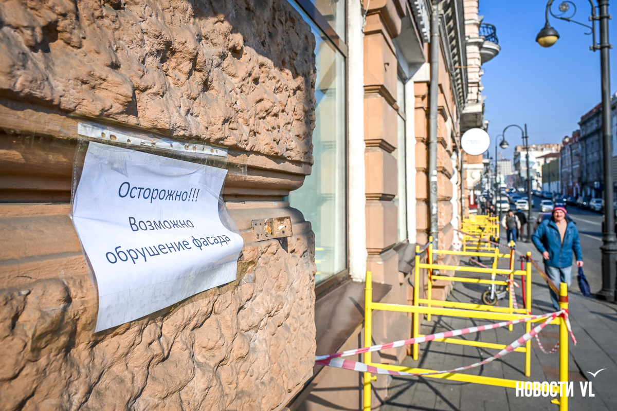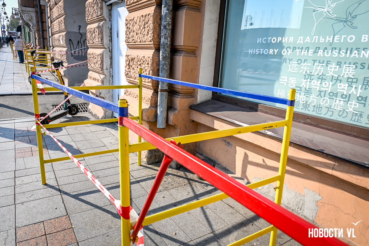 В конце прошлой недели жители Владивостока обратили внимание на то, что около главного корпуса музея им. Арсеньева на Светланской и соседних зданий на Алеутской огородили часть тротуара и повесили предупреждающие таблички о возможном обрушении фасада. И действительно – на тротуаре регулярно оказываются кусочки штукатурки, пока что мелкие. В пресс-службе Музея-заповедника истории Дальнего Востока им. В. К. Арсеньева уточнили, что сейчас готовится реставрация всех трёх зданий – уже проведено их техническое обследование. После улаживания всех формальностей и выделения финансирования реставрировать будут и фасады, и крыши.