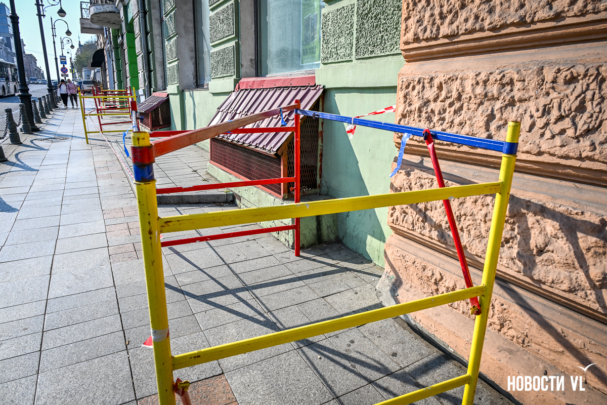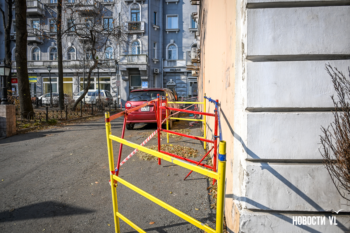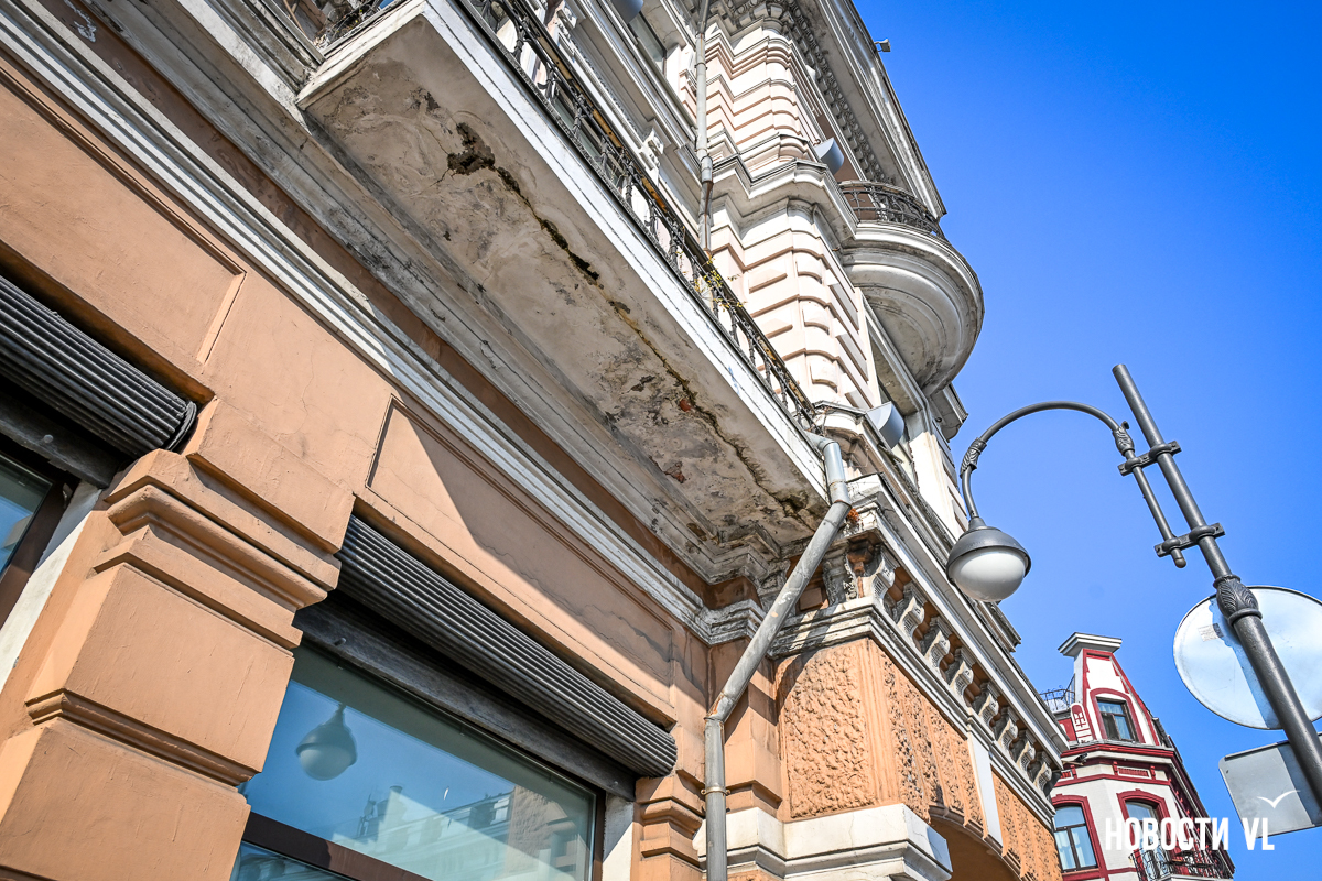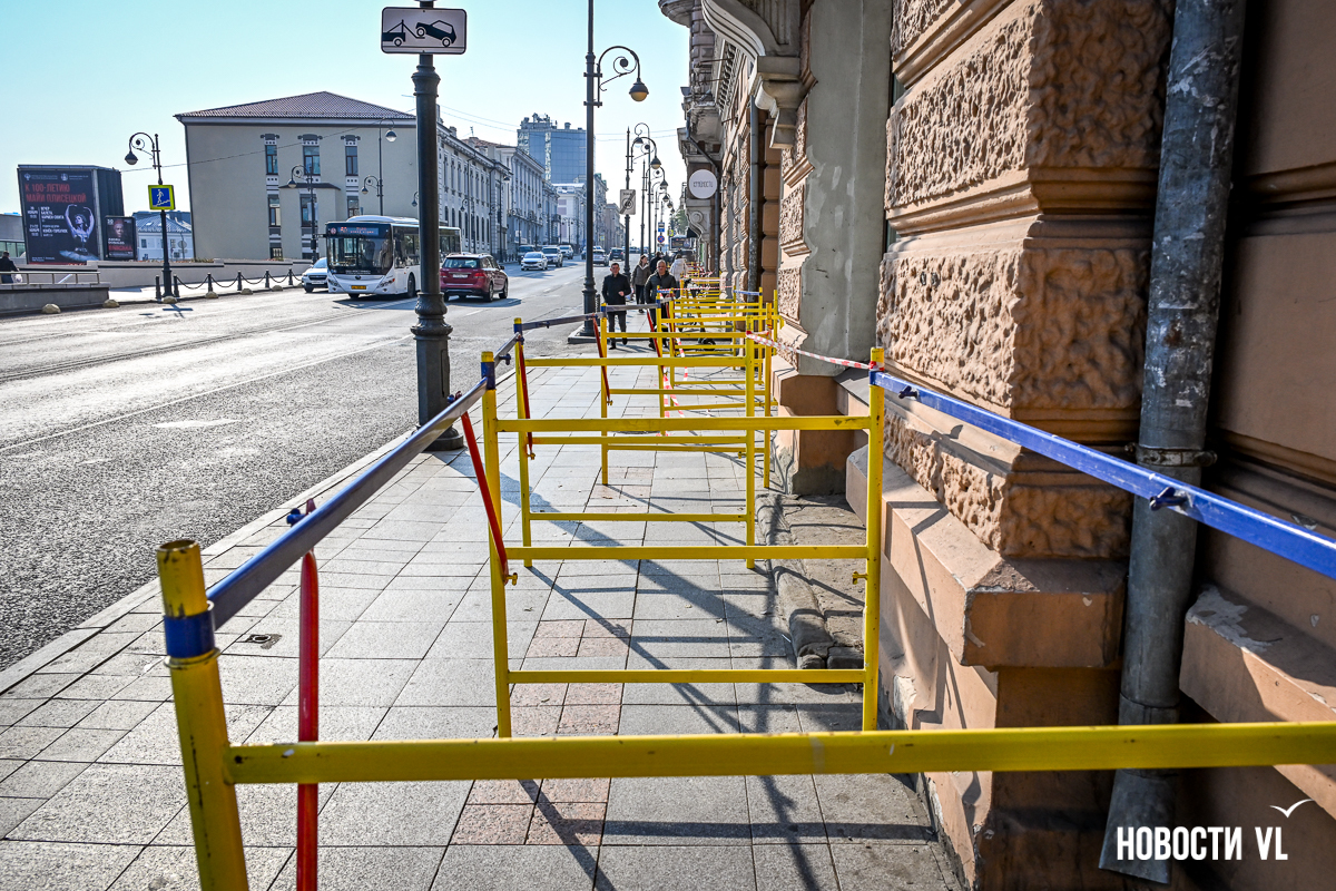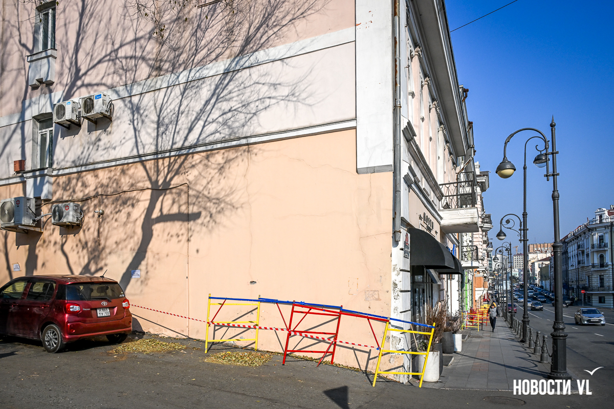 Металлические леса с привязанными к ним бело-красными сигнальными лентами установлены со стороны Алеутской, они занимают больше метра тротуара и существенно заужают проход. Конструкции установлены и у главного корпуса (Светланская, 20), и у соседних зданий (Алеутская, 21 и 23), в которых на первых этажах работают кафе и магазины. Невооружённым глазом видно, от чего ограждают такие конструкции. На всех трёх зданиях глубокие трещины в штукатурке под балконными плитами и венчающим карнизом (на стыке фасада и кровли). В некоторых местах, как, например, на Алеутской, 21, о чём мы уже писали, скоро могут выпасть кирпичи.