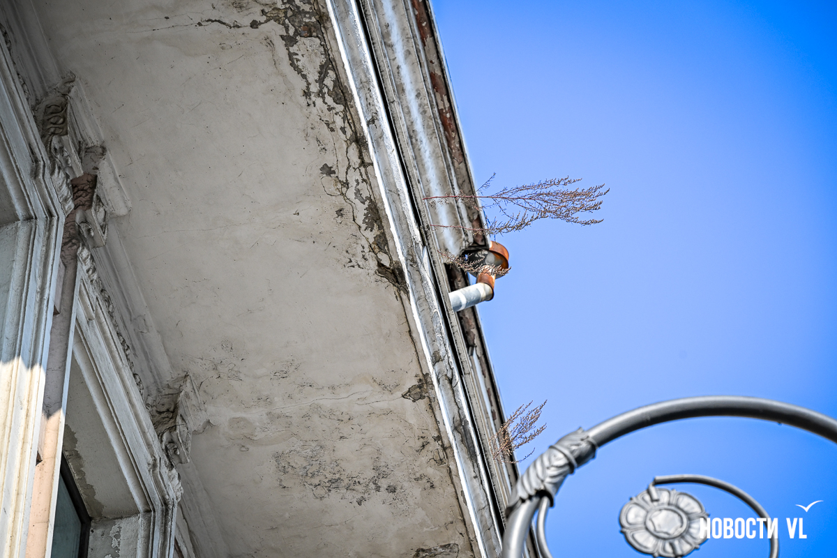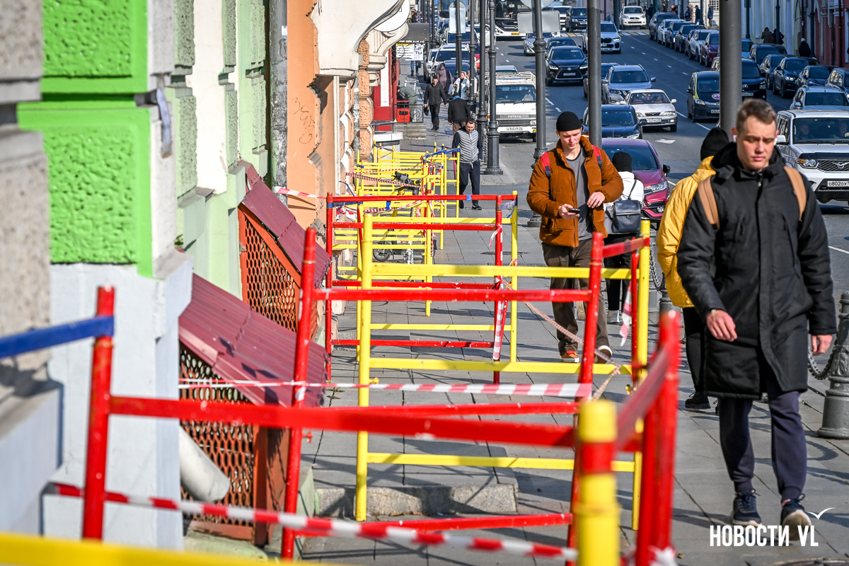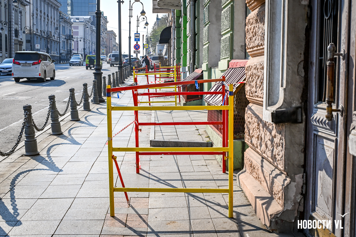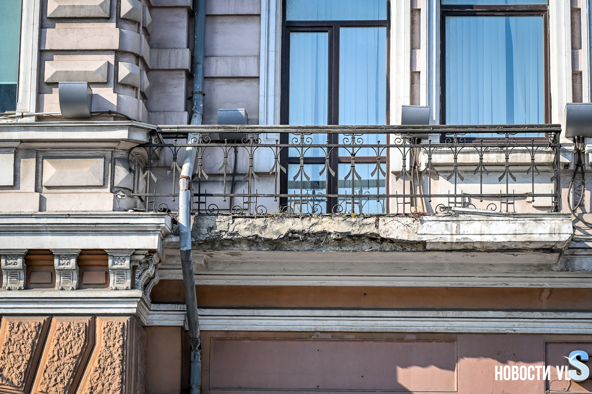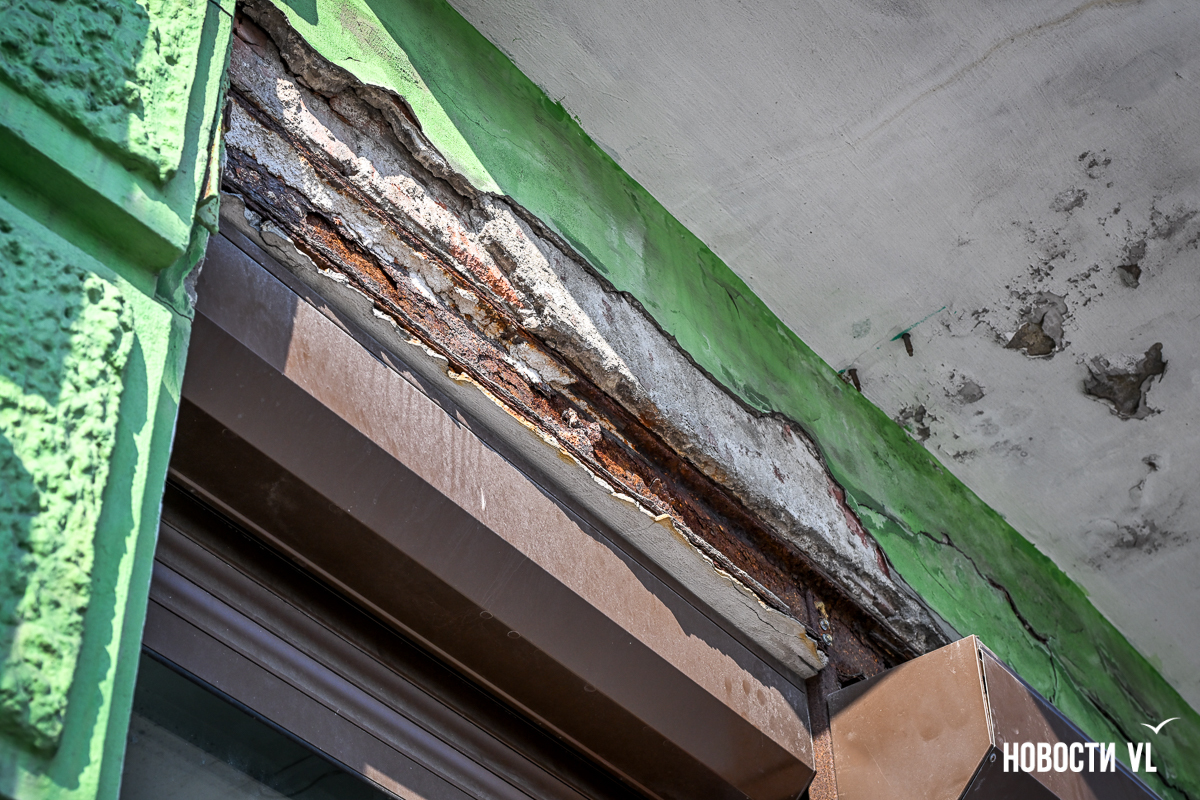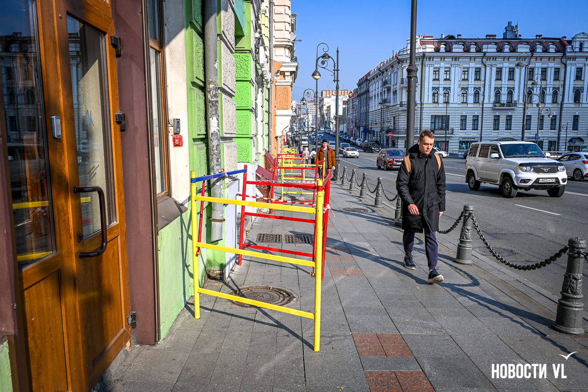 Металлические леса с привязанными к ним бело-красными сигнальными лентами установлены со стороны Алеутской, они занимают больше метра тротуара и существенно заужают проход. Конструкции установлены и у главного корпуса (Светланская, 20), и у соседних зданий (Алеутская, 21 и 23), в которых на первых этажах работают кафе и магазины. Невооружённым глазом видно, от чего ограждают такие конструкции. На всех трёх зданиях глубокие трещины в штукатурке под балконными плитами и венчающим карнизом (на стыке фасада и кровли). В некоторых местах, как, например, на Алеутской, 21, о чём мы уже писали, скоро могут выпасть кирпичи.