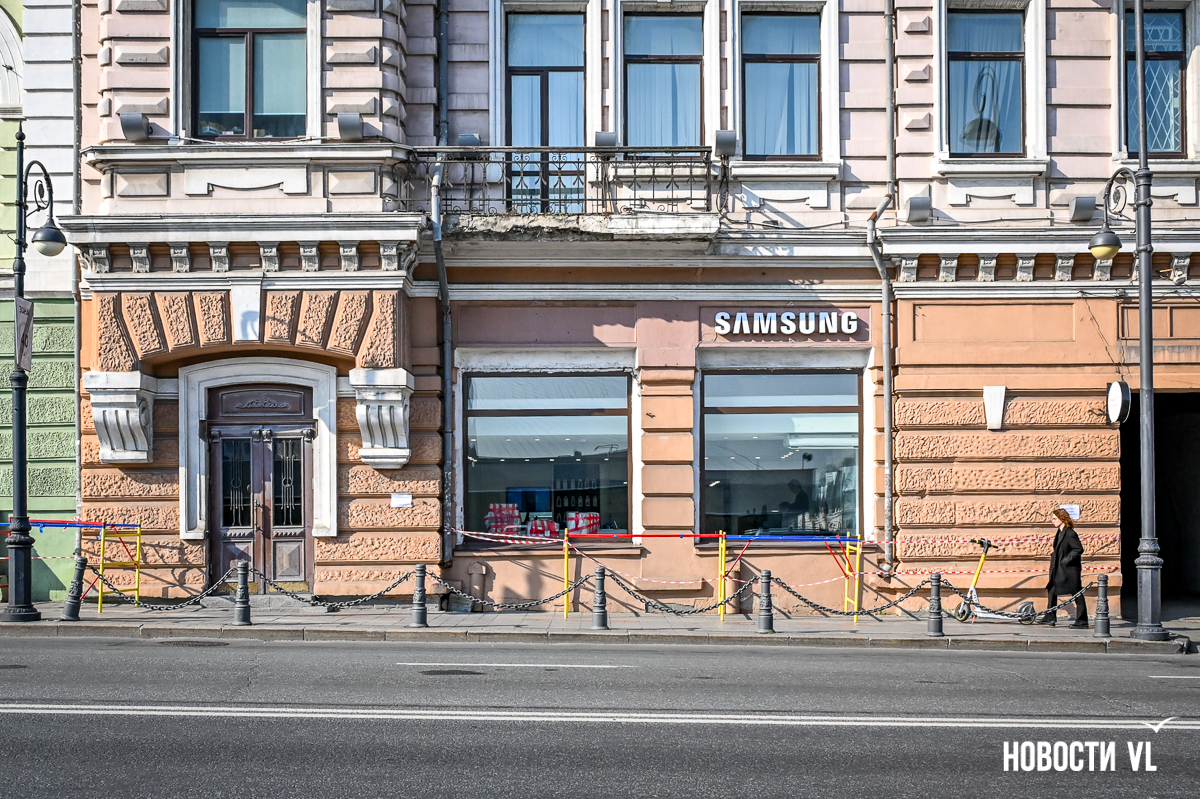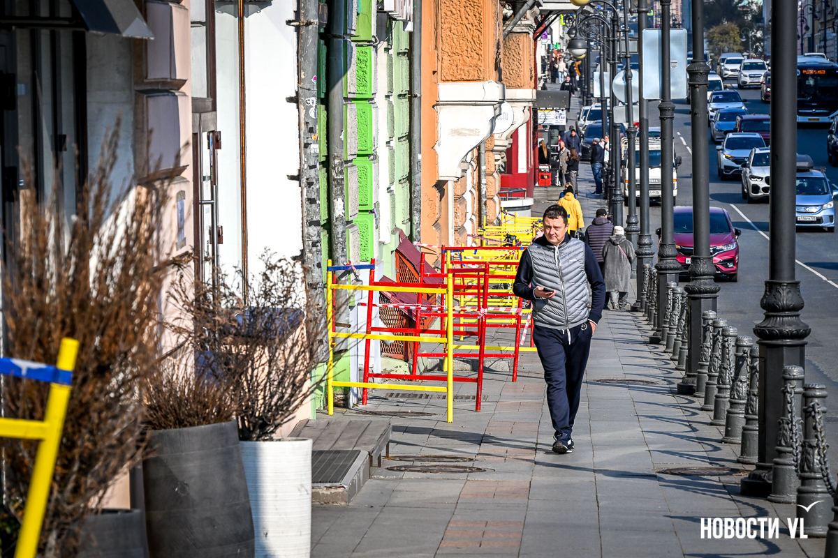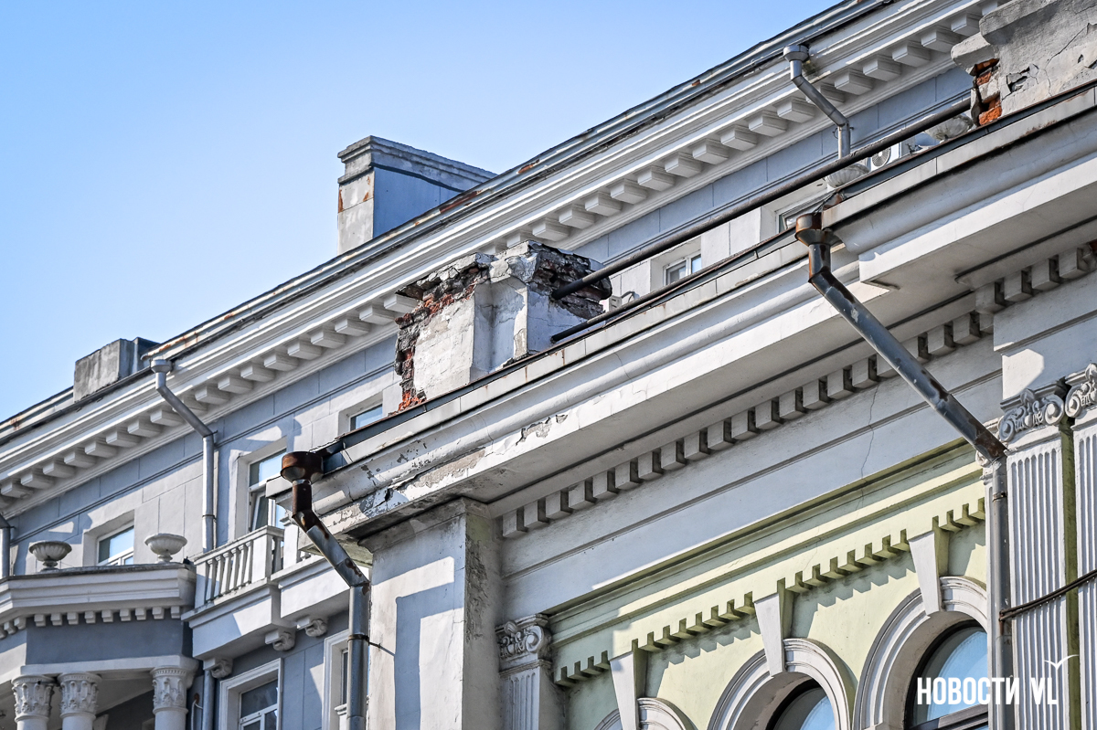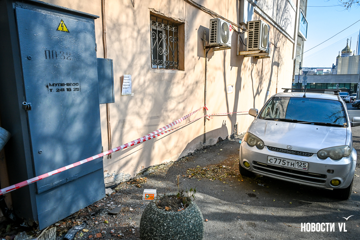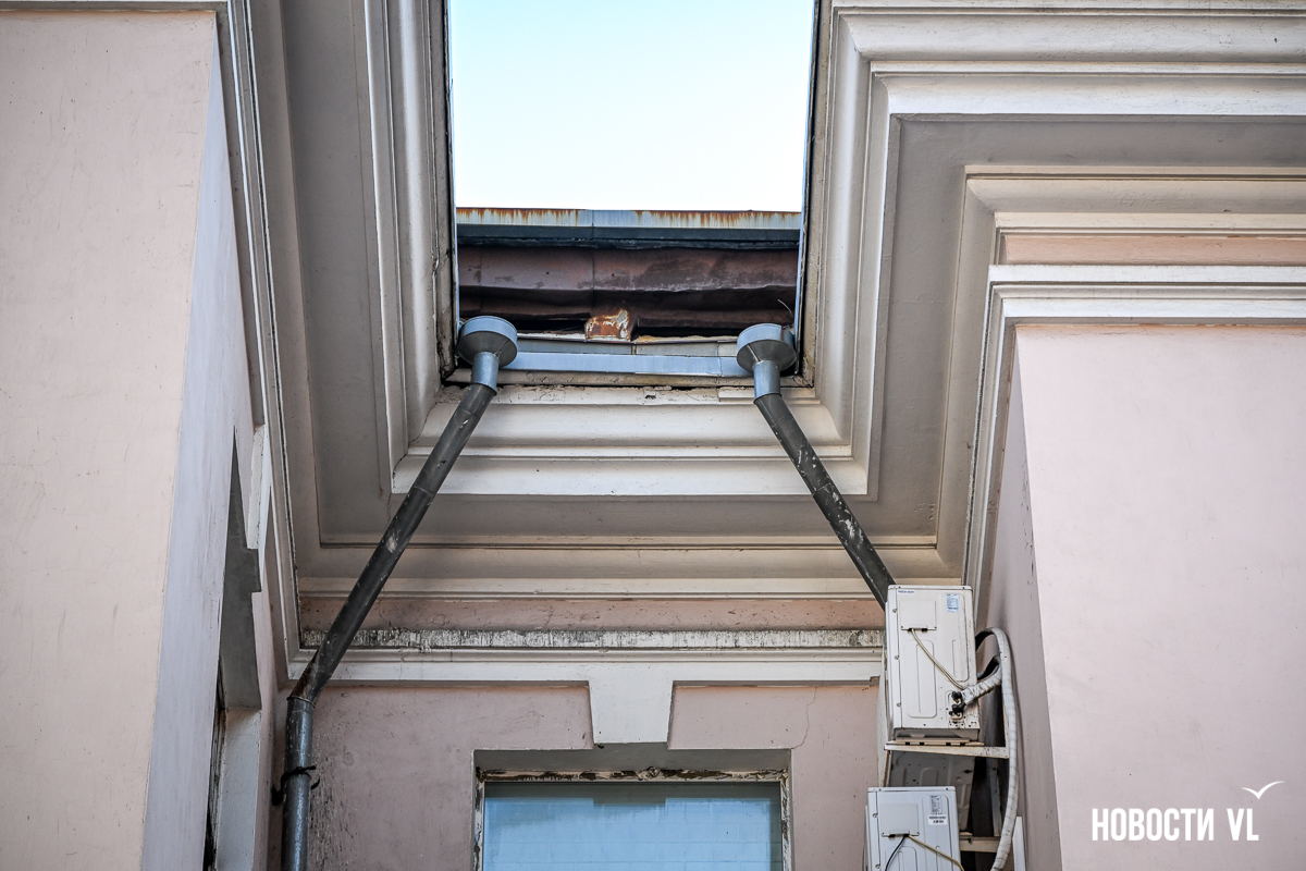 Металлические леса с привязанными к ним бело-красными сигнальными лентами установлены со стороны Алеутской, они занимают больше метра тротуара и существенно заужают проход. Конструкции установлены и у главного корпуса (Светланская, 20), и у соседних зданий (Алеутская, 21 и 23), в которых на первых этажах работают кафе и магазины. Невооружённым глазом видно, от чего ограждают такие конструкции. На всех трёх зданиях глубокие трещины в штукатурке под балконными плитами и венчающим карнизом (на стыке фасада и кровли). В некоторых местах, как, например, на Алеутской, 21, о чём мы уже писали, скоро могут выпасть кирпичи.