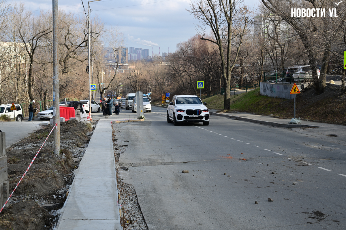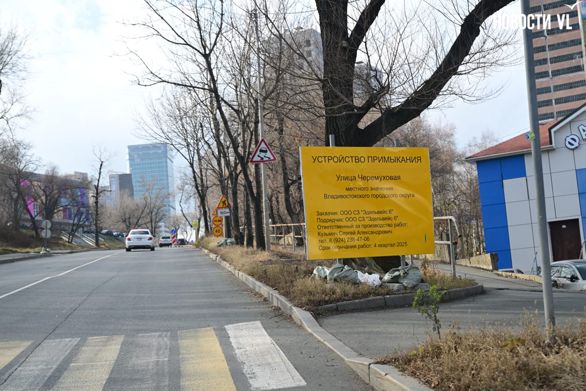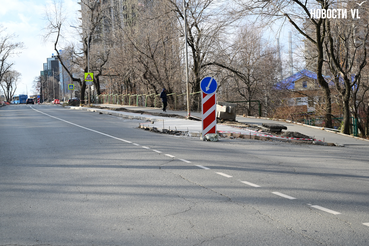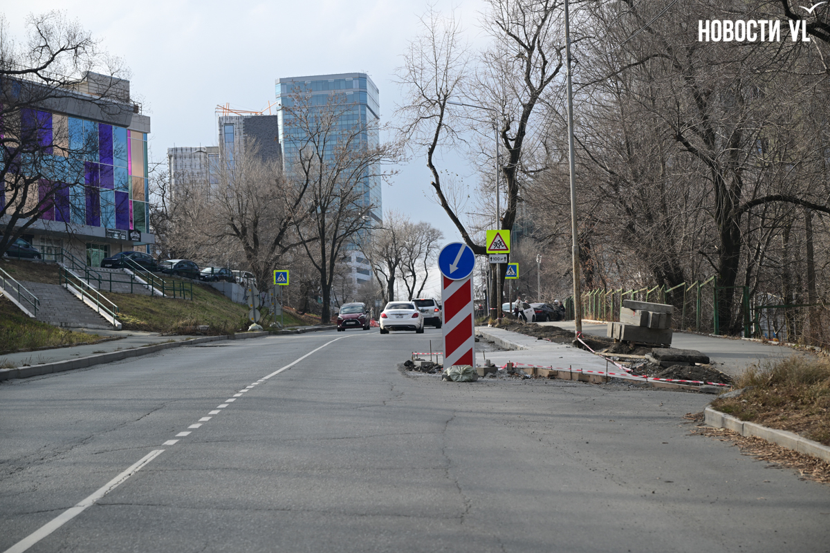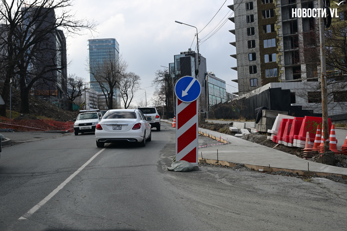 Рядом с жилым комплексом «Эдельвейс Золотой Рог» на Черёмуховой сужают дорогу до «нормативов». Это по одной полосе в каждую сторону шириной от 3,3 до 3,5 метра. За счёт проезжей части и газона здесь обустраивают два парковочных кармана на 21 машину. Делается это за средства застройщика.