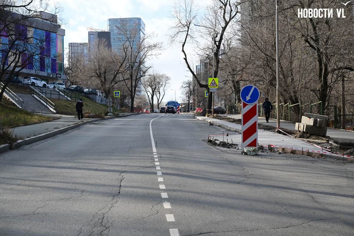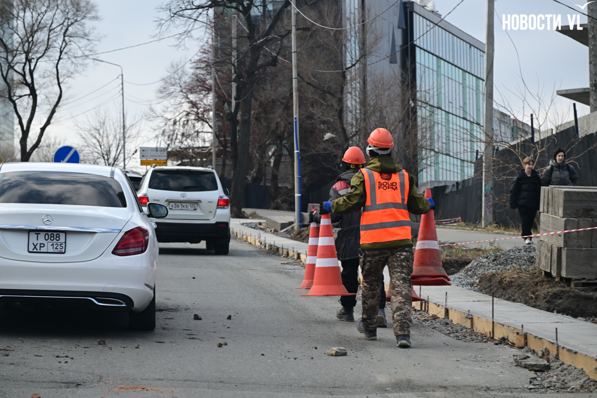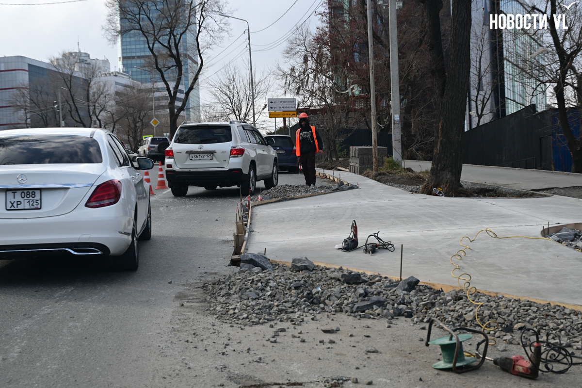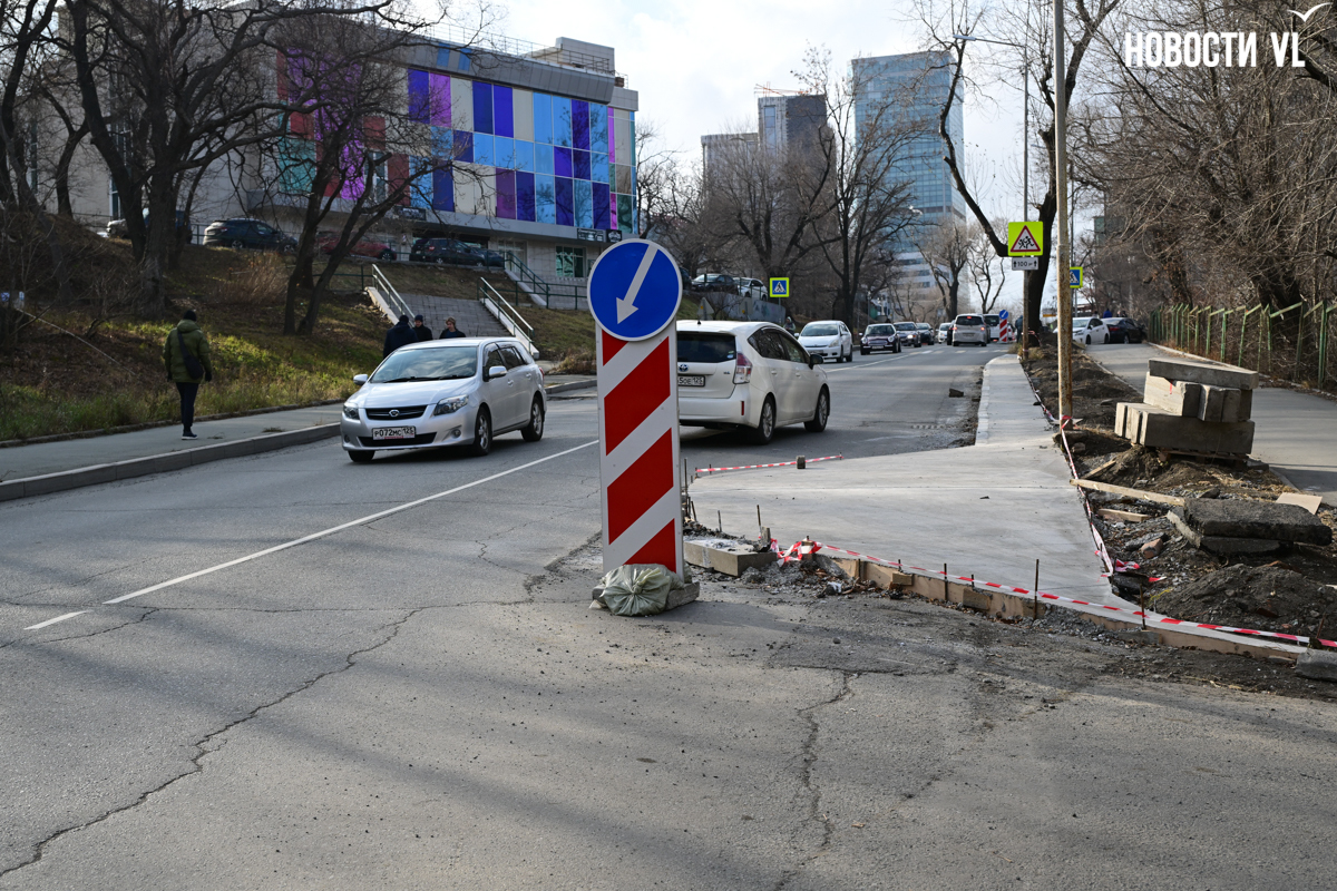 Рядом с жилым комплексом «Эдельвейс Золотой Рог» на Черёмуховой сужают дорогу до «нормативов». Это по одной полосе в каждую сторону шириной от 3,3 до 3,5 метра. За счёт проезжей части и газона здесь обустраивают два парковочных кармана на 21 машину. Делается это за средства застройщика.