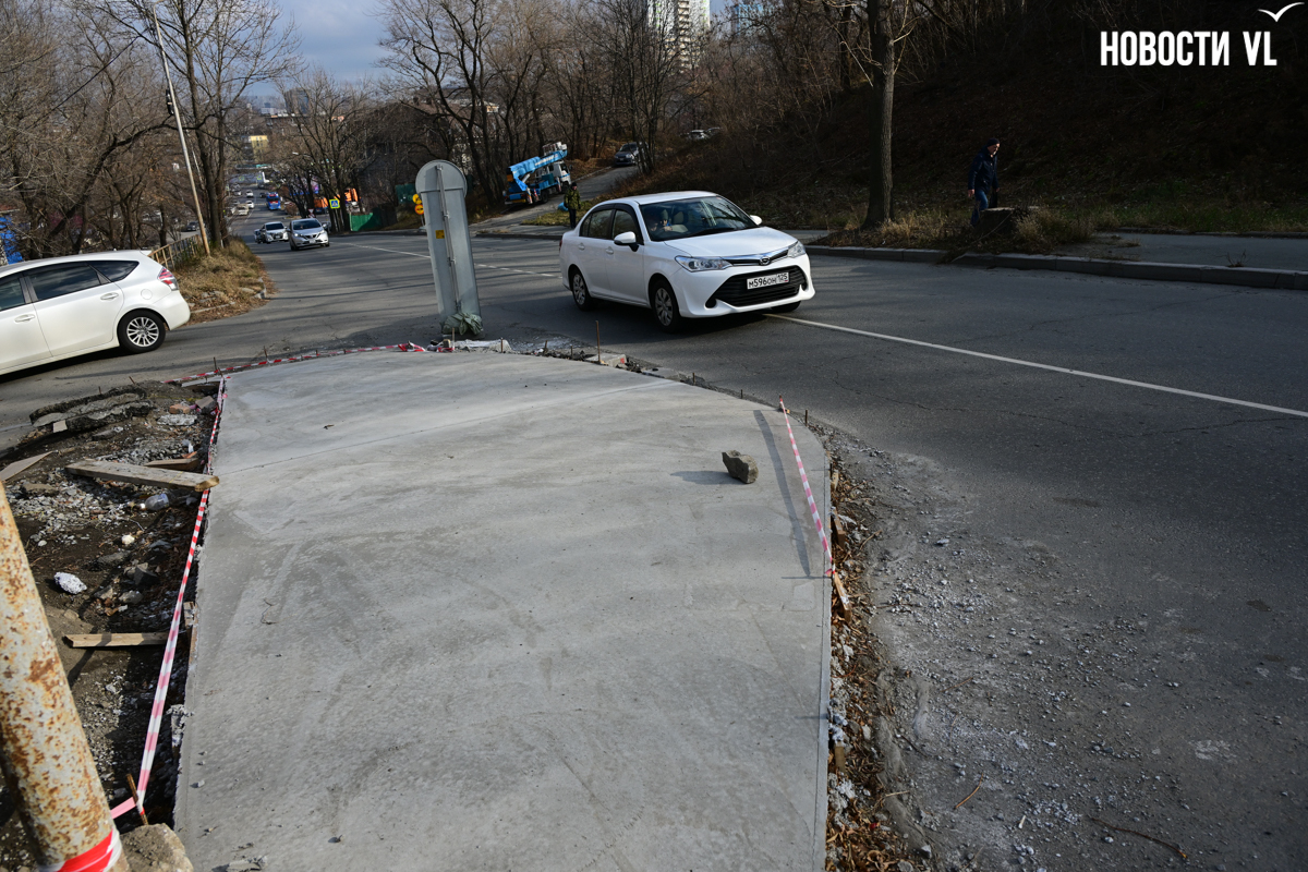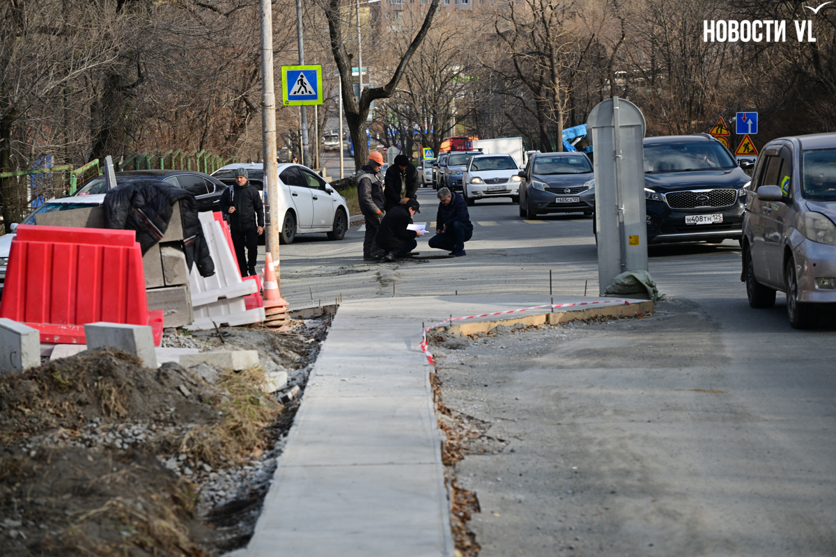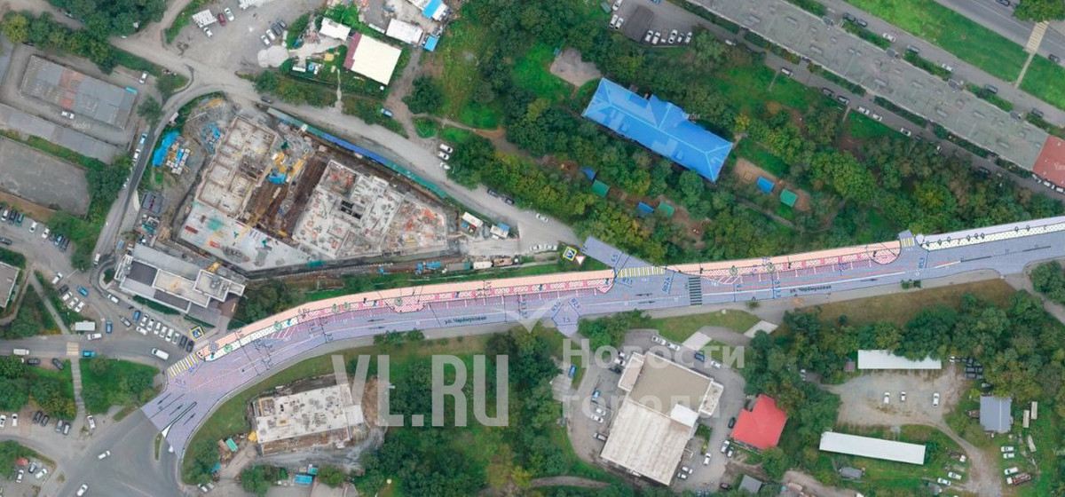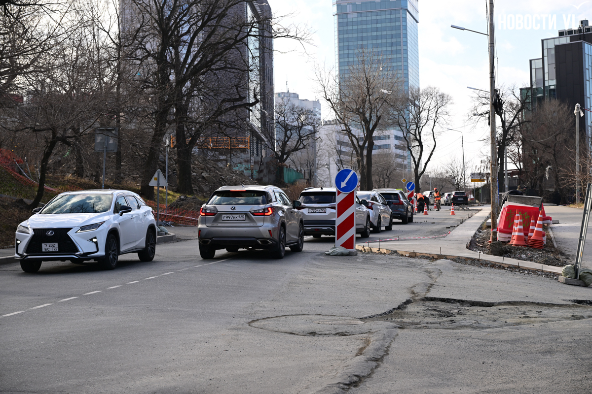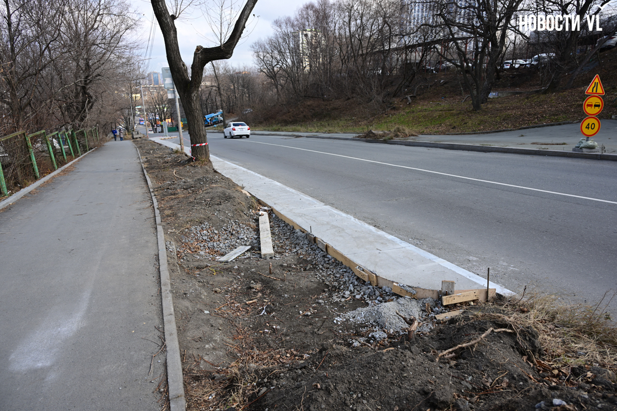 Рядом с жилым комплексом «Эдельвейс Золотой Рог» на Черёмуховой сужают дорогу до «нормативов». Это по одной полосе в каждую сторону шириной от 3,3 до 3,5 метра. За счёт проезжей части и газона здесь обустраивают два парковочных кармана на 21 машину. Делается это за средства застройщика.