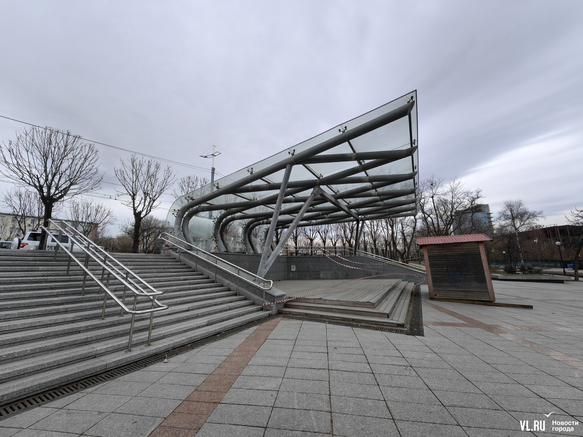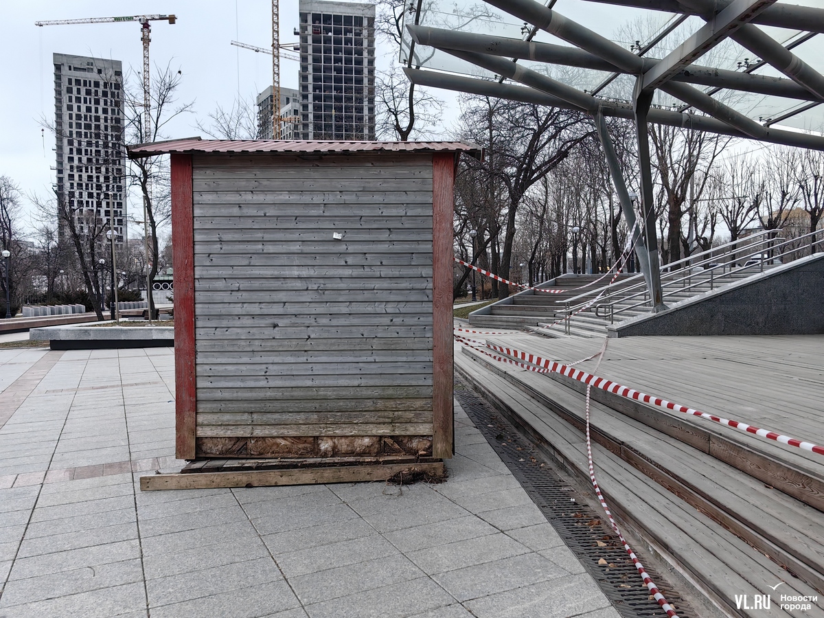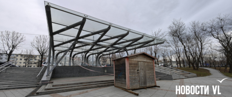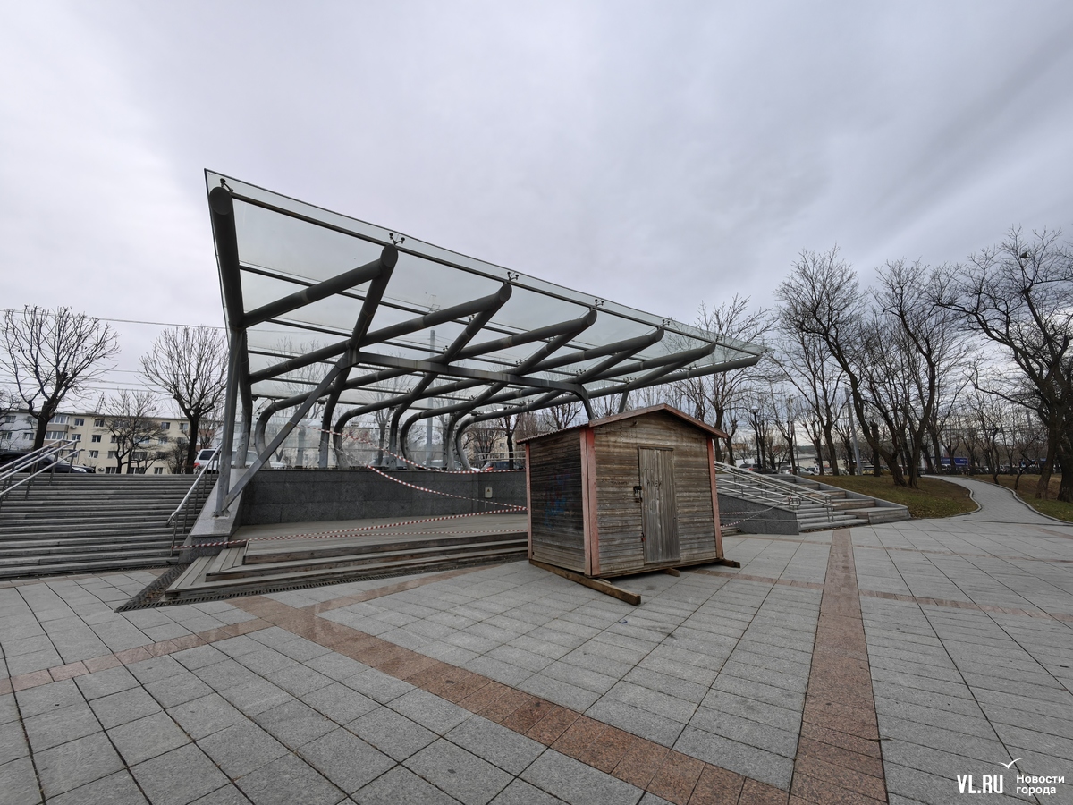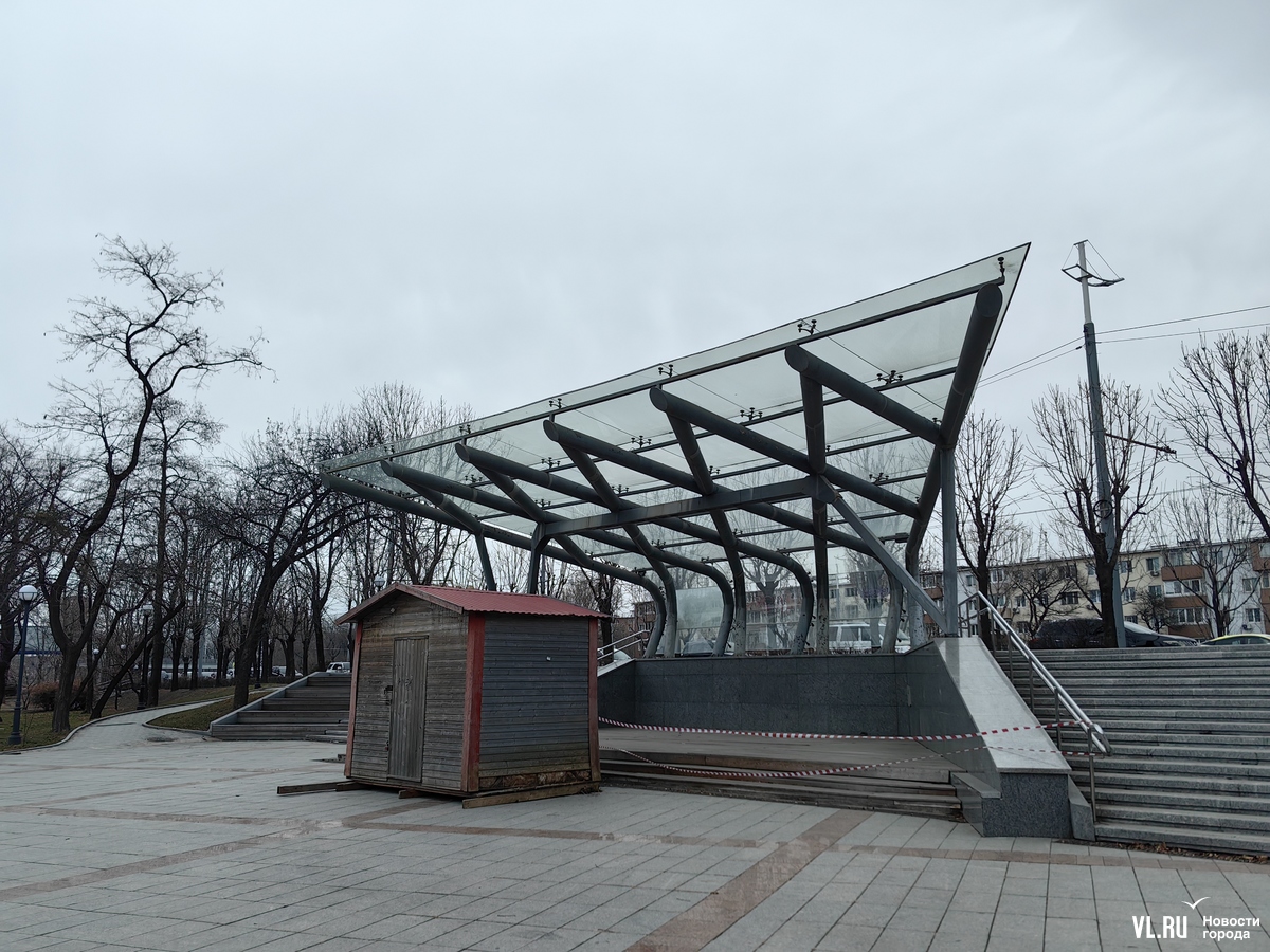 Вчера ремонтно-строительная бригада должна была начать ремонт сцены на площади перед Домом молодёжи, которая является частью парка Победы. Как сообщало МКУ «Зелёный Владивосток», здесь планируется заменить остекление сцены, отремонтировать стойки и гранитные поверхности на прилегающей территории. Работы предполагается делать всю зиму.