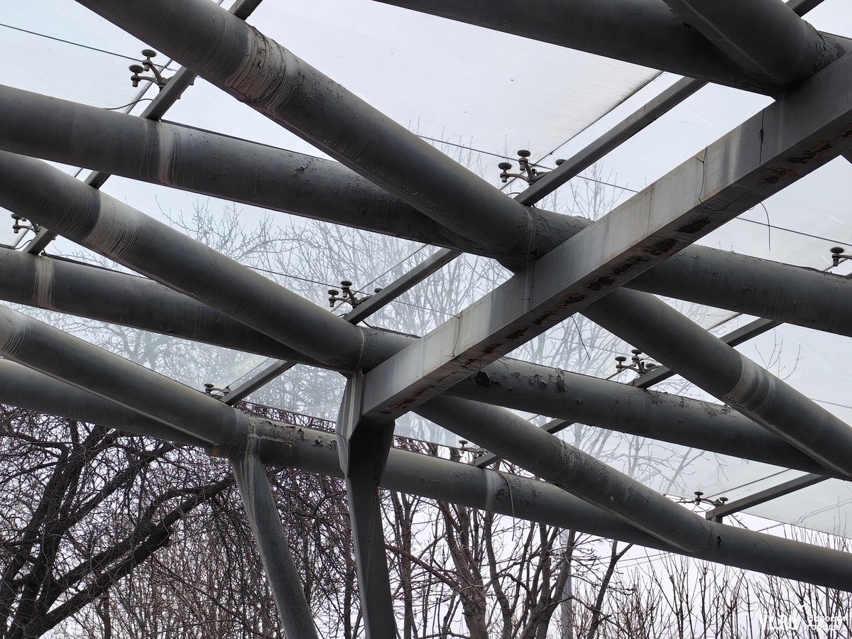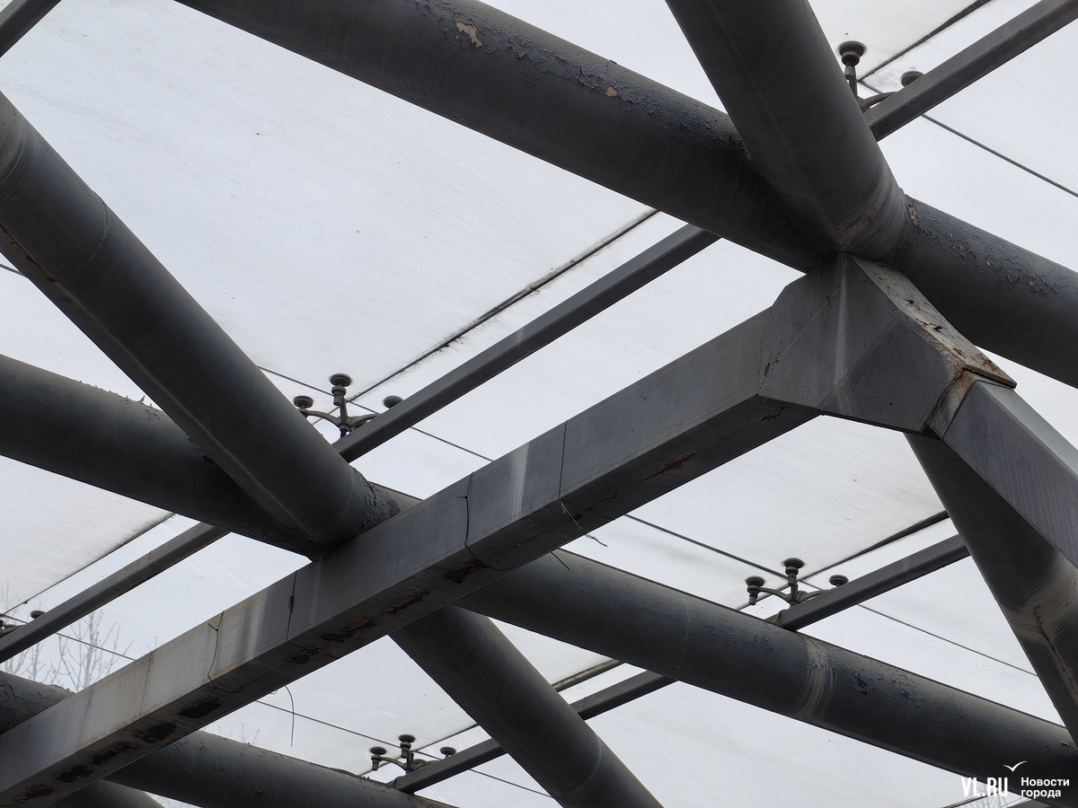 Откровенно говоря, часть гранитных плит на клумбах вокруг действительно нуждается в ремонте, но явно не зимой. Стёкла сцены выглядят больше требующими помывки, а не замены. На стойках видна коррозия и отслаивается краска – но они опять же выглядят гораздо лучше, чем многие конструкции в городе.