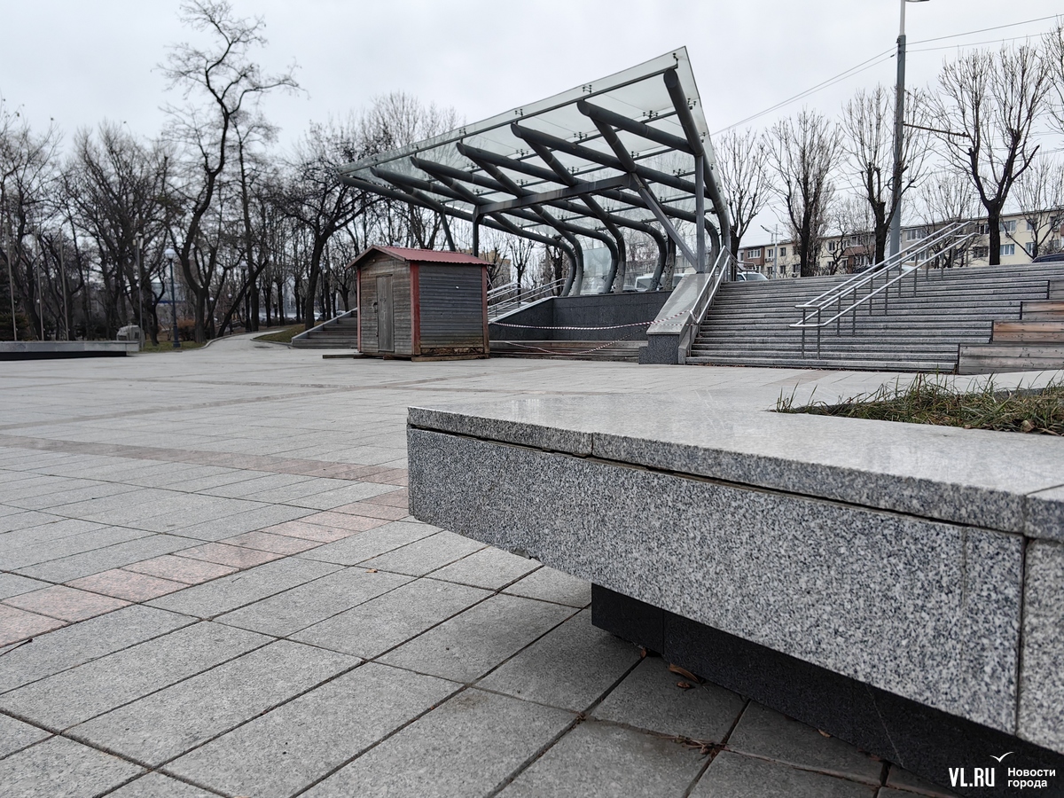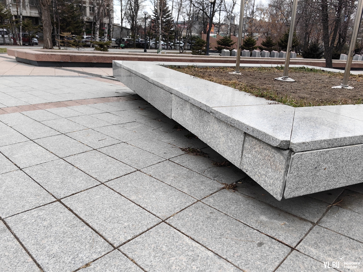 Парк Победы реконструировали в 2015 году, по владивостокским меркам – совсем недавно. Его состояние намного приятнее, чем, например, пешеходной части улицы Фокина, где такая же гранитная плитка отлетела уже у половины клумб (а в нескольких местах её прикрутили на саморезы насквозь). А пешеходный трафик через этот парк в разы меньший, чем через «Арбат».