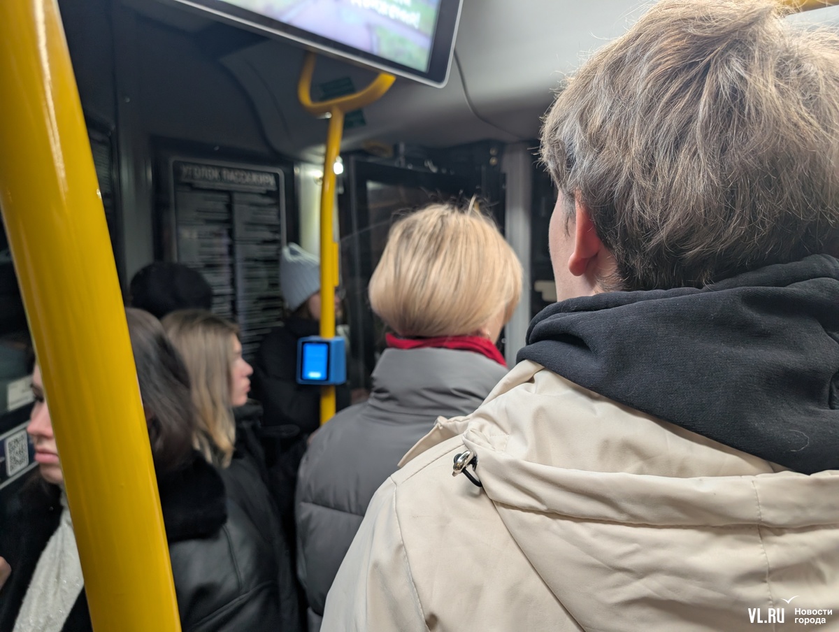 На «Некрасовской» в середине салона уже не протолкнуться, так что на остановке «Владивостокский государственный университет» попасть в середину салона у пассажиров не получается – последние стоячие места занимают неподалёку от водителя.